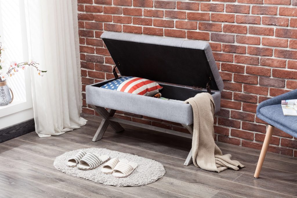 An attractive storage and seating solution, the Angelina Storage Bench immediately adds sophistication to any space. The base of the storage bench is enhanced with cross rubberwood legs for added strength and stability. The Angelina storage bench is designed with a safety hinge that allows you to put in or take out items without suddenly closing. Place this contemporary button-tufted storage bench at the foot of your bed, in an entryway, or along a living room wall to store spare blankets, extra sweaters, or other odds and ends.