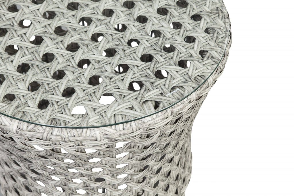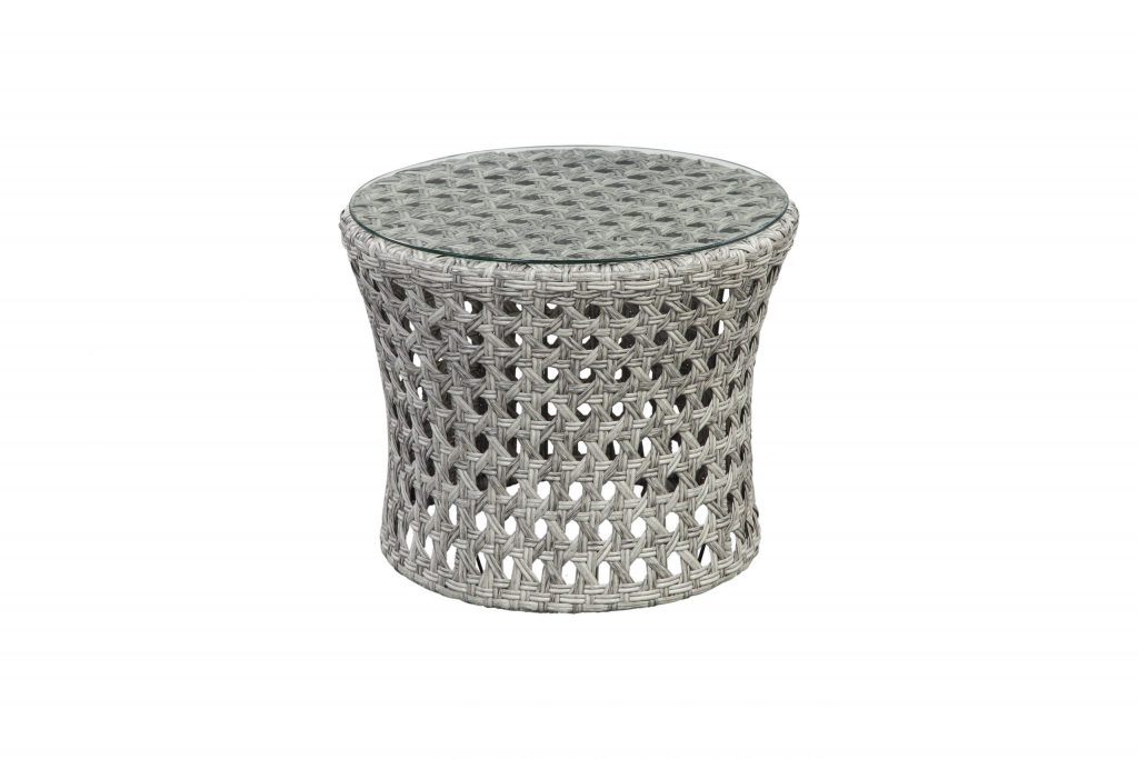 The 3pc Apple Outdoor Conversation Dining Set will fit perfectly in any outdoor setting. The quick dry and durable poly-rattan material will keep you entertaining shortly after any bad weather. Featuring the cats eye weave in a soft neutral Gray hue, this set will compliment any decor. This set includes side table and two chairs