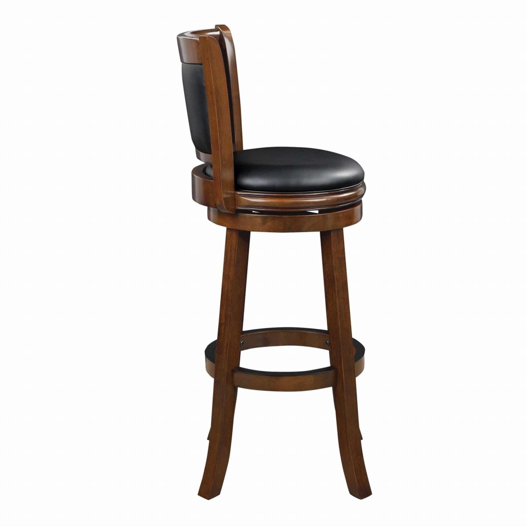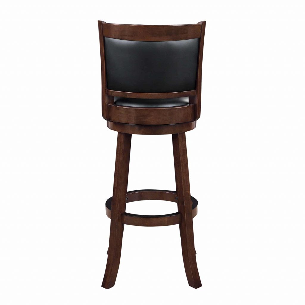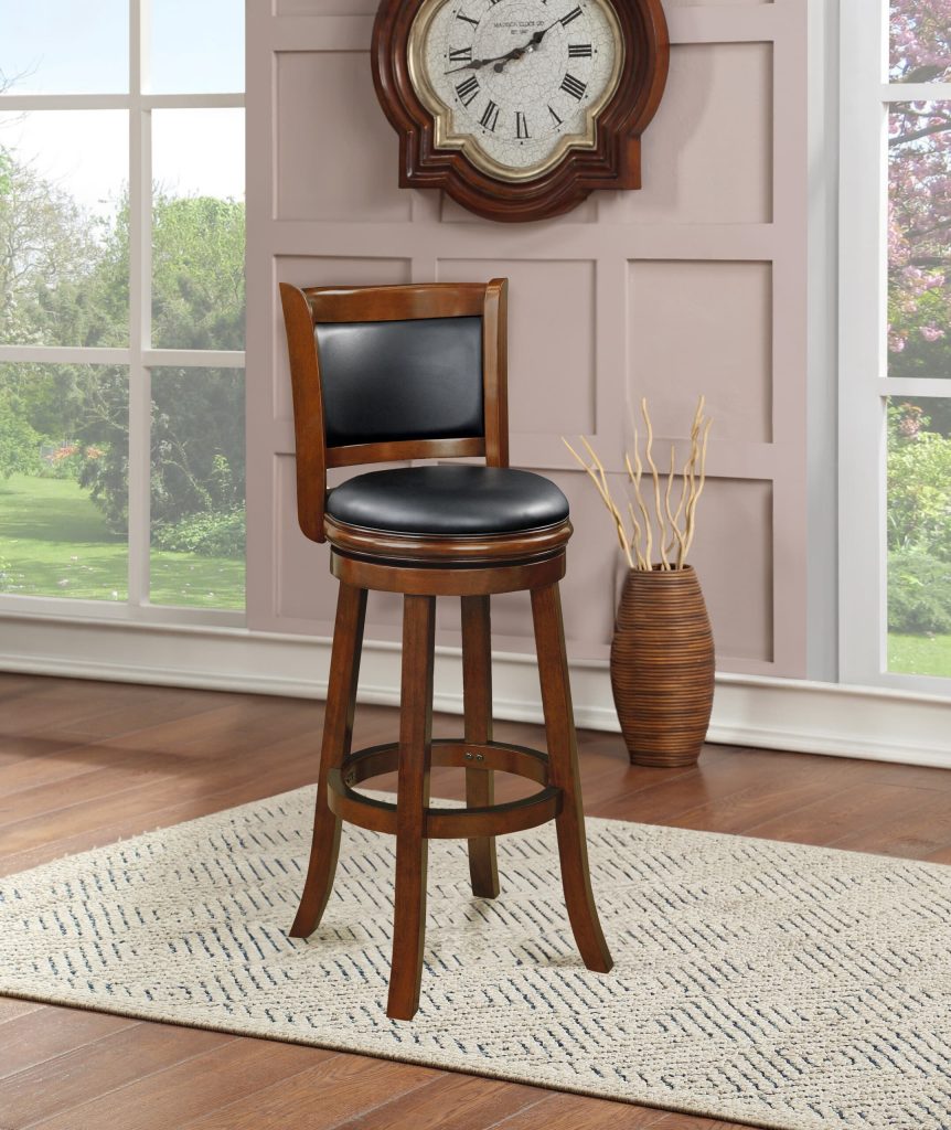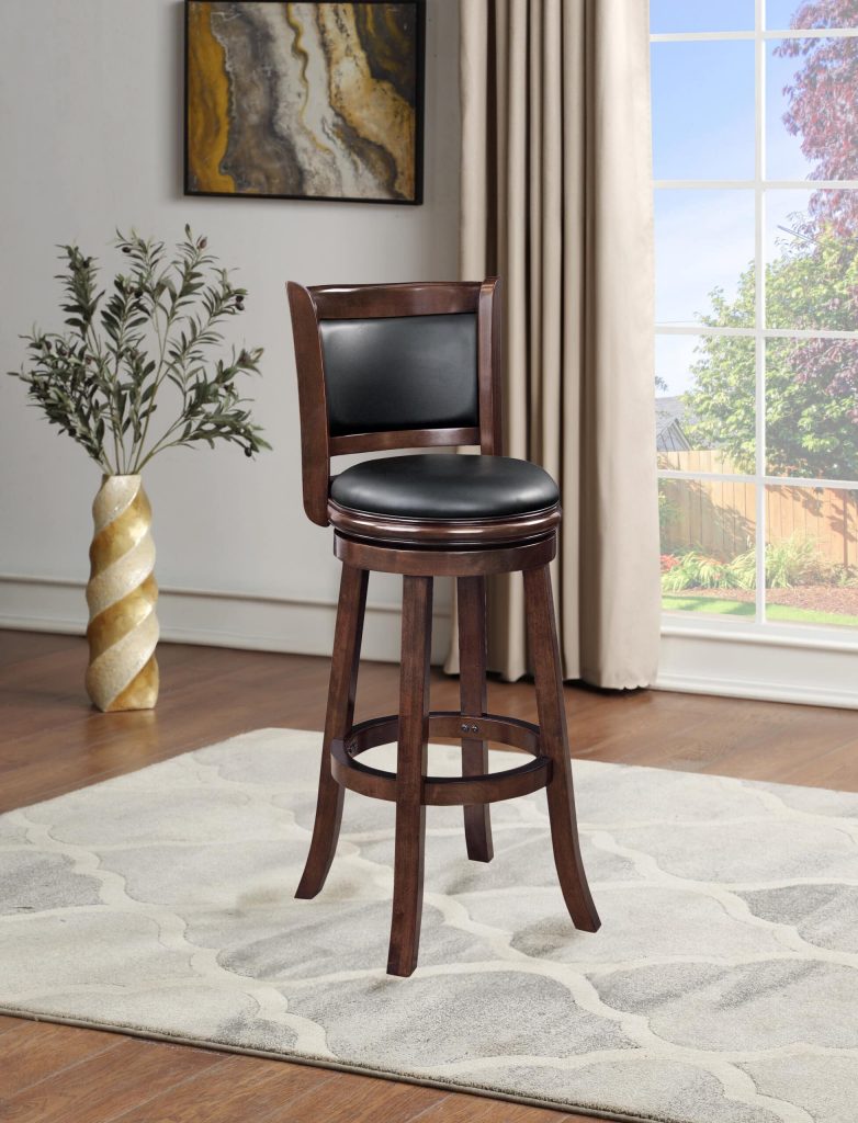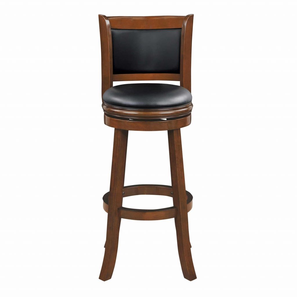 Bring classic style and elevated seating to your home bar or kitchen island with this counter stool. This stool showcases a uniquely designed backrest, a beautifully carved seat apron, flared legs, and faux leather upholstered seat and back to give it a soft touch so you can settle into that long conversation with your friends over a glass of wine. The seat and back are filled with high-density foam and upholstered in warm faux leather for a refined touch, while the rich wire-brush finish highlights the natural grain of the wood. This stool also has a wood footrest that holds up in the busiest of homes. Plus, we love that its armless design means you can slide this stool underneath your countertop when not in use. The smooth glide 360-degree swivel function allows you to change directions with ease, making this your new favorite stool in your home!