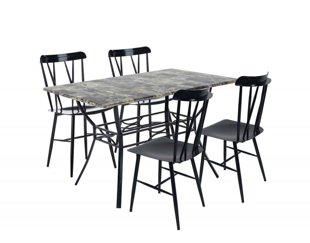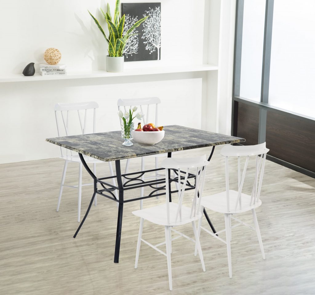 Whether hosting a dinner party with close friends or enjoying an everyday meal with the family, this 5-piece dining set is a must-have for your home. The dining table strikes a rectangular silhouette and is crafted from a black metal frame and a faux marble tabletop. The four metal dining chairs each feature an open double-x style back. The dining table set is suitable for any space in your home. Spend quality time with your family, make life elegant and practical, and enjoy life in this moment.