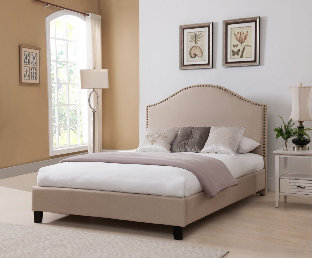 The Beverley bed by Boraam is the perfect choice for a traditional setting with a modern twist. The upholstered headboard with beige fabric features a delicate camelback silhouette with antique brass pins. The Beverley bed is upholstered with 100% polyester, which makes it long lasting. The sturdiness and durability of the bed comes from the solid rubberwood construction of the footboard. The Beverley also is available as a headboard only, and it fits both full and queen size metal bed frames.