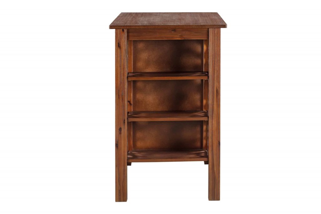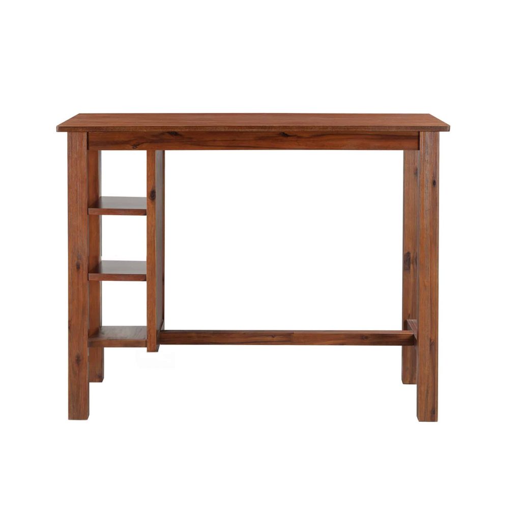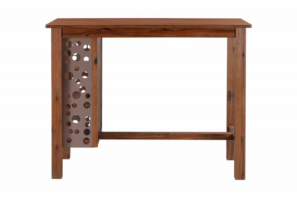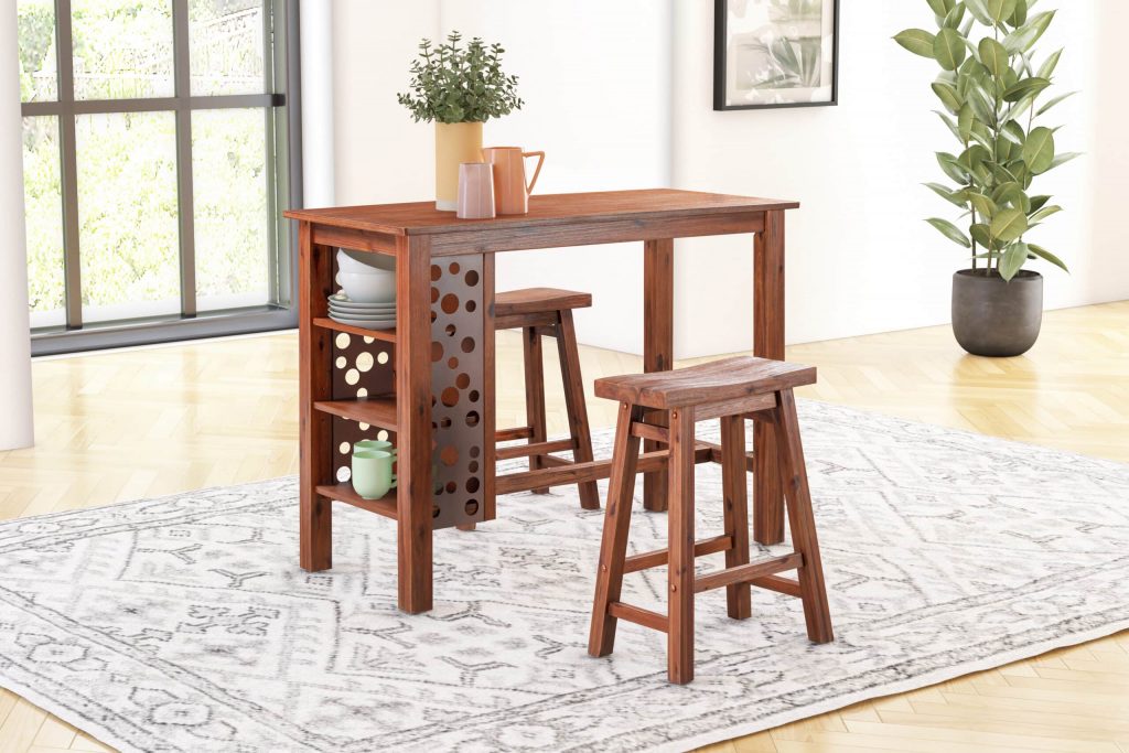 Welcome family and friends to casual after-dinner drinks and easy Sunday brunches around the Brittany 3 piece bar table set. This three-piece set includes everything you need to create a cozy eating nook in the kitchen or dining room space. The bar table is paired with two matching chestnut wire-brush saddle stools. The acacia wood and metal dining table feature a multistep wire-brush finish which enhances the natural beauty of the wood even more. This multi-function dining table also features 3-tiered bookshelves surrounded by decorative steel accents to display cookbooks, decorative accessories and more. The Brittany 3pc bar table set comes in your choice of dining or bar height options. Both options are available in Chestnut Wire-Brush Finish.