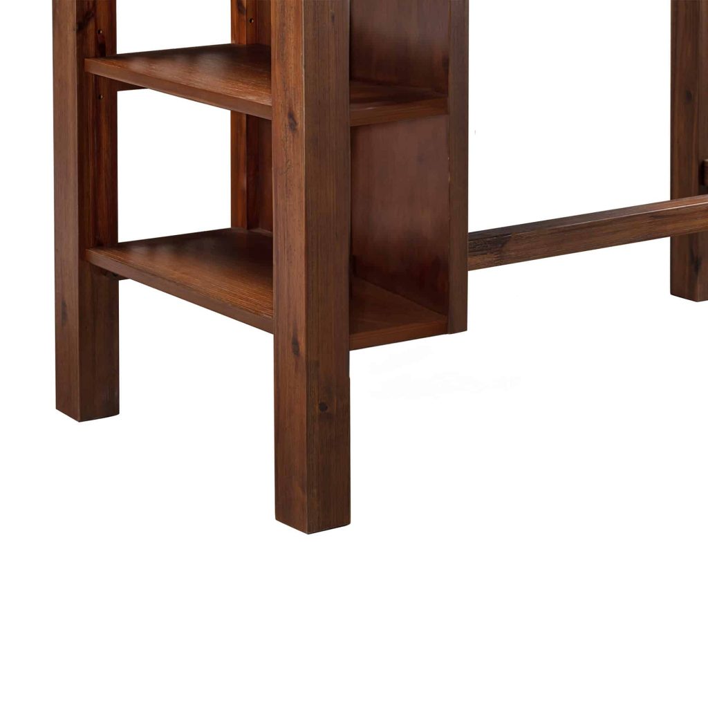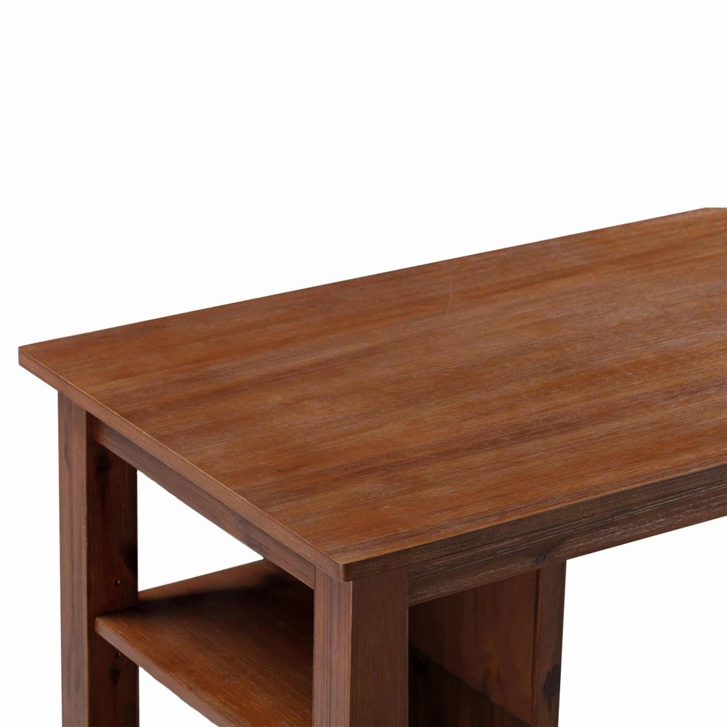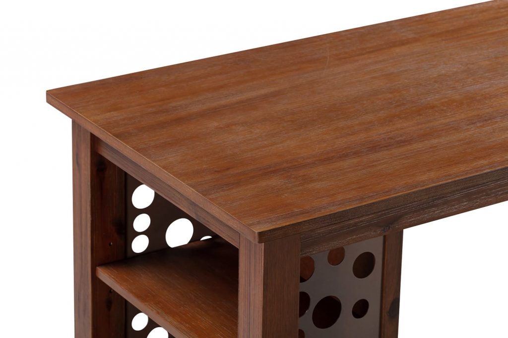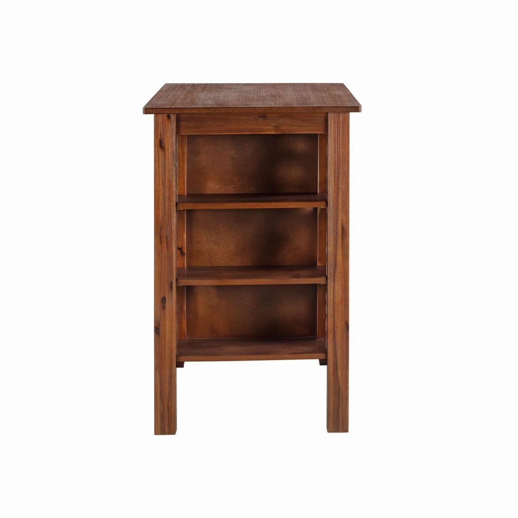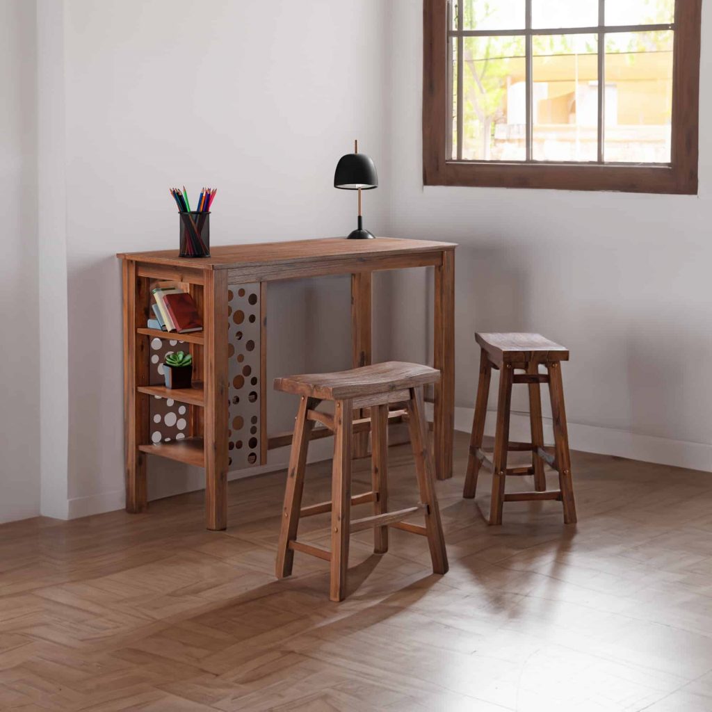 Versatility and rugged charm go hand-in-hand with our Brittany rectangular bar table with storage shelves. The acacia wood and metal dining table feature a multistep wire-brush finish which enhances the natural beauty of the wood even more. This multi-function bar table also features 3-tiered bookshelves surrounded by decorative metal accents to display cookbooks, decorative accessories and more. However, you choose to use this functional piece, make it yours by adding four of your favorite stools (like the Boraam Sonoma Saddle Stools – sold separately). The Brittany bar table comes in your choice of dining or bar height options. Both options are available in Chestnut Wire-Brush Finish.