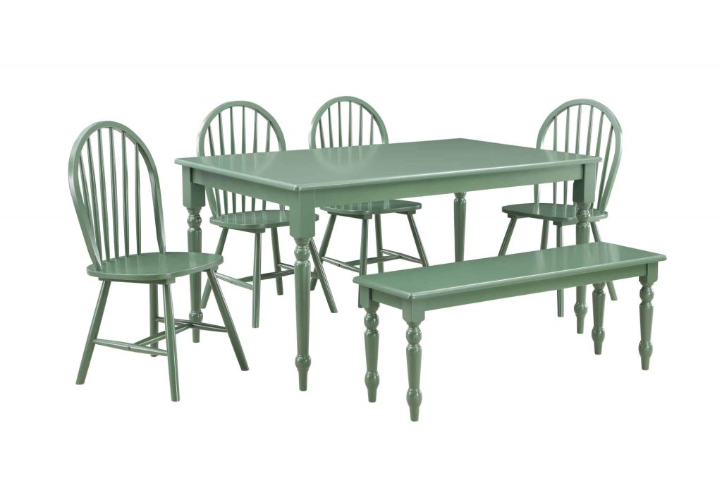 Cozy and inviting, the 6-Piece Carolina Dining Set brings home modern farmhouse charm. From the turned table legs to the curving spindle chair backs, each piece is full of personality. The rectangular dining table, four chairs, and dining bench offer enough seating for a family of six. Crafted from rubberwood, each piece is finished in a decadent Equestrian Green color that adds an inviting sense of warmth to your dining room. Finish the look by adding the Carolina Kitchen Cart or a spare Carolina Dining Bench to your home (sold separately).