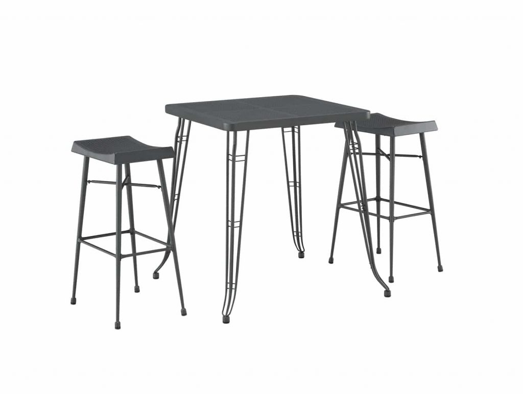 The Carson 3-Piece Pub Set immediately infuses your dining area with a dose of industrial cool. This 3-piece set is crafted entirely from steel with a gray finish. Perforated cutouts dot the stool seats and the tabletop, adding extra edge. The stool seats are molded for comfort and the built-in footrest adds stability and relaxation. Also available in 5-Piece Set. Ships ready to assemble with all hardware included.