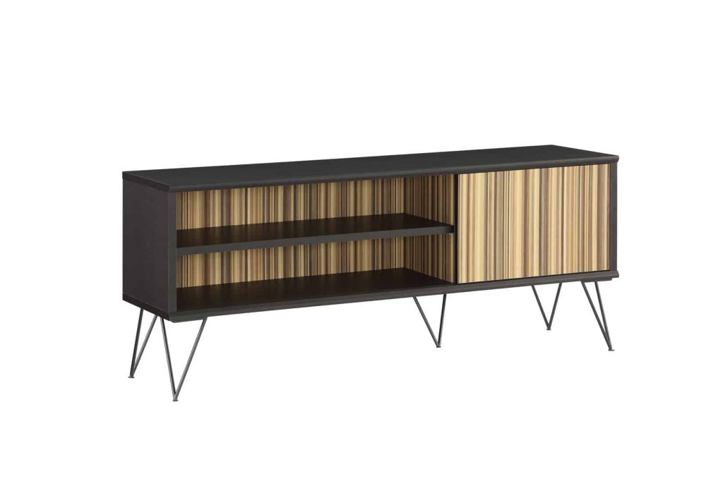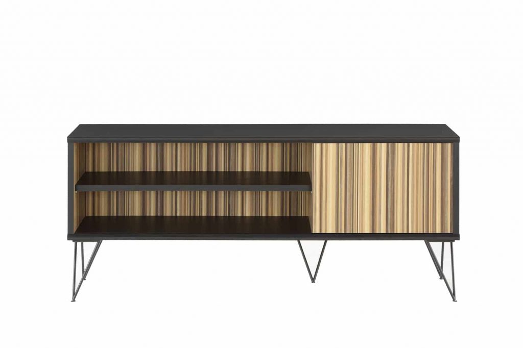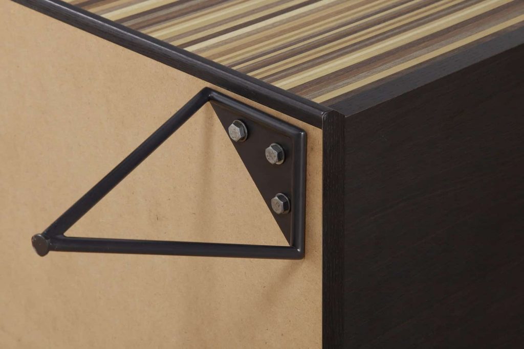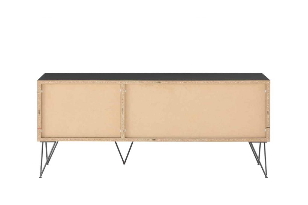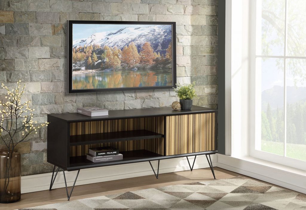 The Derwin TV Stand is constructed with PVC and MDF. It comes in a black & natural wood finish, and is ready to assemble upon shipment. It is built with two shelves and a cabinet to use for maximum storage. It is a great size and won’t take up much space, and can hold your TV with no problem.