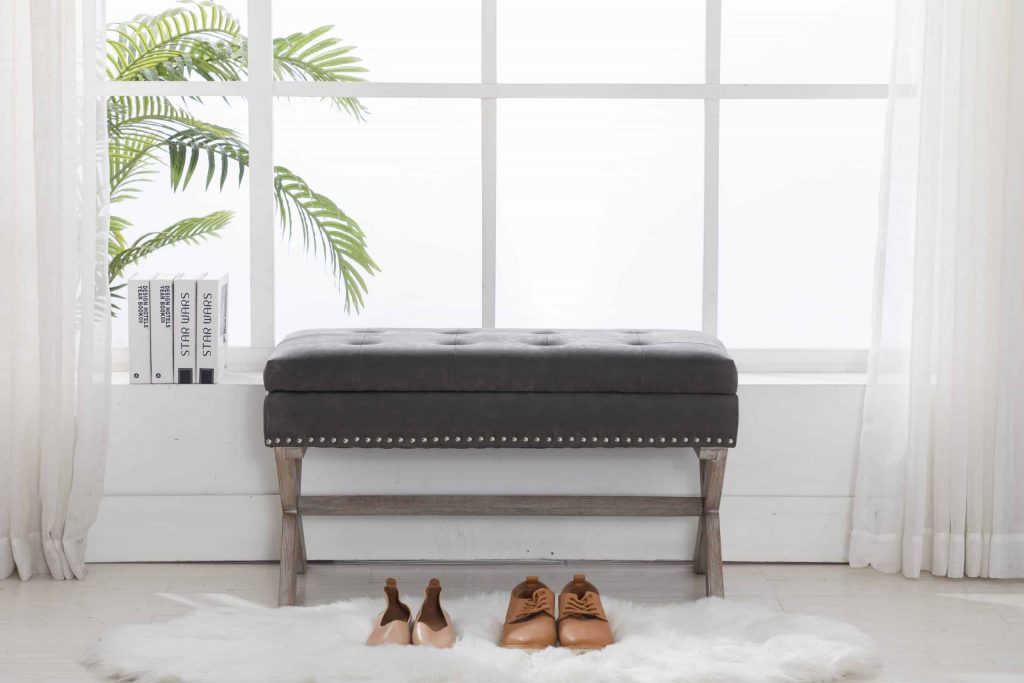 Available in two finished; black and gray. Upholstered, nail head trim, X-shaped legs.