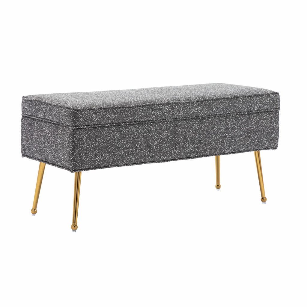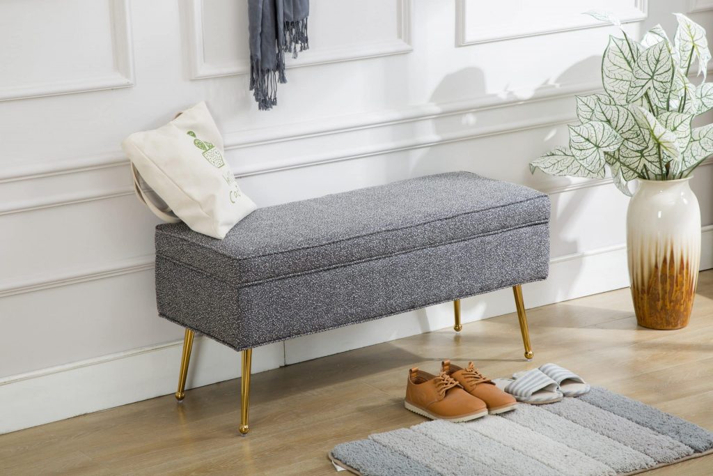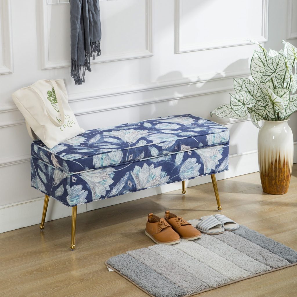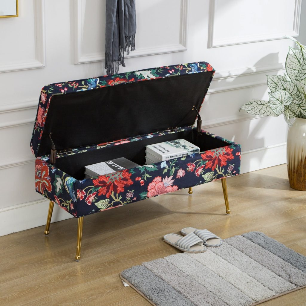Large storage bench that would be a great addition into your bedroom or living room. It is available in four finishes; gray, ivory, floral, and navy floral. It is constructed with flannel, sponge, and iron legs. The top opens up for the large storage area.