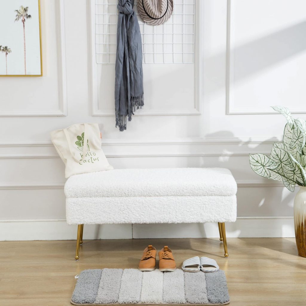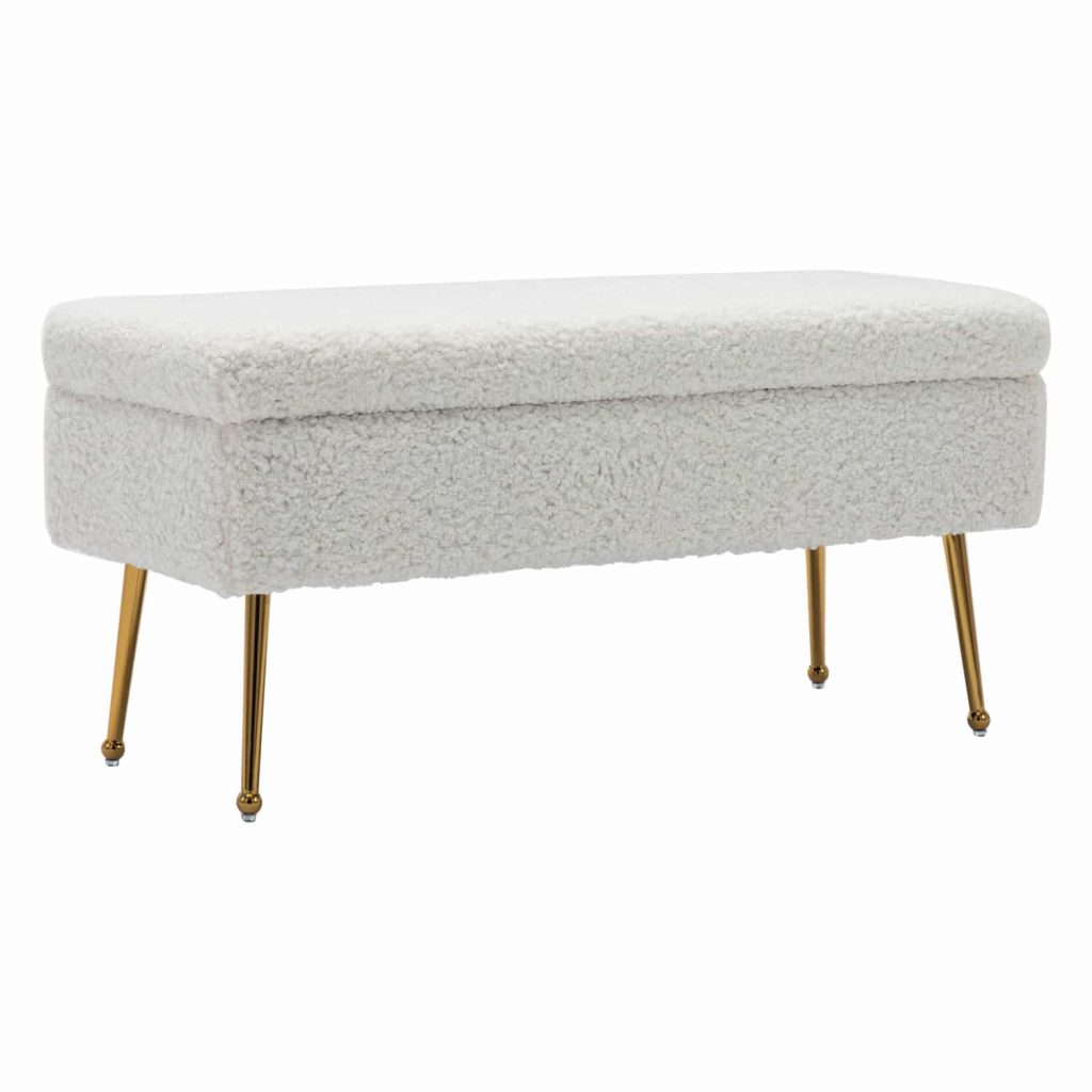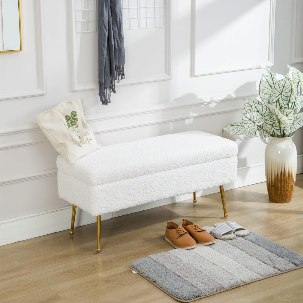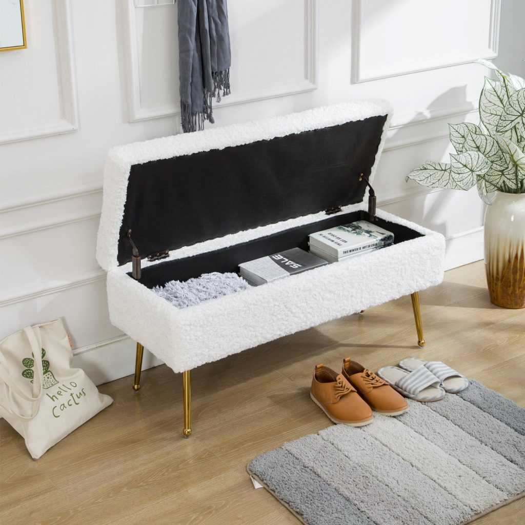 Large storage bench that would be a great addition into your bedroom or living room. It is available in four finishes; gray, ivory, floral, and navy floral. It is constructed with flannel, sponge, and iron legs. The top opens up for the large storage area.