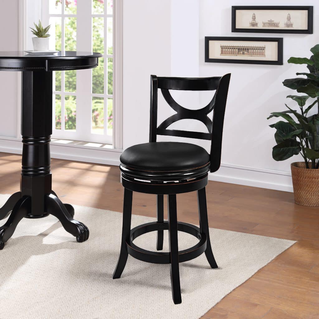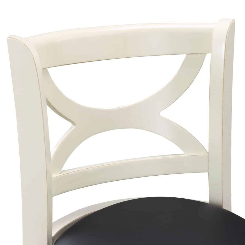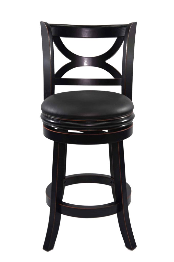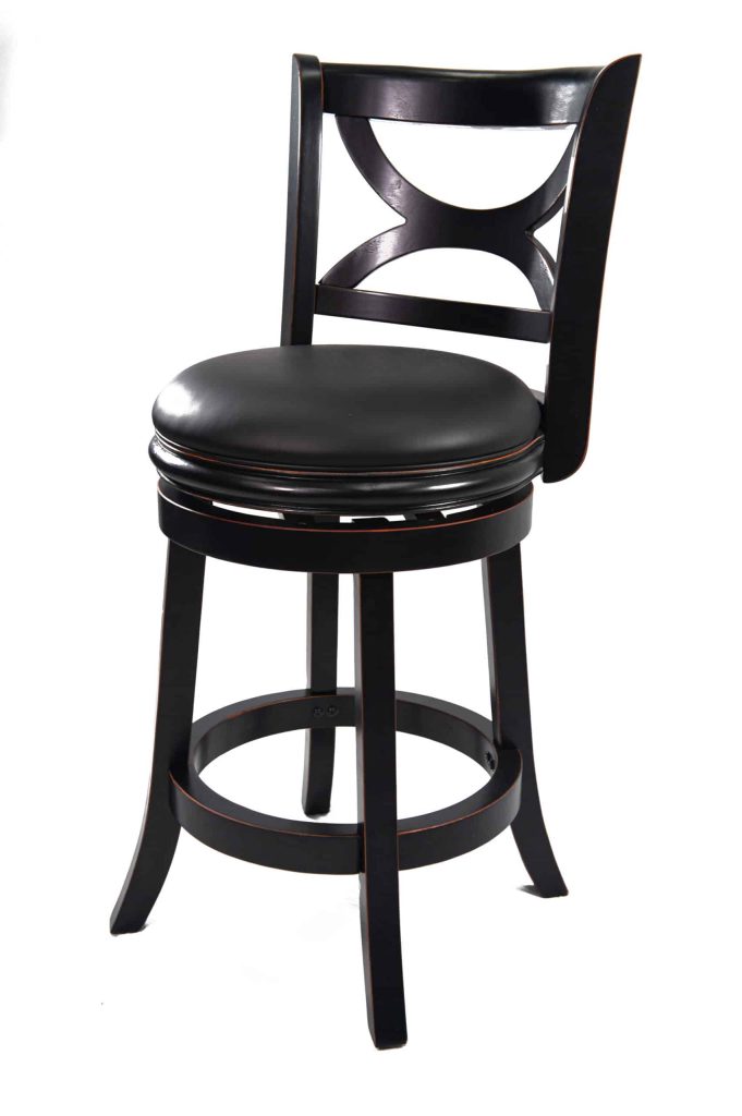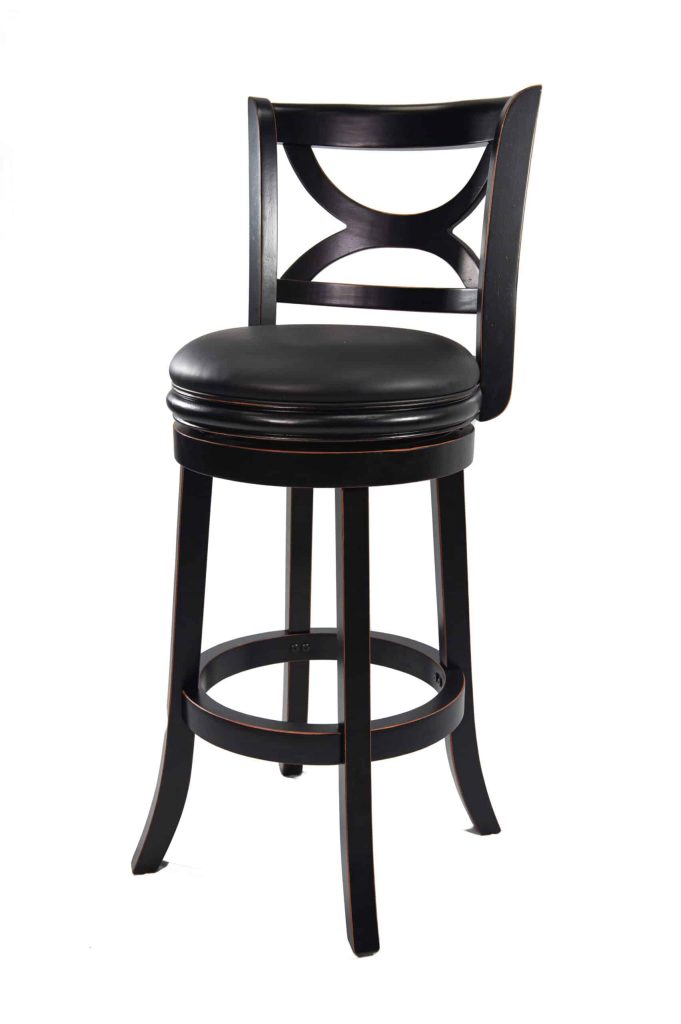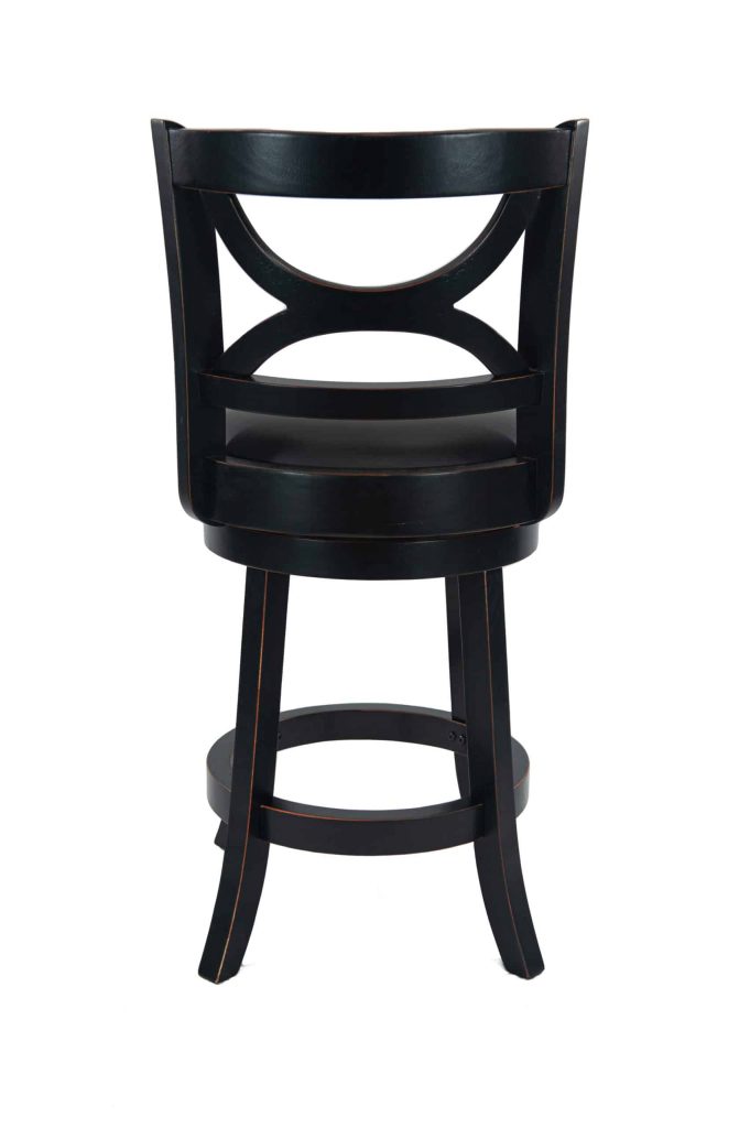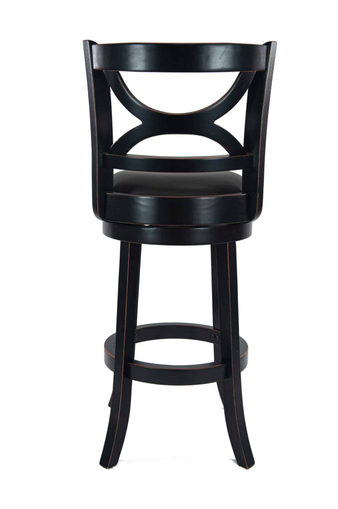 Introducing the Florence Swivel Counter or Bar Stool, where stunning design meets unparalleled comfort. Crafted from solid hardwood, this stool promises exceptional durability and longevity. The robust footrest, which also acts as a stability stretcher, is made from the same high-quality hardwood for added strength. Experience the luxury of a cushioned seat upholstered in sleek black faux leather, designed to enhance any space. While the solid hardwood frame showcases superior craftsmanship, its eye-catching features like the gracefully curved seat back and stylish flared legs elevate its aesthetic appeal. Enjoy seamless movement with a smooth 360-degree swivel, complemented by a reliable steel ball-bearing swivel plate. Thoroughly performance tested by industry experts, this stool is a must-have for your home! Available in two chic finishes—distressed white and elegant black sandthru—it’s the perfect accessory to elevate your interior decor.