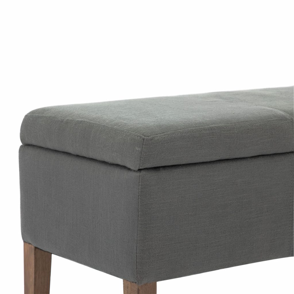 Gray finish, more storage than other benches, constructed with wood and fabric.