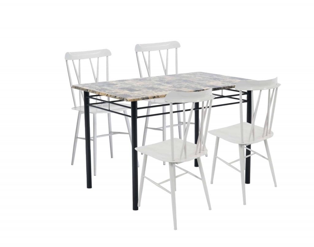 Whether hosting a dinner party with close friends or enjoying an everyday meal with the family, this 5-piece dining set is a must-have for your home. The dining table strikes a rectangular silhouette and is crafted from a black metal frame and a faux marble tabletop. The four metal dining chairs each feature an open double-x style back. The dining table set is suitable for any space in your home. Spend quality time with your family, make life elegant and practical, and enjoy life in this moment.