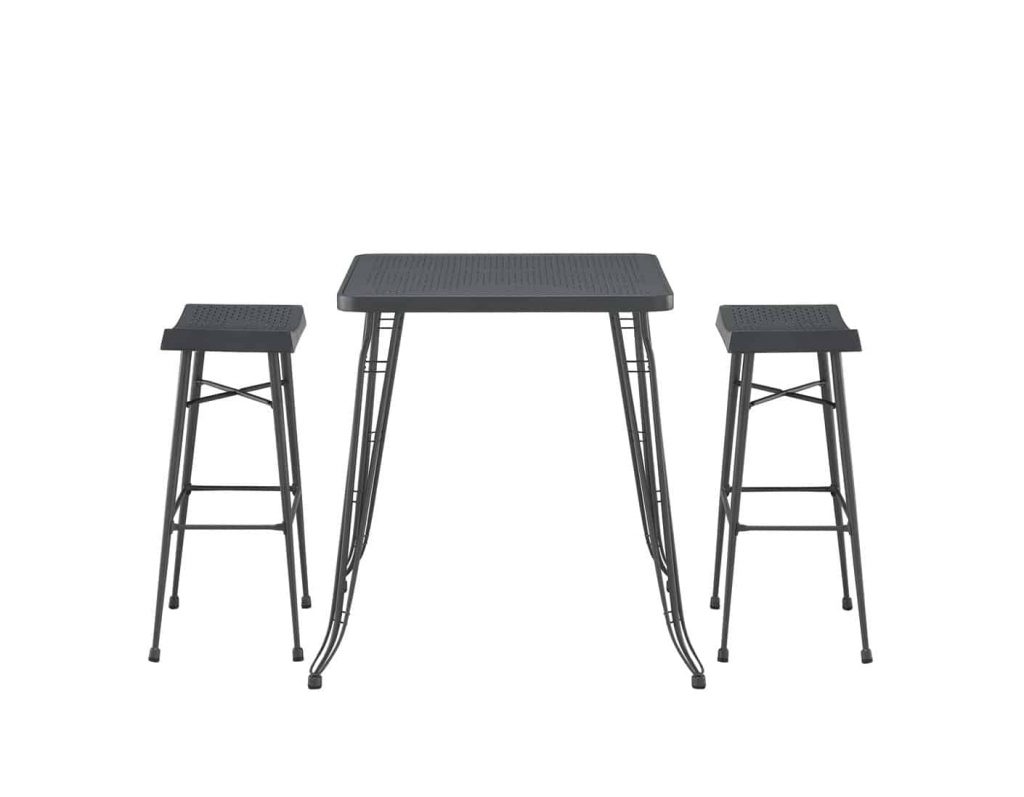The Gilbert 3-Piece Pub Set proves that industrial design can still be inviting. Although this 3-piece set is crafted from 100 percent steel, it’s designed for comfort with molded seats and built-in footrests. Perforated stars decorate the tops of each item, increasing the industrial feel. Also available in a 5-Piece Set. Ships ready to assemble with all hardware included.