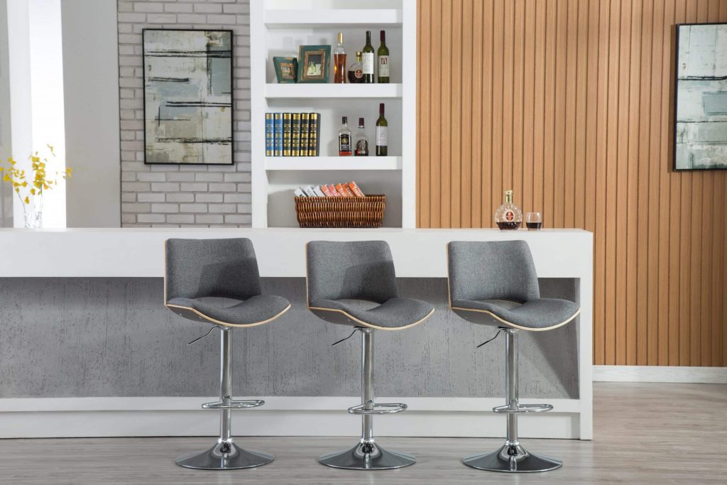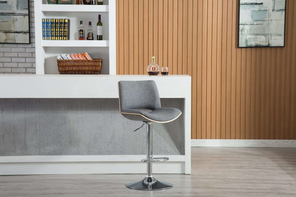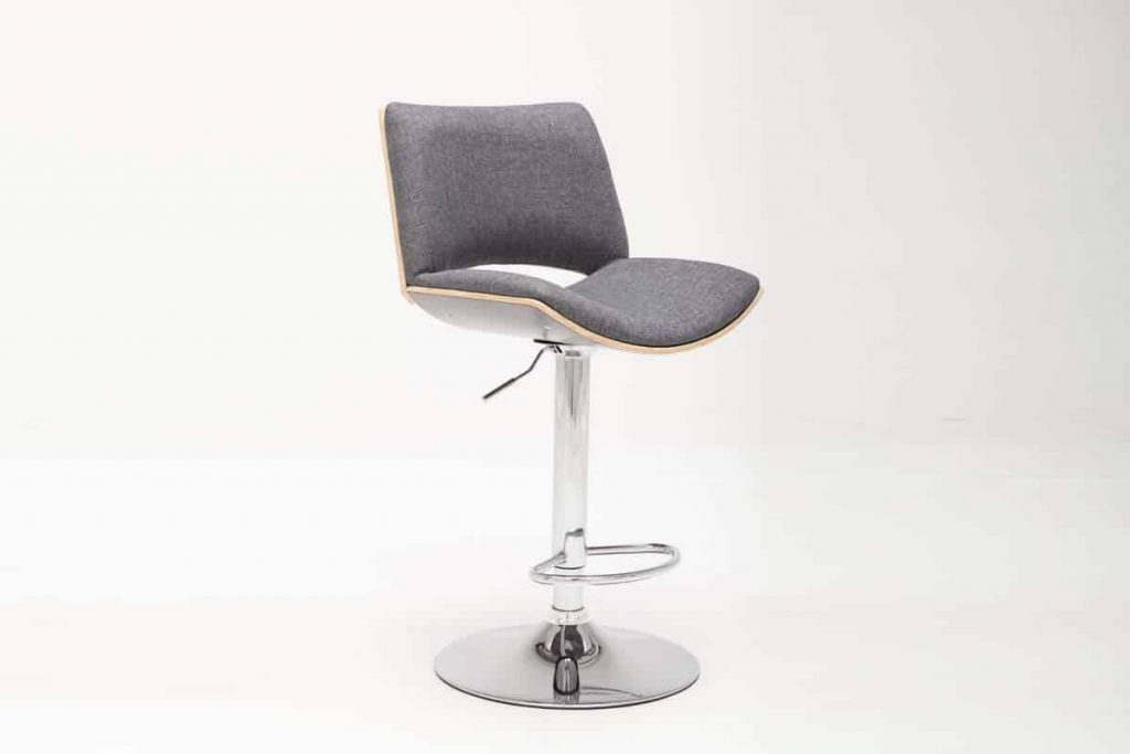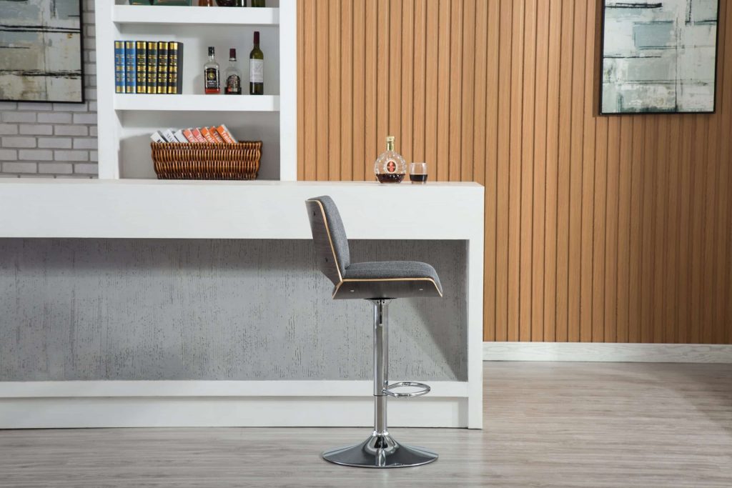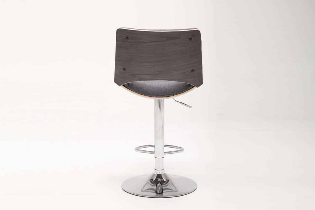 A mid-mod marvel, the Gordon Bentwood Adjustable Swivel Stool is a modern take on retro style. The stool’s gleaming chrome base adjusts from counter to bar height using a hydraulic air lift. Curved bentwood supports the seat and back, which are lightly cushioned and then upholstered in gray fabric. Recommended for residential use only.