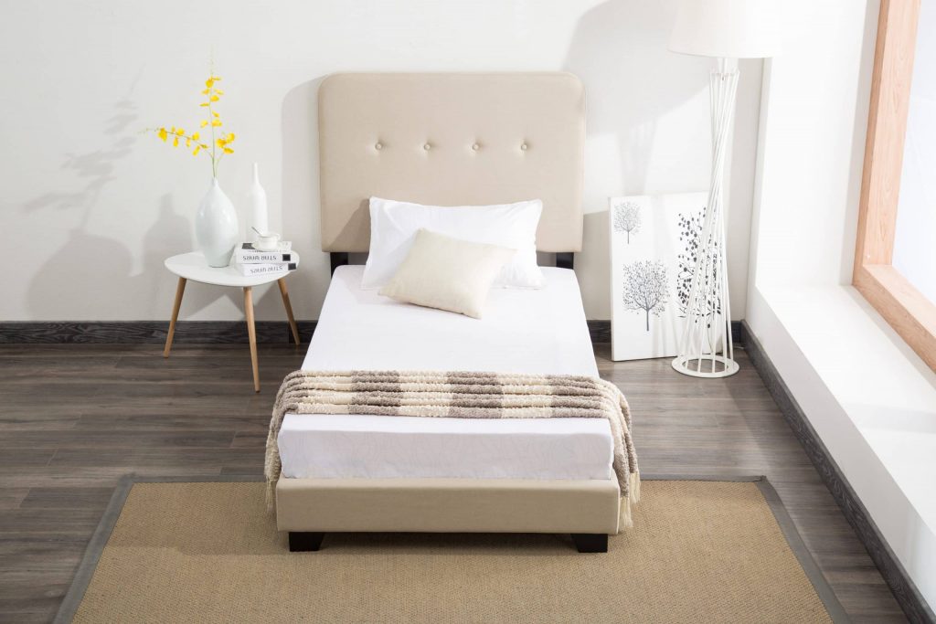 The Helene Bed In A Box proves that you don’t need to sacrifice style for simplicity. This modern bed is crafted from pine wood with tufted fabric upholstery. It includes everything you’ll need: headboard, footboard, slats, rails, and feet. For your convenience, every component arrives together in one neatly organized box. Choose your preferred size and upholstery color to make this bed perfect for your space.