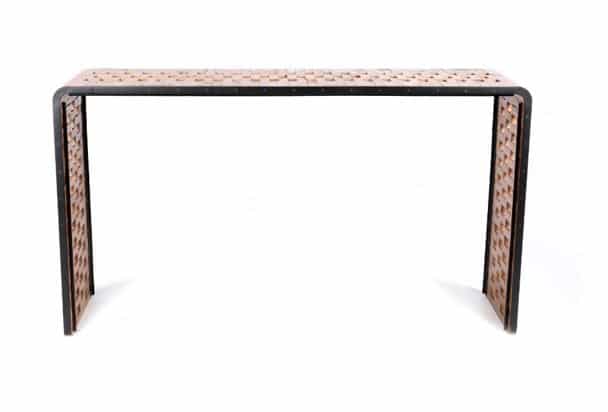 This console table with a beautiful hole pattern is the perfect addition to any area in your home. Made from fir wood with a natural finish and a black metal frame. This item comes out of China.