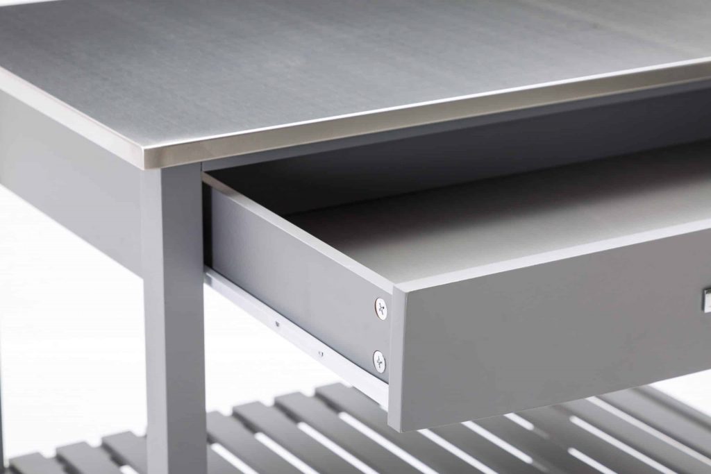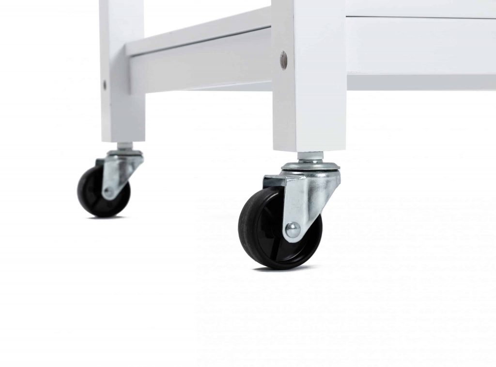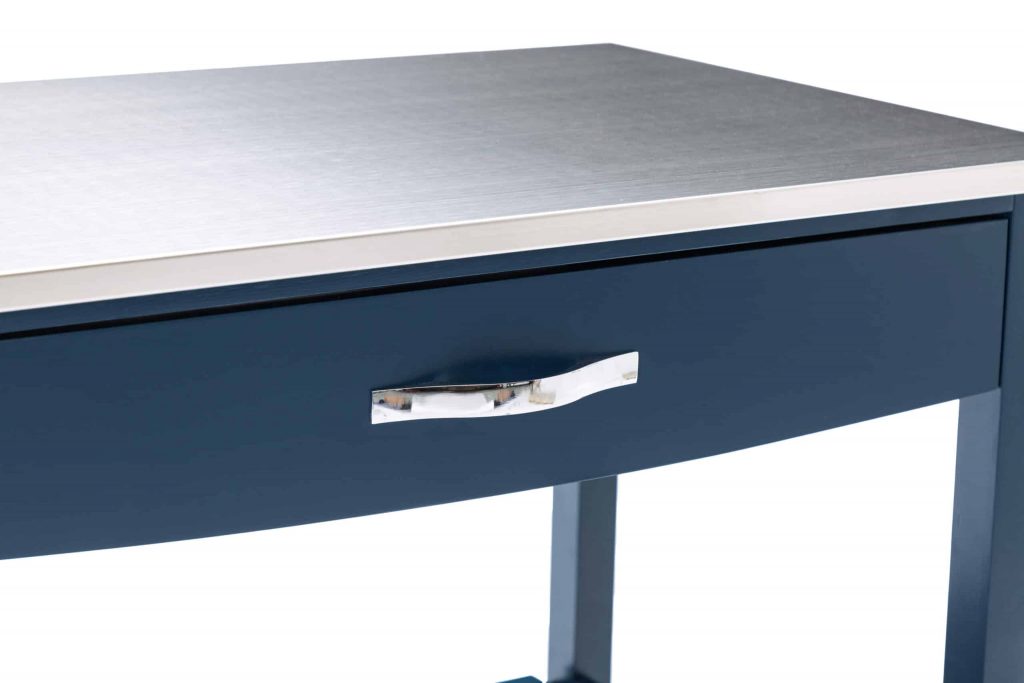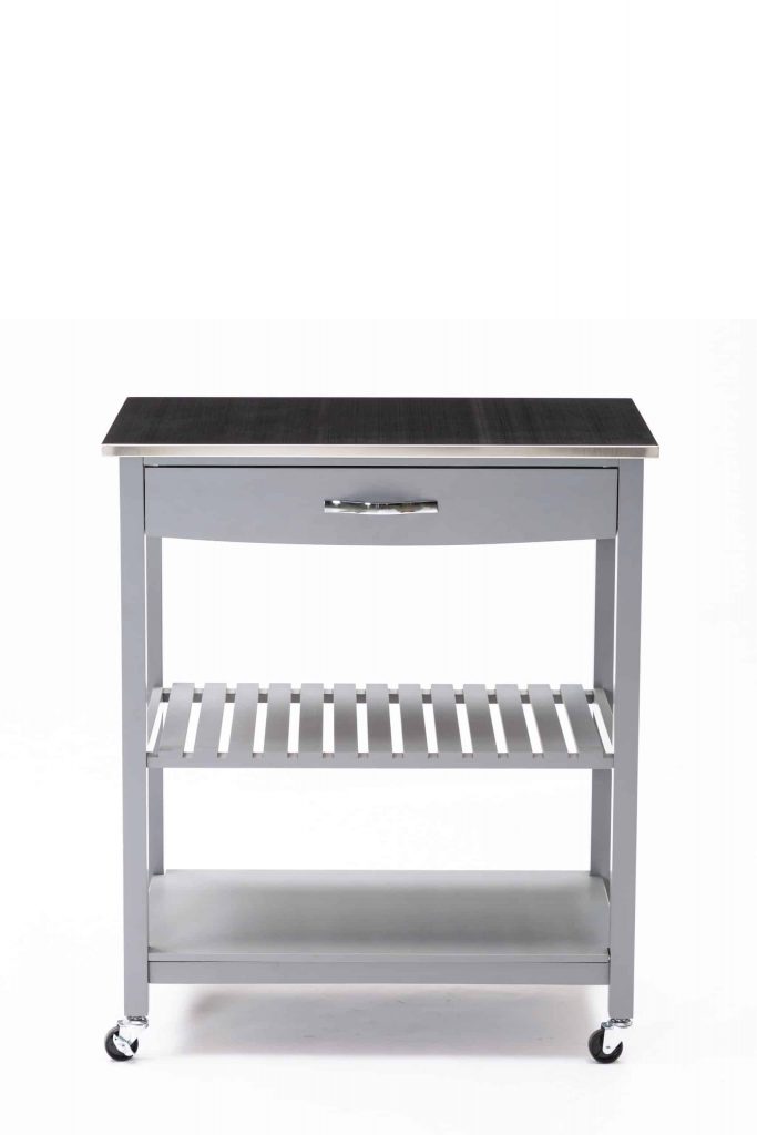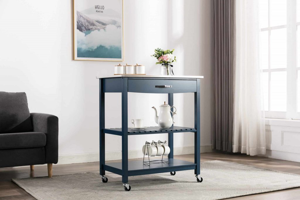 If you need a little extra storage and prep space for your kitchen, look no further than the Holland Kitchen Cart With Stainless Steel Top. This rolling kitchen cart also makes a great bar cart! Store dishes, glassware, cutlery, or your favorite spirits on the lower shelves. A slender drawer conveniently holds napkins, utensils, corkscrews, and other kitchen must-haves. Use the rolling caster wheels to roll this cart from the kitchen to the living room whenever guests are over, then wheel it back when it’s time to wash the dishes. It’s built from pine wood and medium density fiberboard with a stainless steel work surface. Available in three finishes; Gray, Navy Blue, & White. Ready for assembly upon delivery.