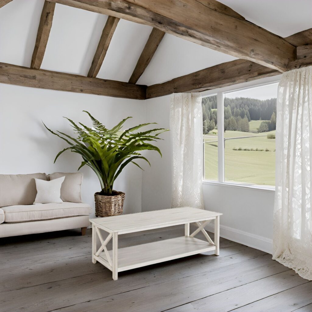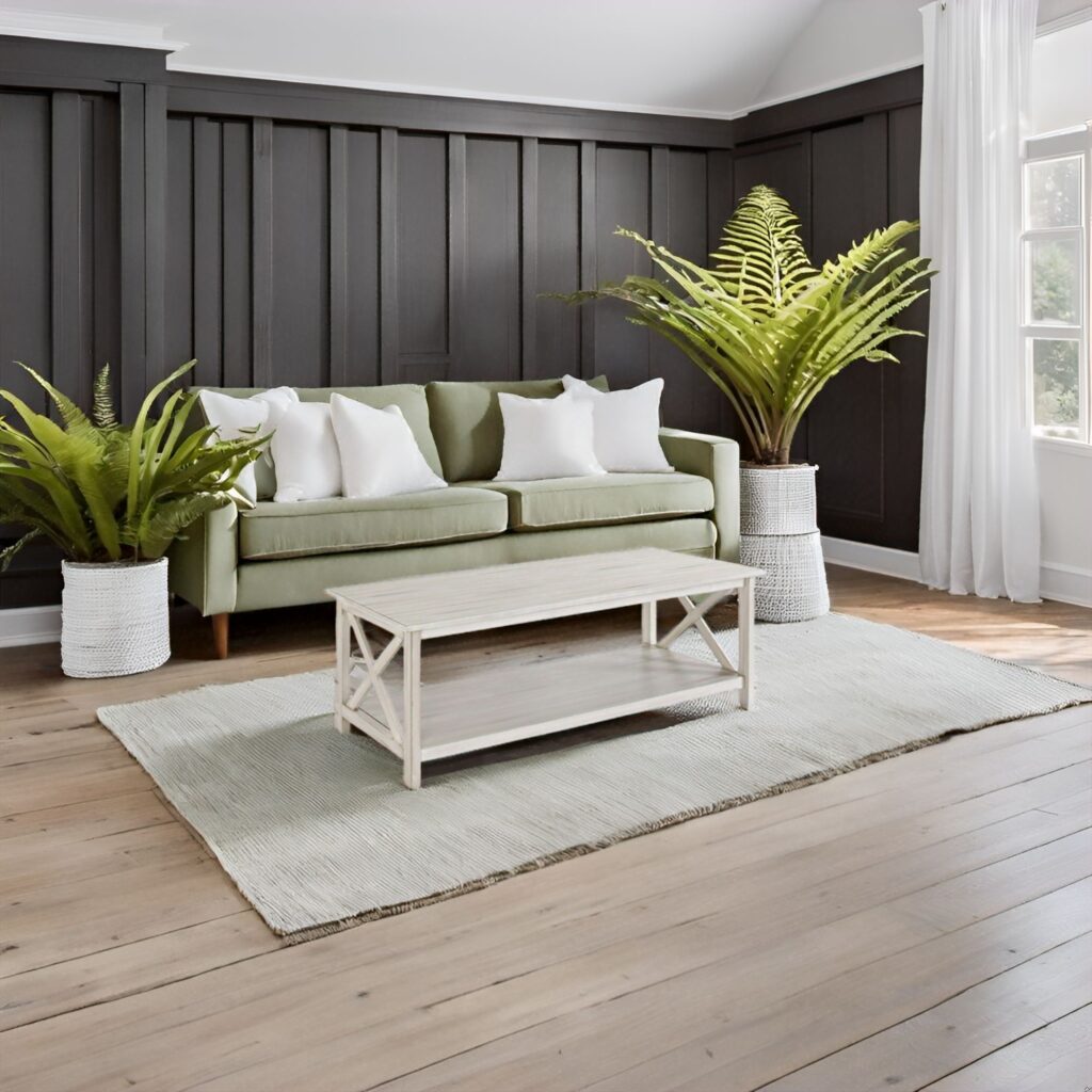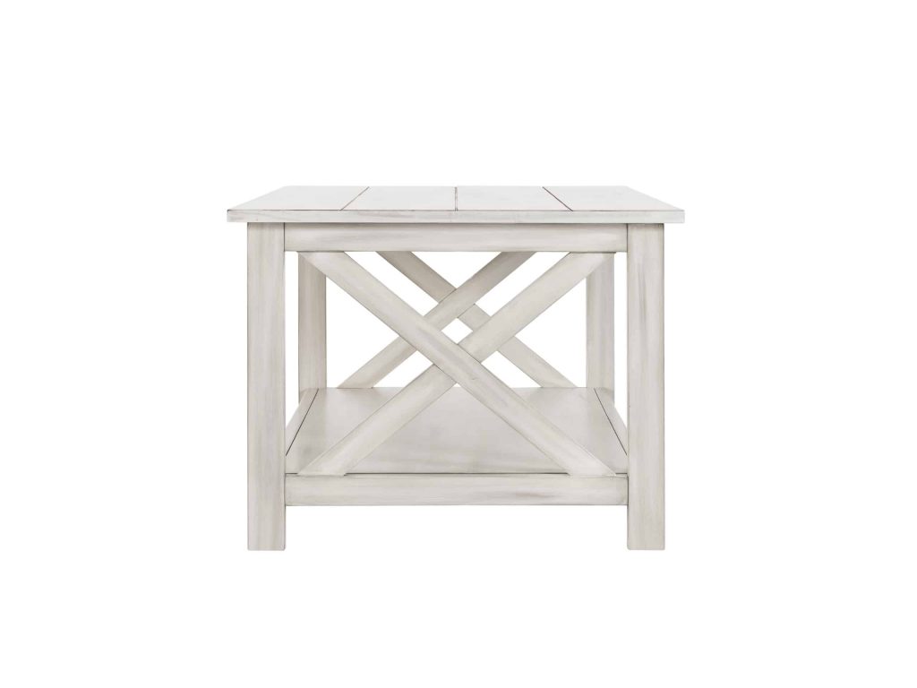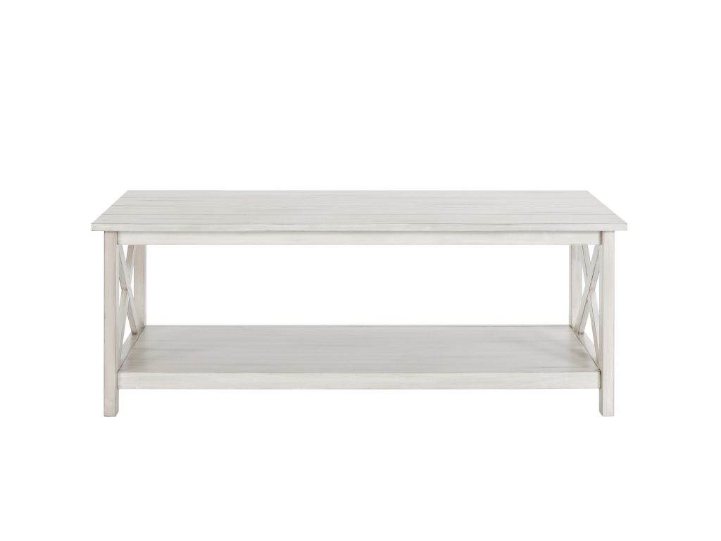 Outfit your living room in refined farmhouse style with the Jamestown Coffee Table. This charming table is crafted from MDF and solid rubberwood. Plank detailing on the tabletop and lower shelf create the illusion of a reclaimed piece. The antique white finish further adds to the cozy downhome feel. Transform your home with the other farmhouse-inspired Jamestown living room and dining room furniture from Boraam.