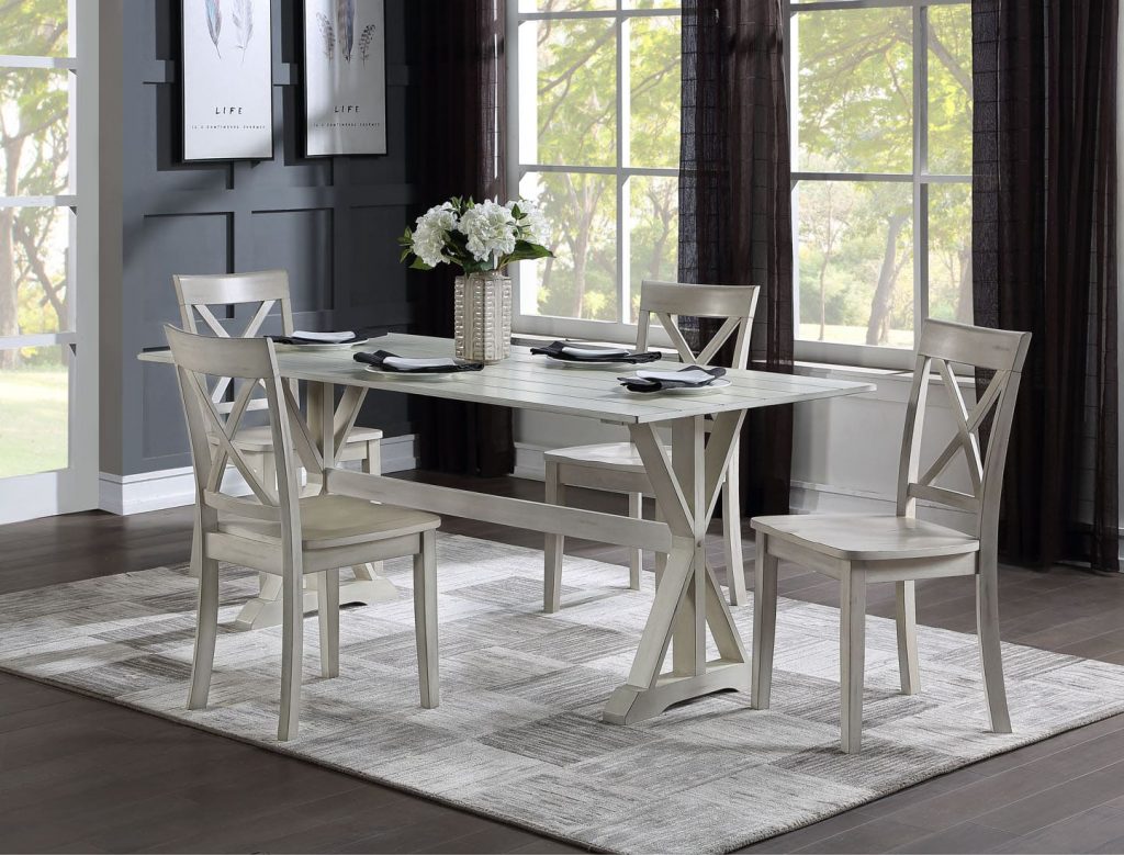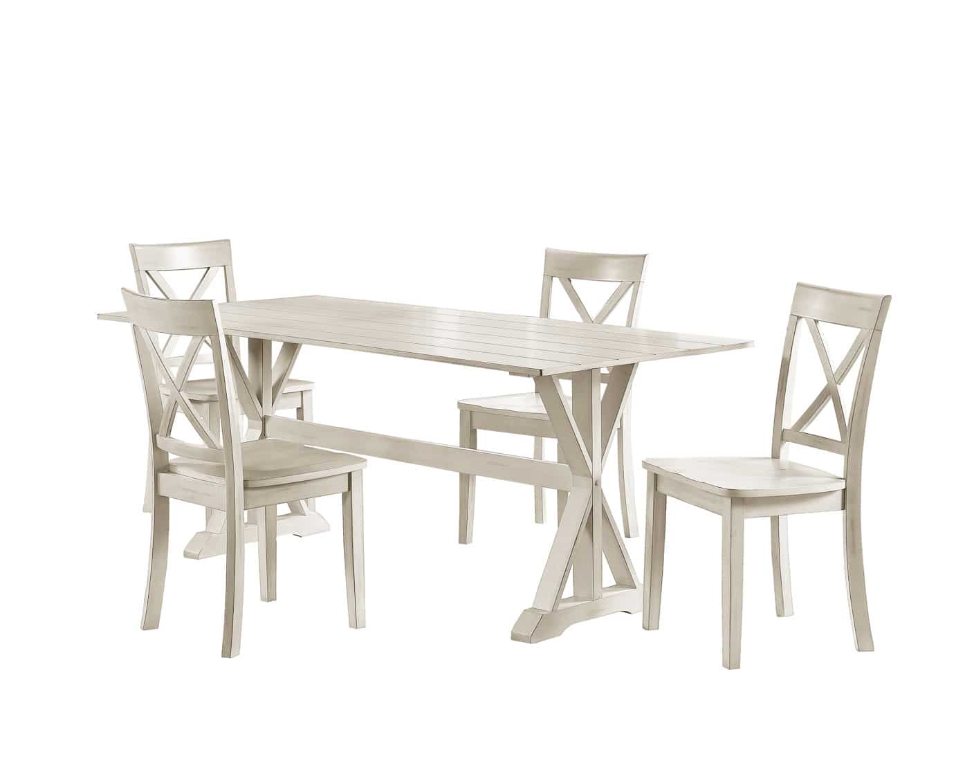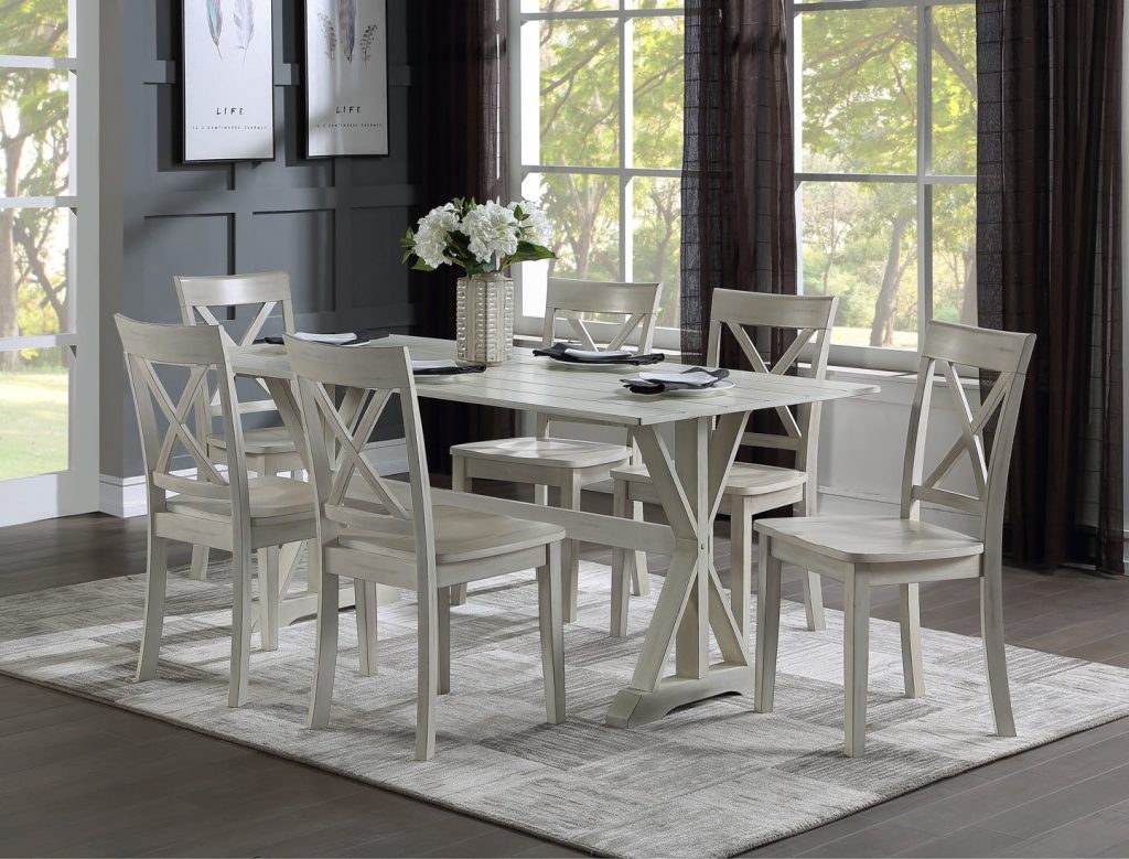 Somehow, food tastes a little better when it’s eaten around the Jamestown Dining Set. Maybe it’s the set’s farmhouse-inspired look and feel. The rustic antique white finish, the X back chairs, and the trestle-style base are all perfect examples of cottage style. All pieces are made from a combination of medium density fiberboard and solid rubberwood. Customize the Jamestown Dining Set to your needs: turn it into a 5-piece, 6-piece, or 7-piece set with any combination of our Jamestown Dining Chairs and Benches around the table.
