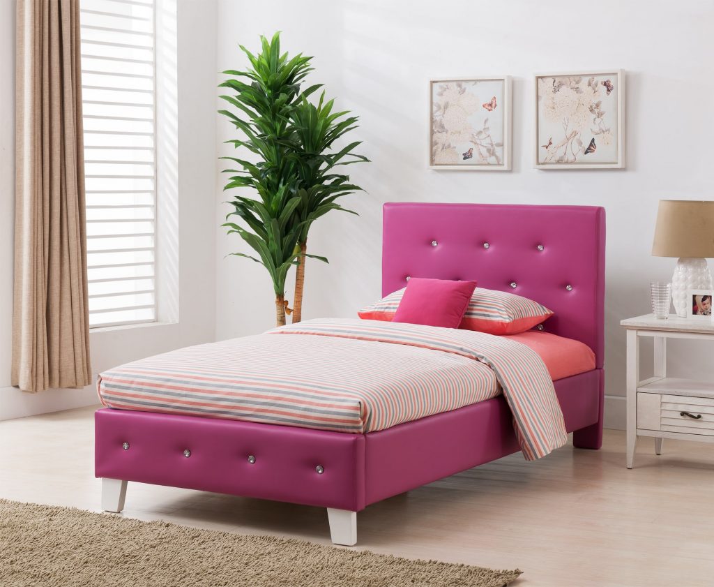 The Kelsey upholstered bed is adaptable to bedrooms of all ages. The bed comes in two sizes: twin and full. It features fashionable glass buttons on the headboard and footboard.