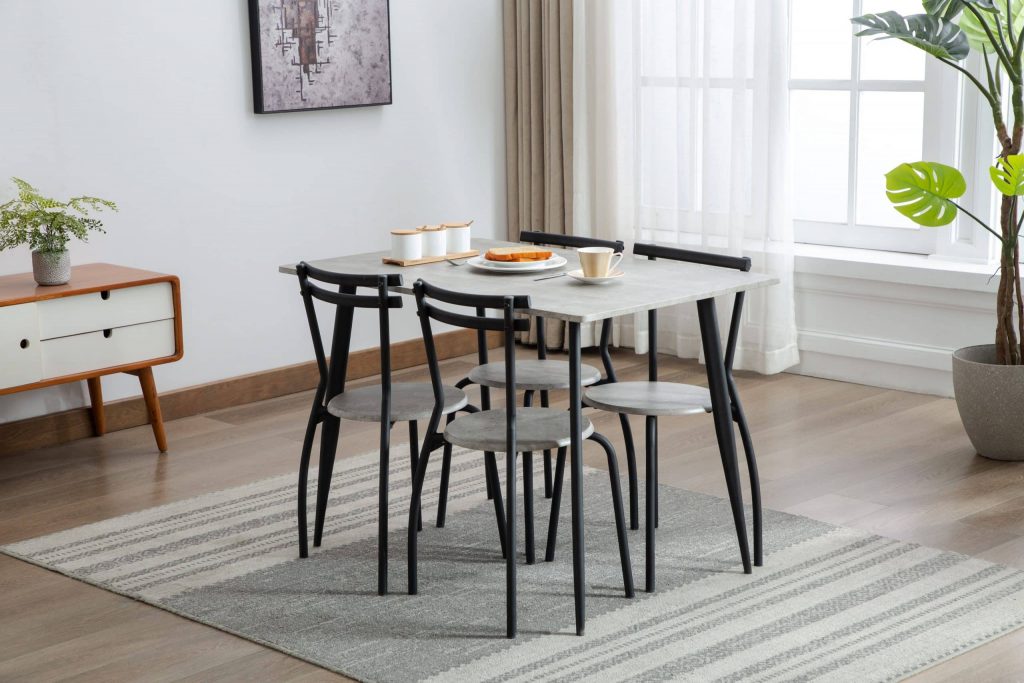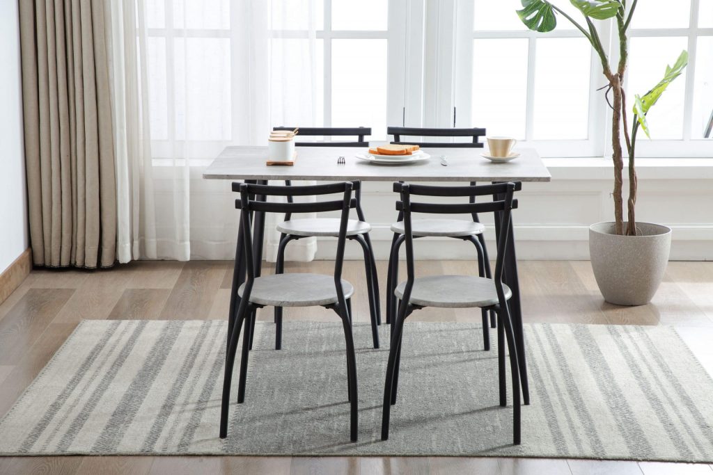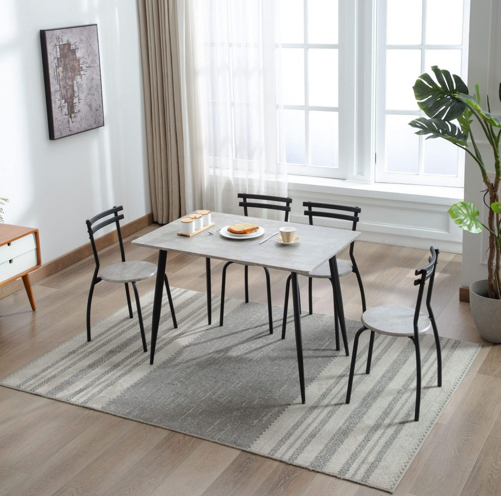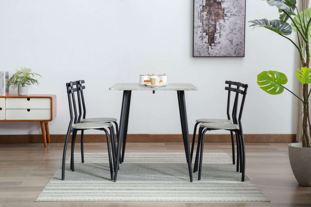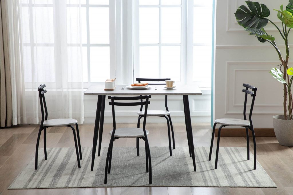 This beautiful Dining set comes with 4 chairs and a table. The table has a MDF top with PVC veneer and a black metal frame. The chairs have a MDF seat with PVC veneer and a black metal frame. This item comes out of China.