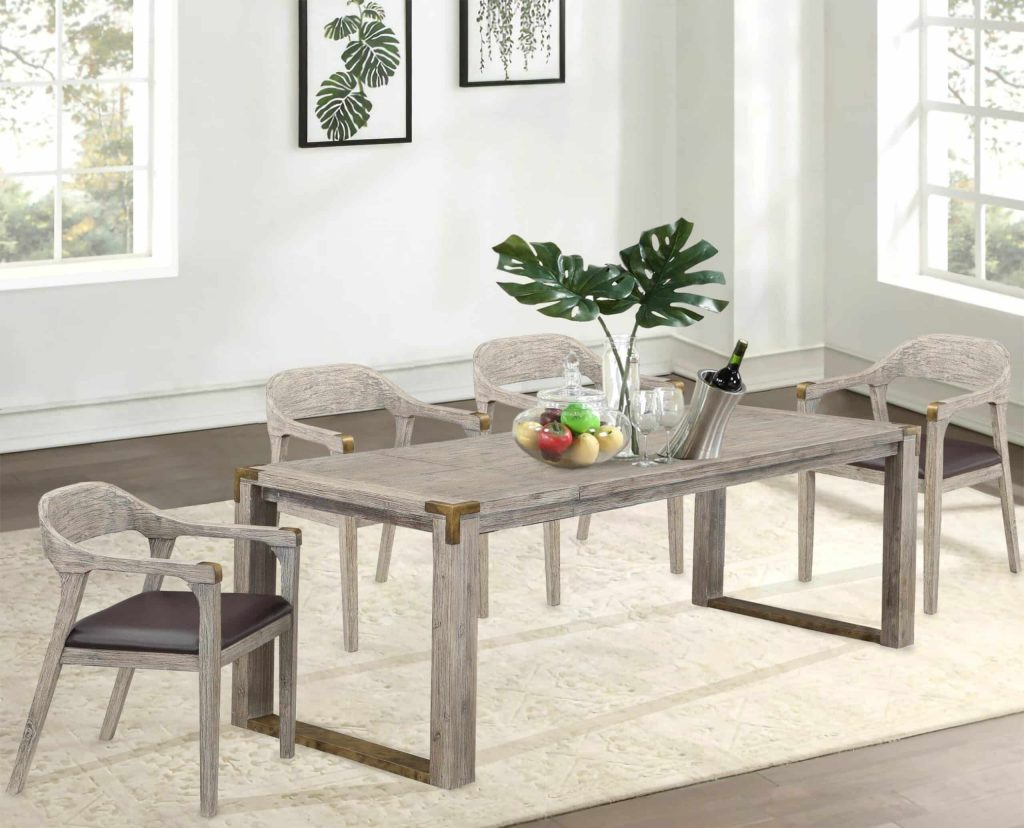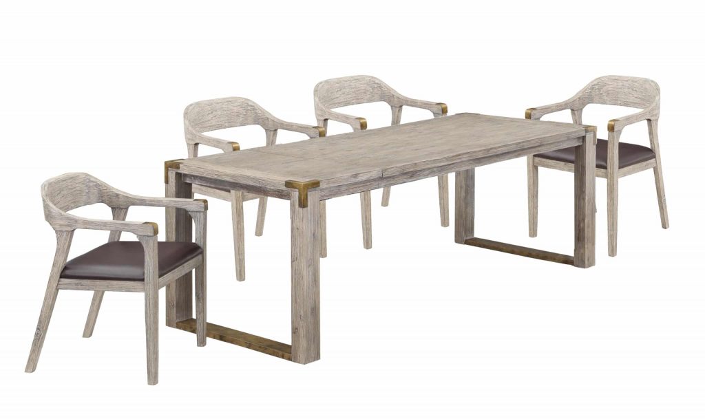 Make a dynamic statement with the Boraam 5-piece Montana Dining Room Set. The set is available with several different combinations of our dining table, bench, and dining chairs. The table and chairs are constructed with solid Acacia wood. The chairs are also upholstered with high-density foam wrapped in plush brown faux leather upholstered seat. This 5-piece set is available in our new Light Barnwood Wire-Brush finish. The light barnwood finish and Burnished metal accents will bring a warm energy to your home. The dining table has a 15.75” drop leaf extending the table to 88.5 inches, seating up-to 8 guests comfortably. This set is ready for assembly upon delivery with all tools and hardware included.