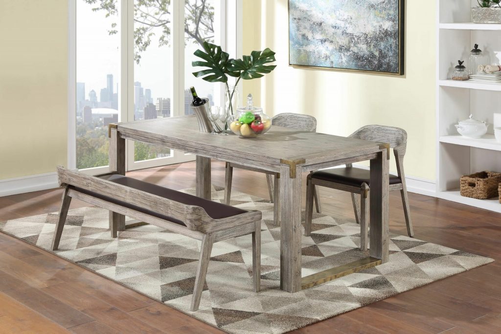 The Montana Dining Chair effortlessly exudes sophistication thanks to a rustic Light Barnwood Wire-Brush finish that pairs gorgeously with the burnished metal accents on the chair legs. Built with a durable acacia wood frame, the chair features a high rounded back and a lightly padded faux leather cushion for comfort. Make your home the envy of the neighborhood by pairing this chair with the matching Montana Dining Table and Montana Dining Bench (available sold separately).