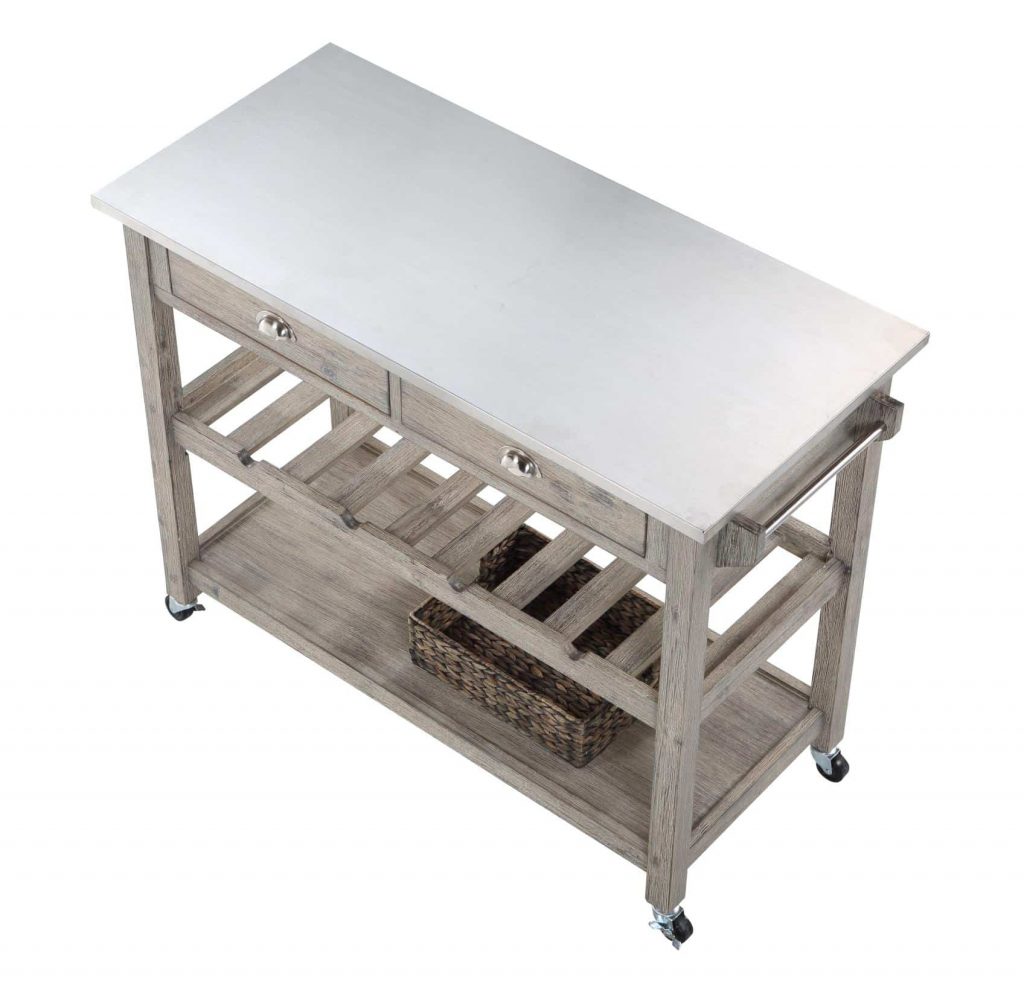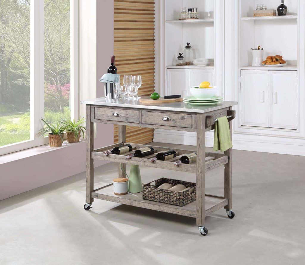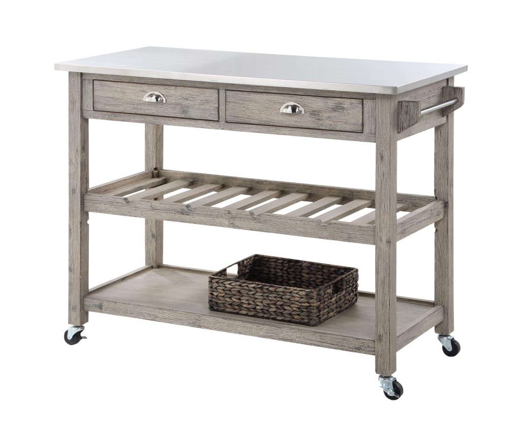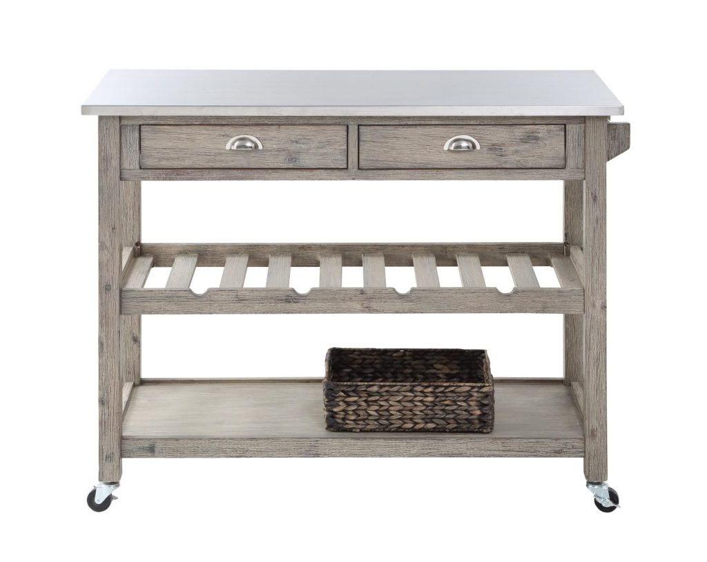 Your kitchen’s new best friend, the Montana Kitchen Cart offers versatility in an attractive rustic package. Built from acacia wood, the wood features a Grey Wire-Brush finish that highlights the wood grain. A perfect food prep area, the stainless-steel countertop -increase the size of your work surface. Storage features include an open lower shelf and two drawers, plus an adjustable wine rack capable of holding four bottles. This kitchen cart also includes a storage basket, made from woven water hyacinth. The basket measures 14.17 x 11 x 4.33 inches. Complete your dining room or kitchen with the matching Montana Dining Table and Montana Dining Chairs (both sold separately).