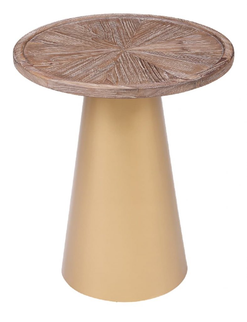 Bring your living space to life with these bold Mid-century Patrick Accent Tables. Featuring a conical pedestal metal base that is finished in a brilliant gold plating which contrasts perfectly with the Coffee Brushed finish of the reclaimed pine wood top. The Patricks’ round shape makes these tables versatile, so it can be used in virtually any room in your house, including the living room, bedroom, family room, den, or home office. Crafted from kiln-dried reclaimed pine wood with a brushed finish that highlights the natural wood grain variation. Top this compact round table with decor, a reading lamp, and your stack of must-reads.