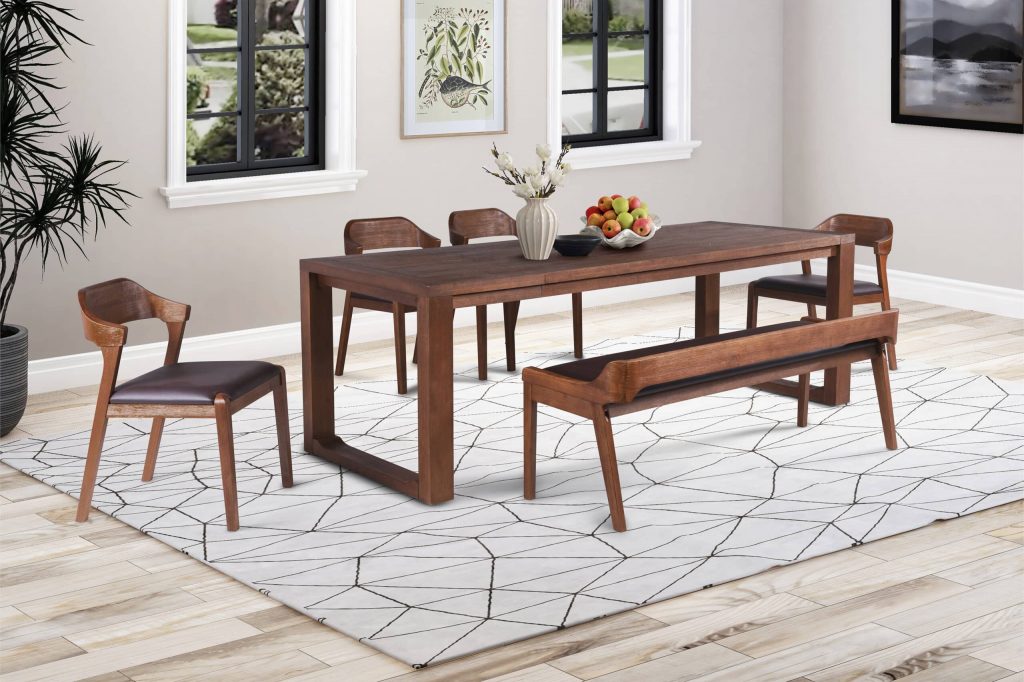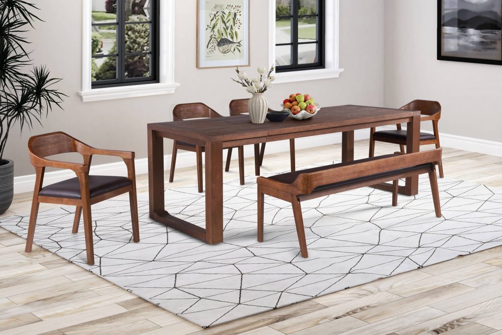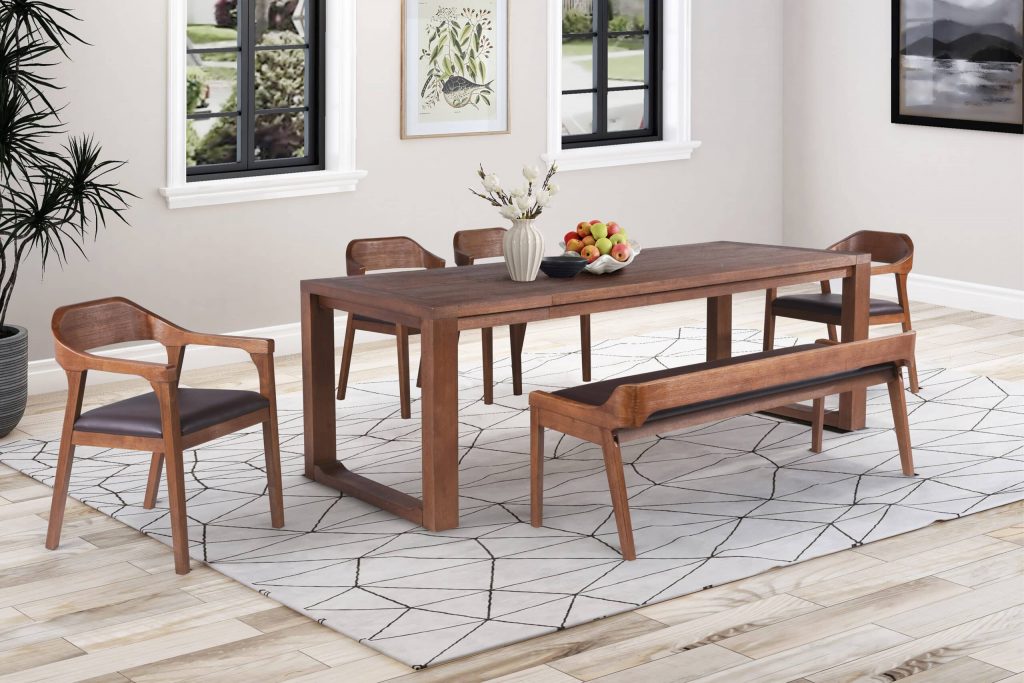 - The dining set includes 1 extension dining table, 1 dining bench, and 4 dining chairs