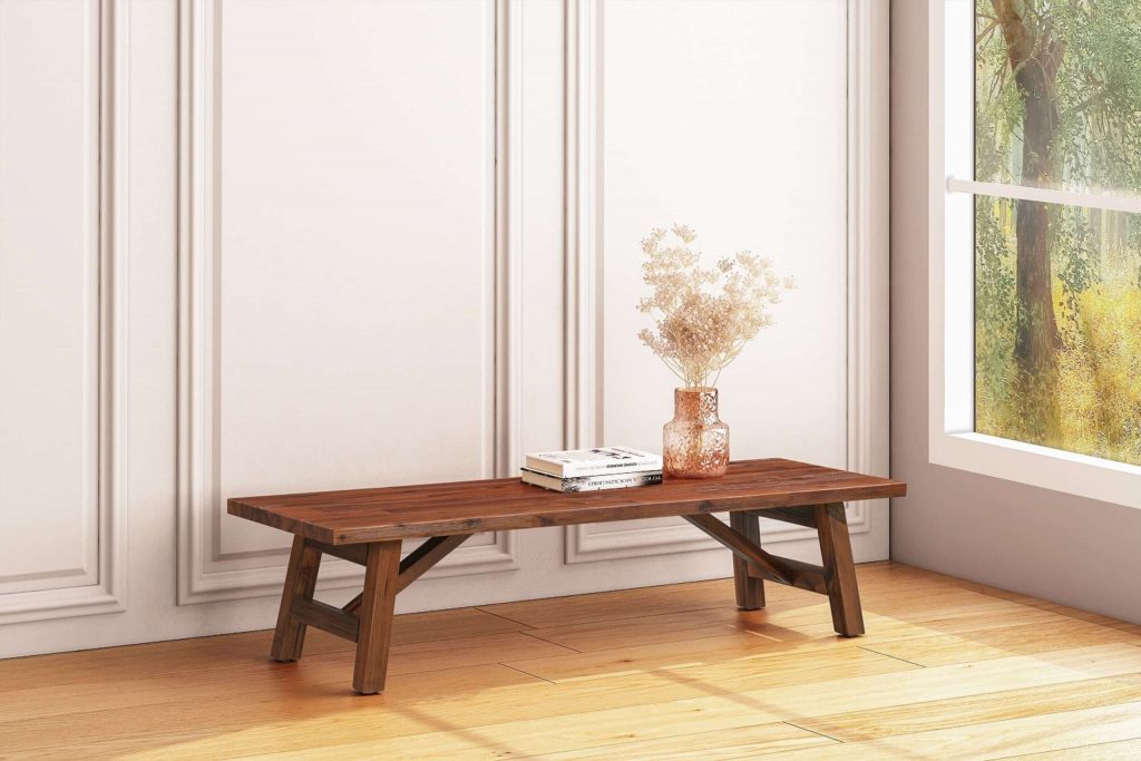 This simple mid-century modern indoor acacia wood accent plant table can be matched with various styles of home furnishings, adding vitality to any room in your home. Handcrafted of water-repellent solid acacia wood, our versatile accent plant table enhances the look of your indoor space. The simple rectangular shape and chestnut wire-brush finish add warmth and style to your living room, office, kitchen, or bedroom, pair with live or artificial plants or flowerpots. The Rasmus plant table can also be used as an accent table or bench, for indoor use only. Round out the look of your space by also adding on the matching Rasmus console Table (sold separately).