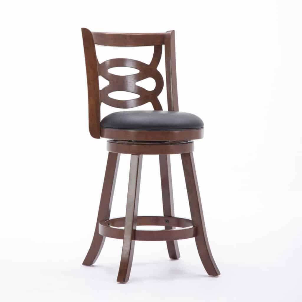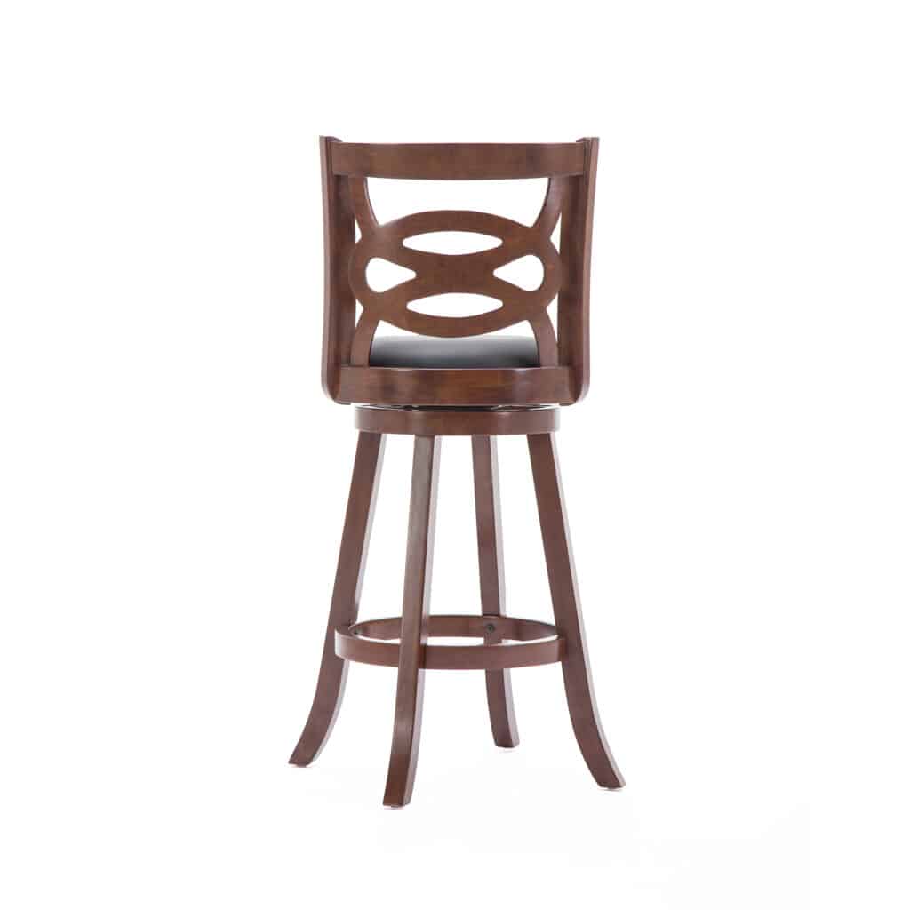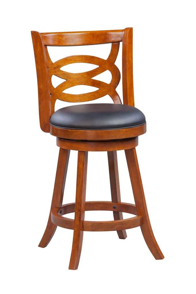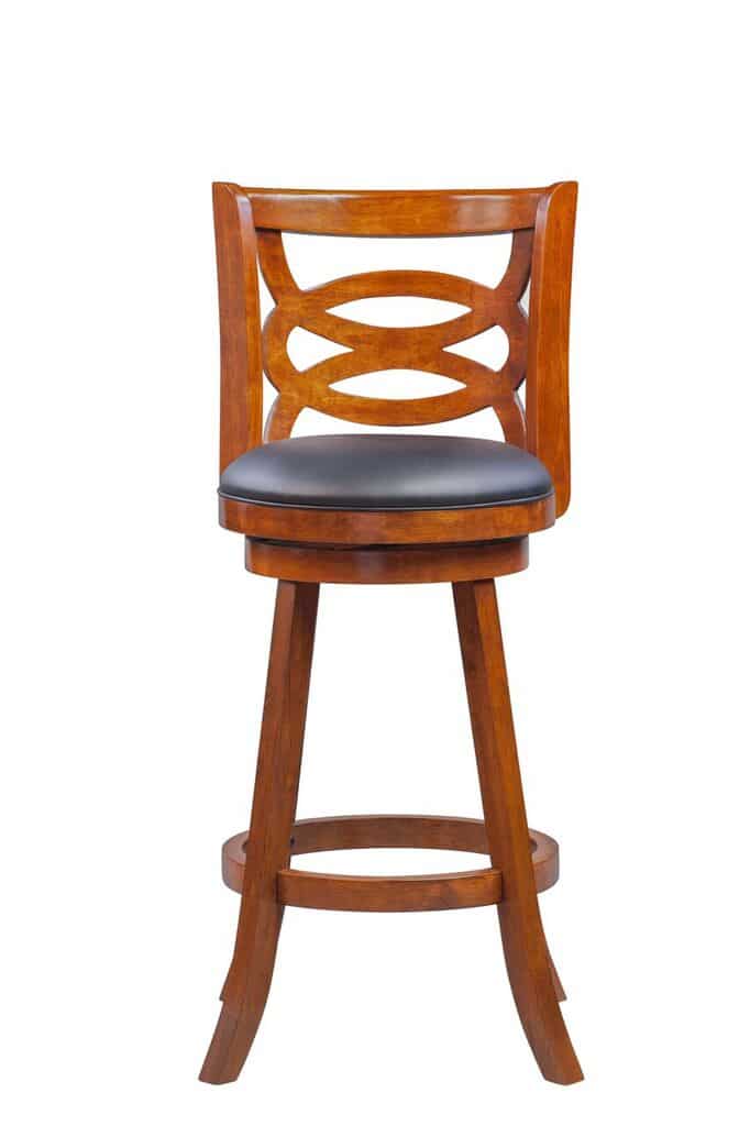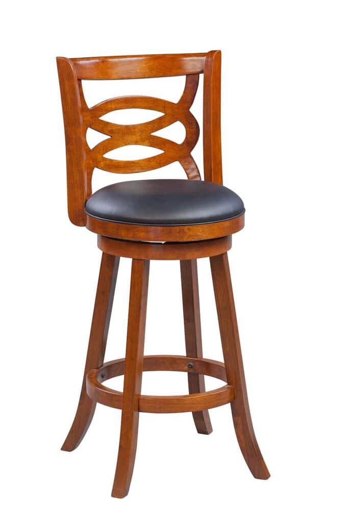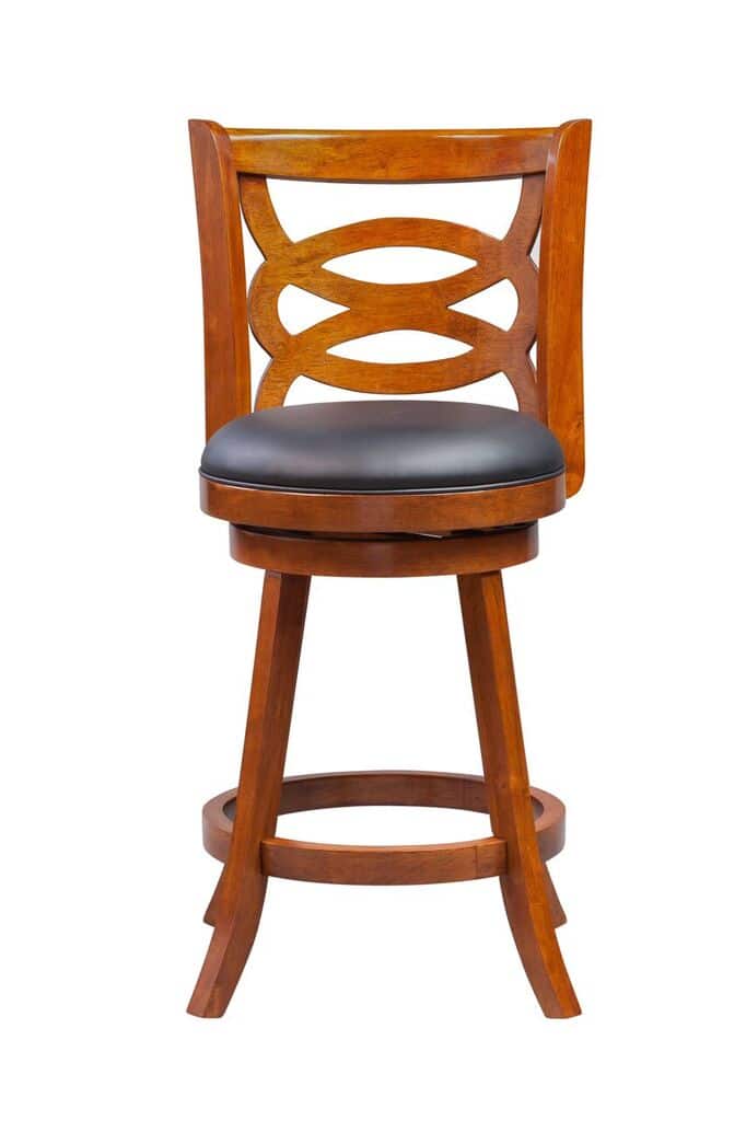 The Boraam Seina Swivel Stool brings home style, comfort, and stability in spades. This traditional stool features a design twist, with interlocking circles on the open backrest creating visual interest. It fits into any traditional or contemporary setting. The stool even comes in color and height options for additional versatility. Craftsmanship meets comfort with the steel ball-bearing swivel plate that frees up your movement and allows you to turn in a full 360-degree range of motion. Leatherette seat upholstery cleans easily with a damp cloth, hiding the high-density foam seat cushion that offers even more comfort. Finally, a full-ring footrest and flared legs provide enhanced stability, along with a double seat apron that adds extra support. Whether you’re using the stool when entertaining guests or enjoying it when you unwind solo, this stool is built to last.