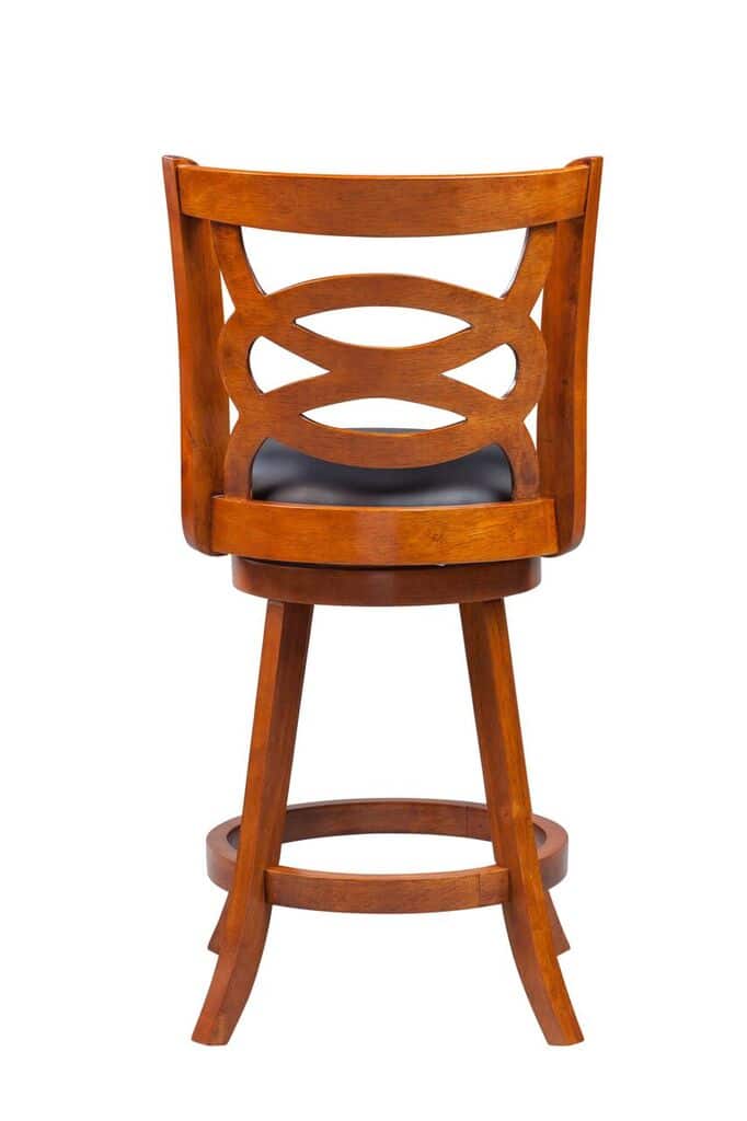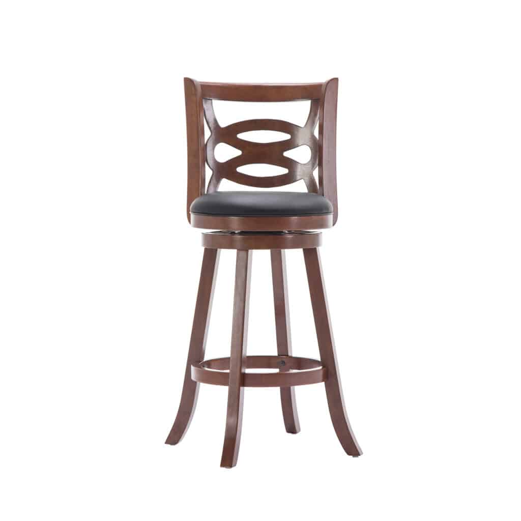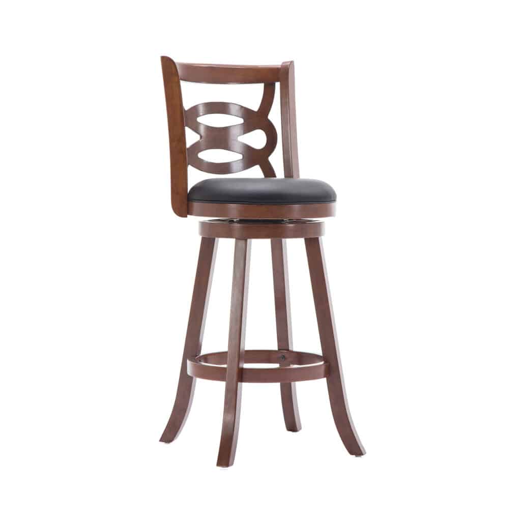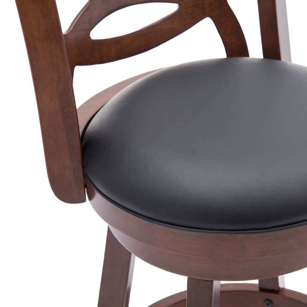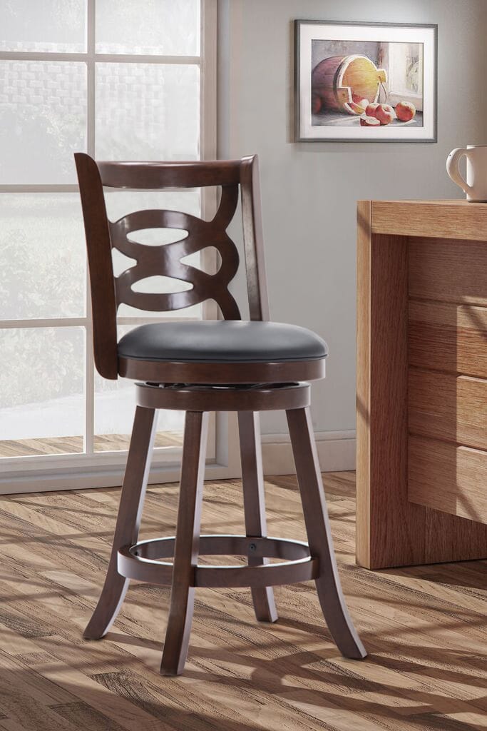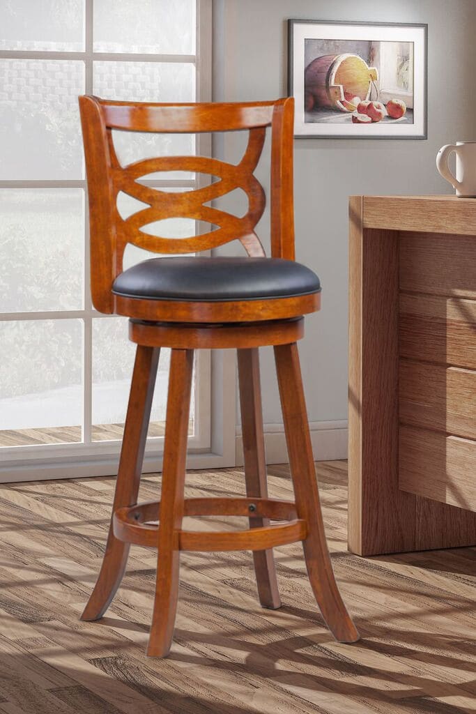 The Boraam Seina Swivel Stool brings home style, comfort, and stability in spades. This traditional stool features a design twist, with interlocking circles on the open backrest creating visual interest. It fits into any traditional or contemporary setting. The stool even comes in color and height options for additional versatility. Craftsmanship meets comfort with the steel ball-bearing swivel plate that frees up your movement and allows you to turn in a full 360-degree range of motion. Leatherette seat upholstery cleans easily with a damp cloth, hiding the high-density foam seat cushion that offers even more comfort. Finally, a full-ring footrest and flared legs provide enhanced stability, along with a double seat apron that adds extra support. Whether you’re using the stool when entertaining guests or enjoying it when you unwind solo, this stool is built to last.