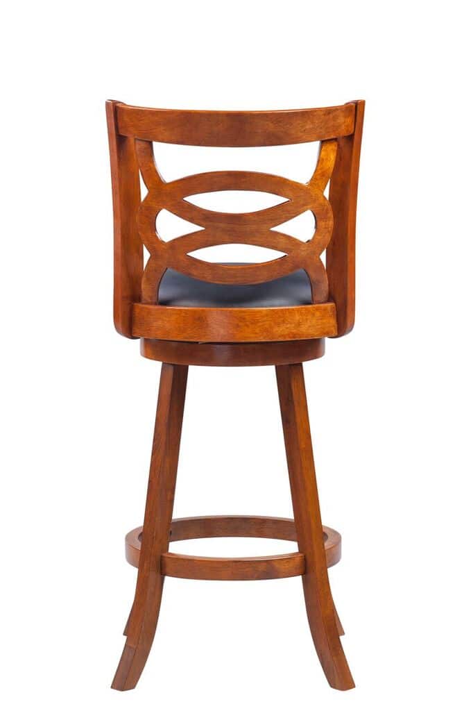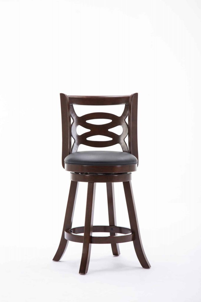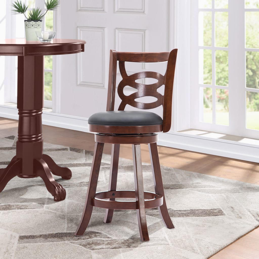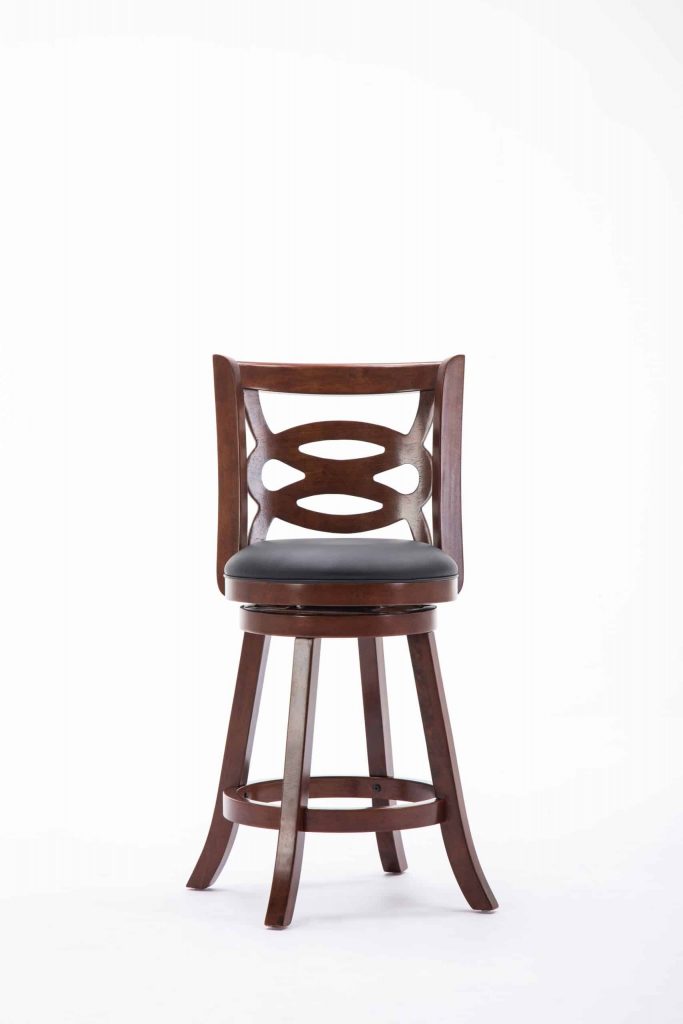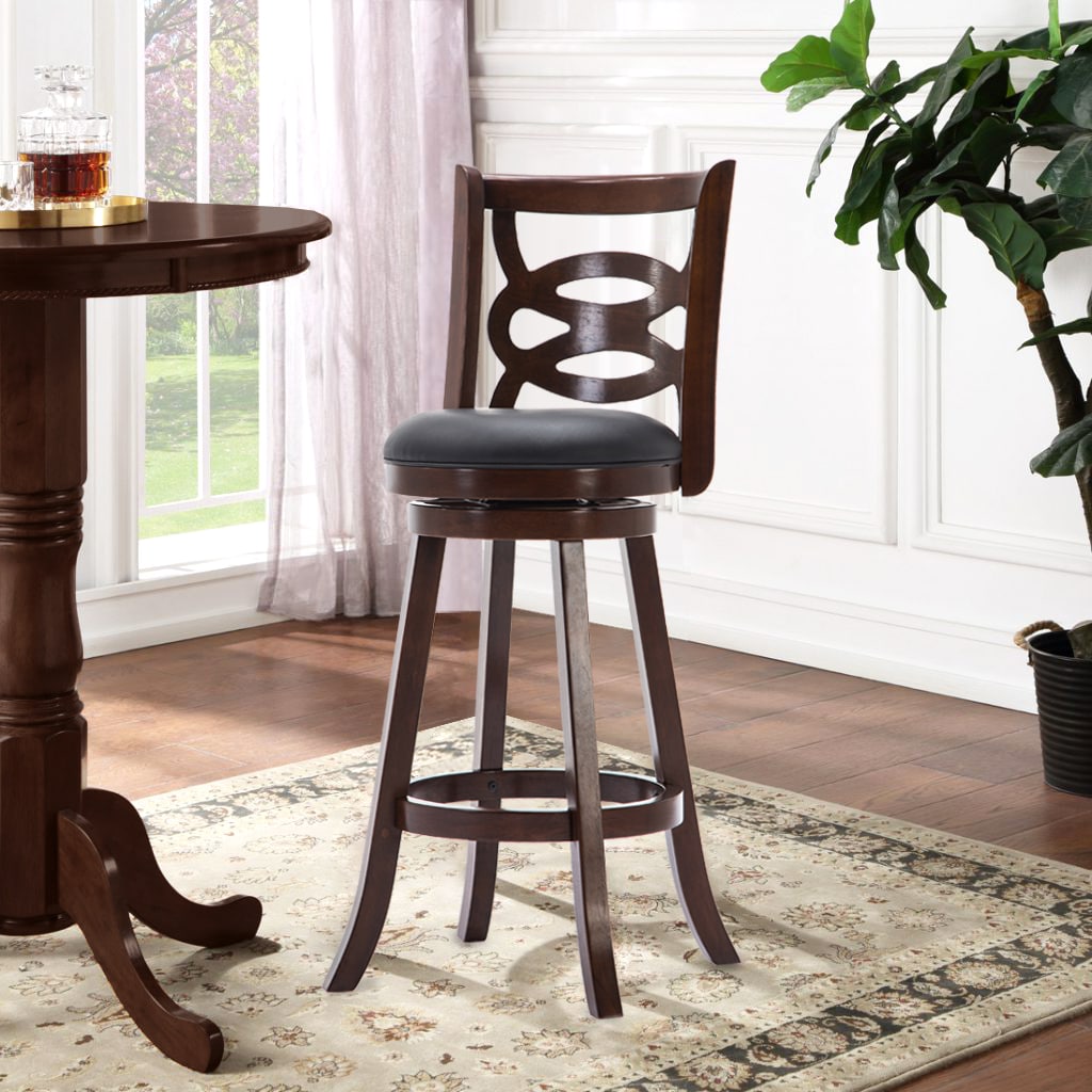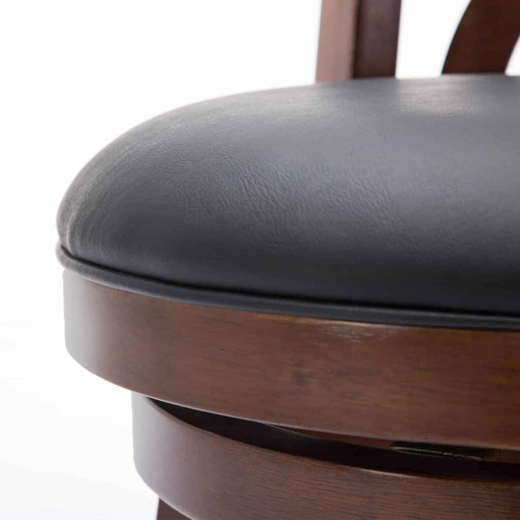 The Boraam Seina Swivel Stool brings home style, comfort, and stability in spades. This traditional stool features a design twist, with interlocking circles on the open backrest creating visual interest. It fits into any traditional or contemporary setting. The stool even comes in color and height options for additional versatility. Craftsmanship meets comfort with the steel ball-bearing swivel plate that frees up your movement and allows you to turn in a full 360-degree range of motion. Leatherette seat upholstery cleans easily with a damp cloth, hiding the high-density foam seat cushion that offers even more comfort. Finally, a full-ring footrest and flared legs provide enhanced stability, along with a double seat apron that adds extra support. Whether you’re using the stool when entertaining guests or enjoying it when you unwind solo, this stool is built to last.