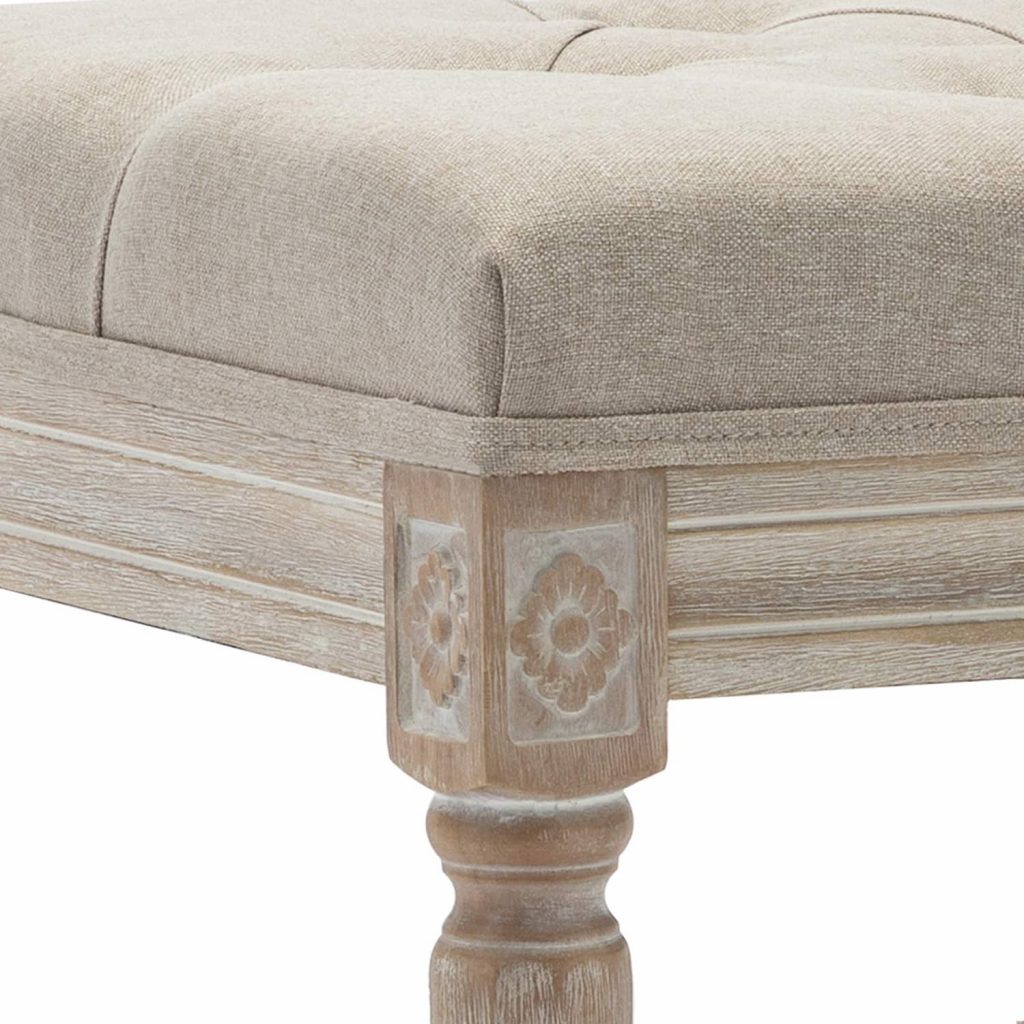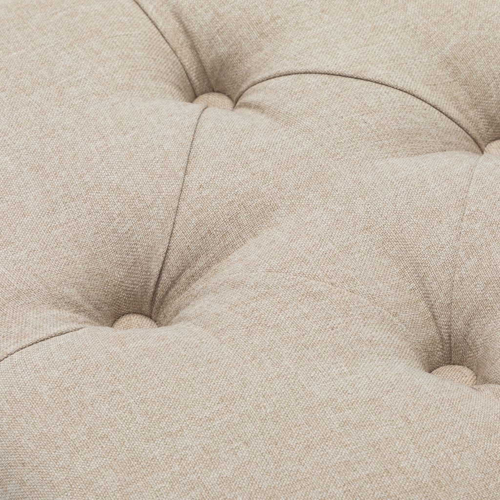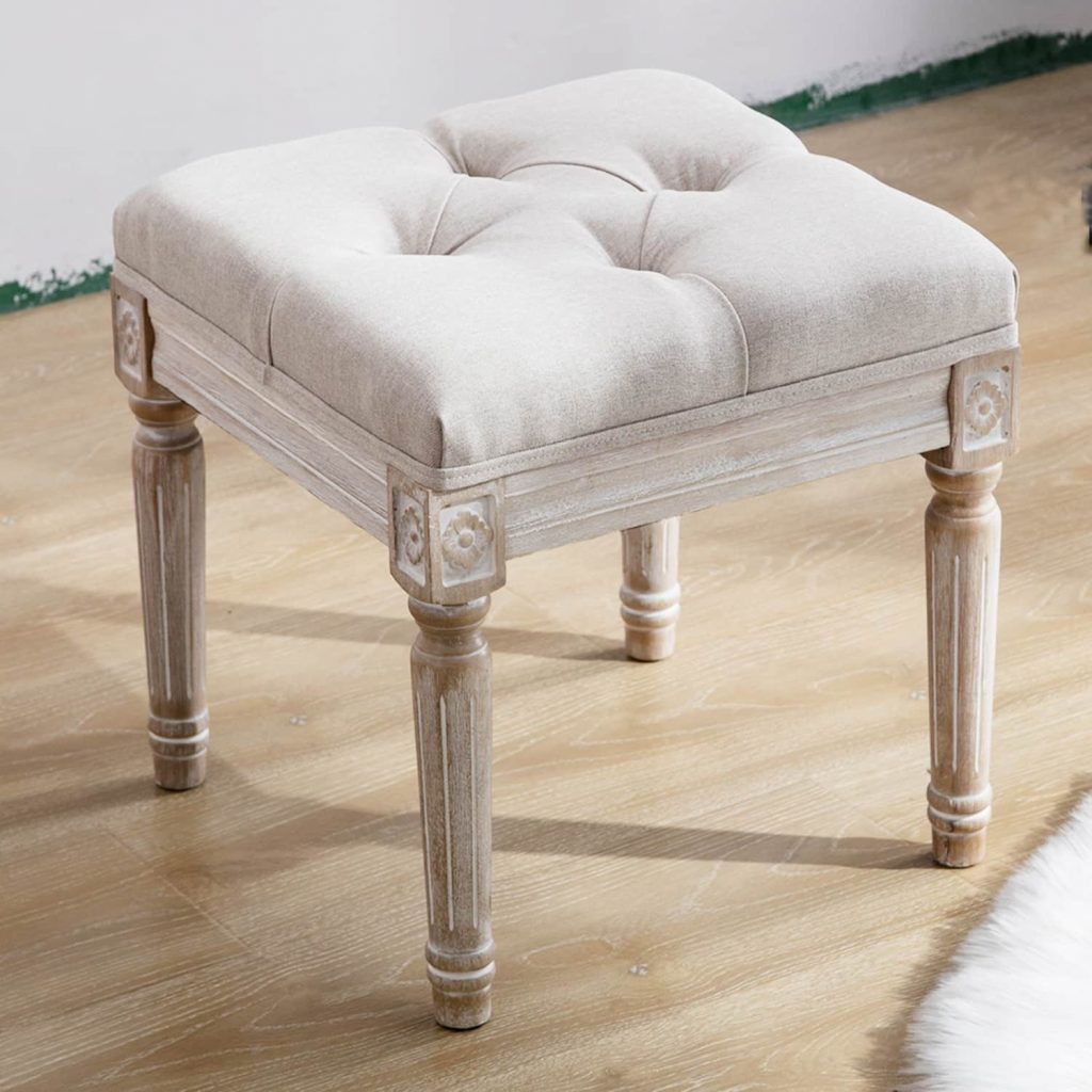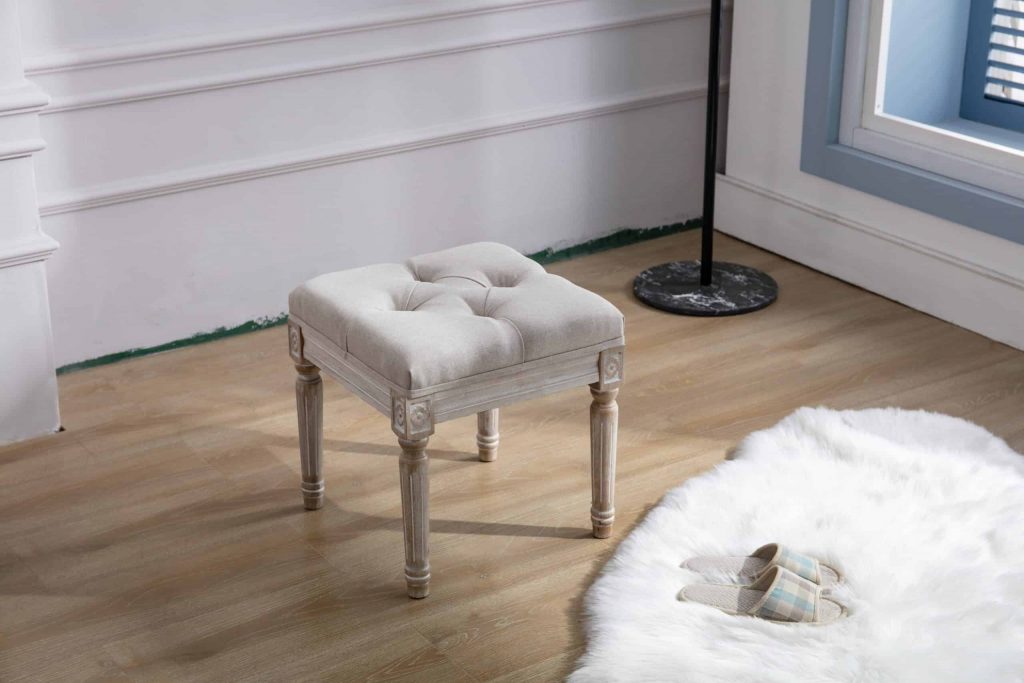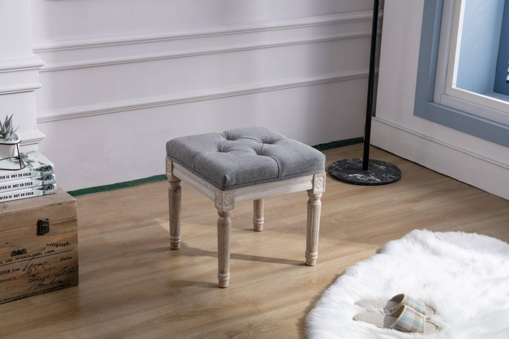 Square tufted footrest brings a nice touch into your living room and to pair with your furniture. Available in two finishes; gray and taupe. The bases for these stools are a natural wood color. These are constructed with rubber wood, PU sponge, and polyester. Only the seat is tufted and padded. Some assembly required.