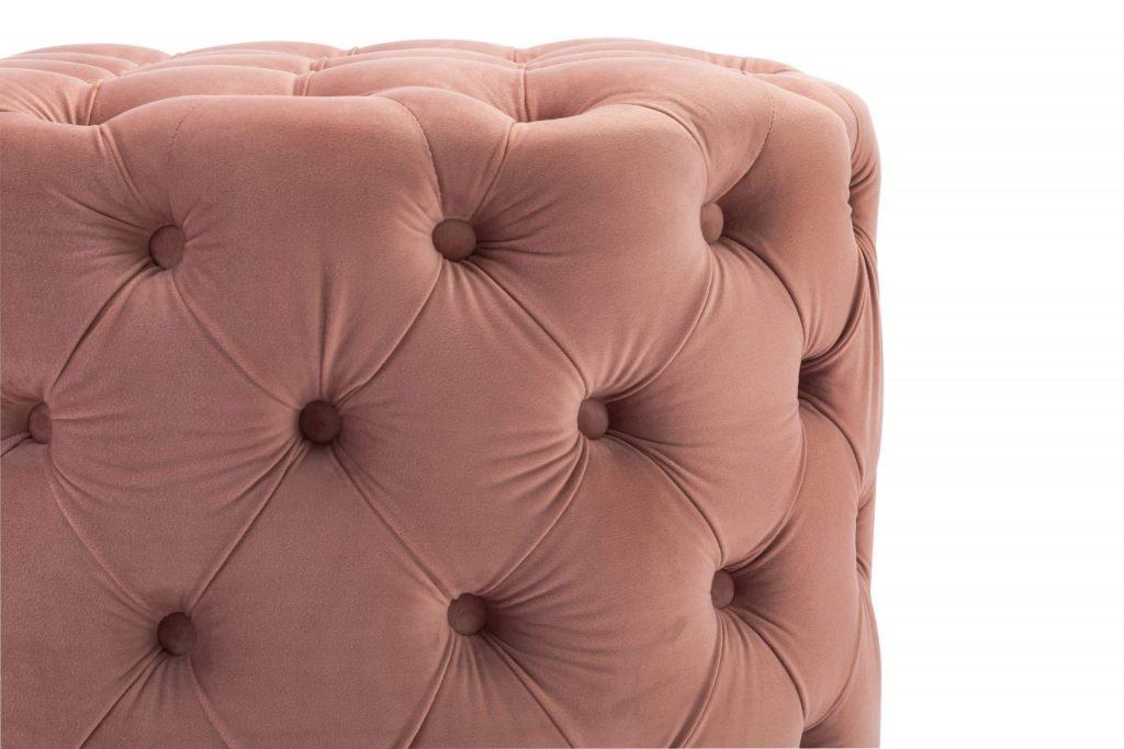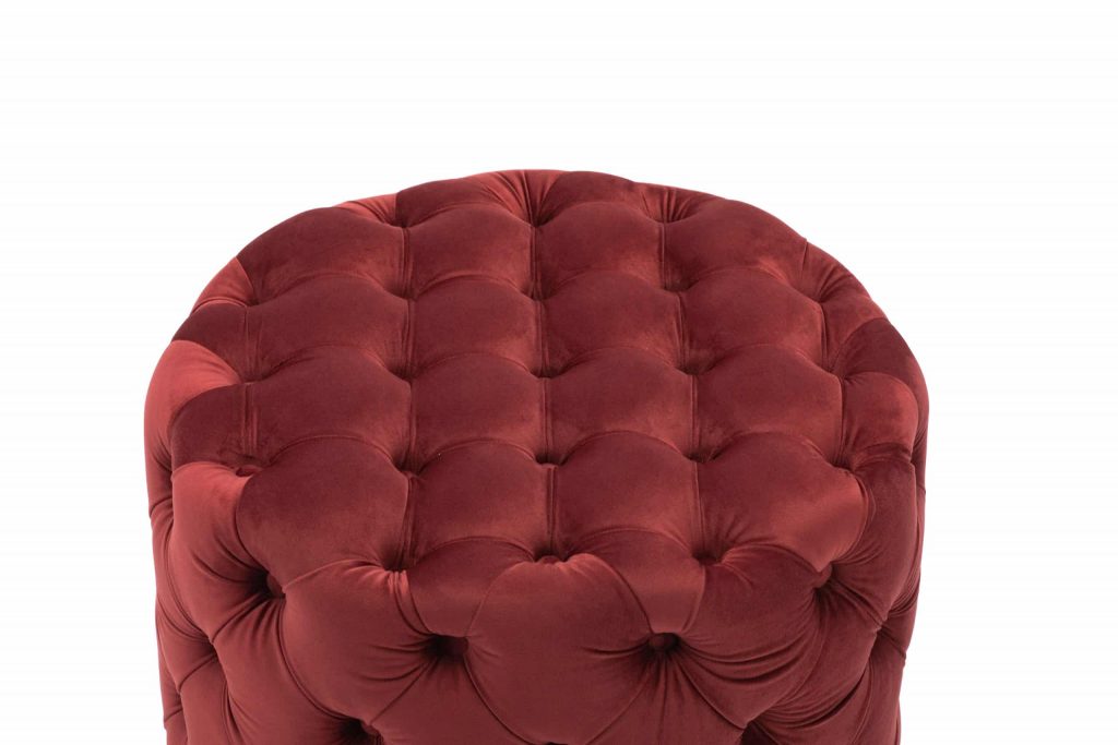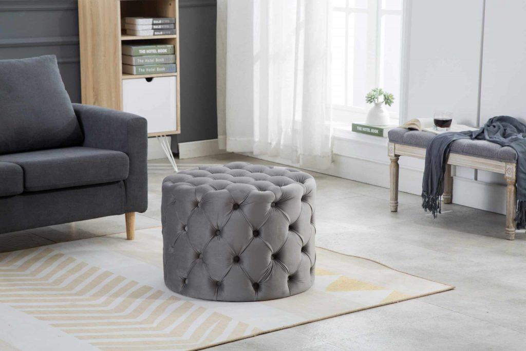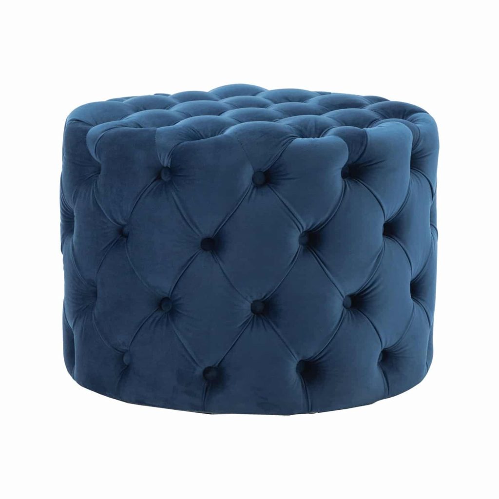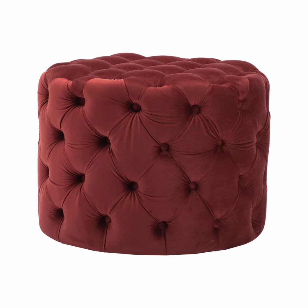 This Tufted Ottoman is available in four finishes; blue, gray, pink, and red. It is constructed with flannel and sponge. It is tufted all around the ottoman, and has perfect padding to sit on or rest your feet up on after a long day. There is no assembly required.