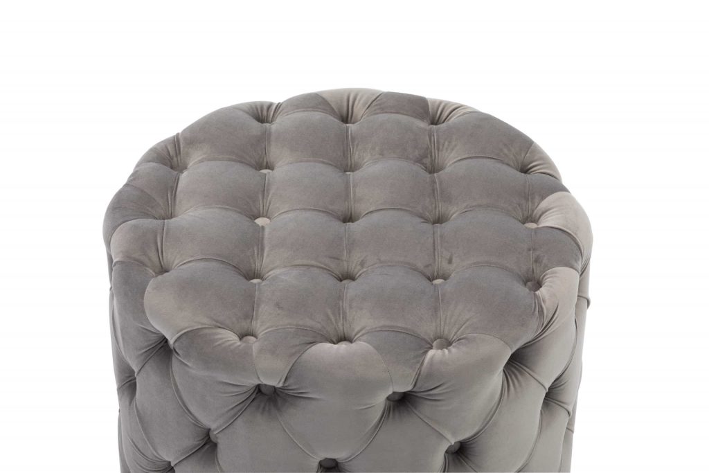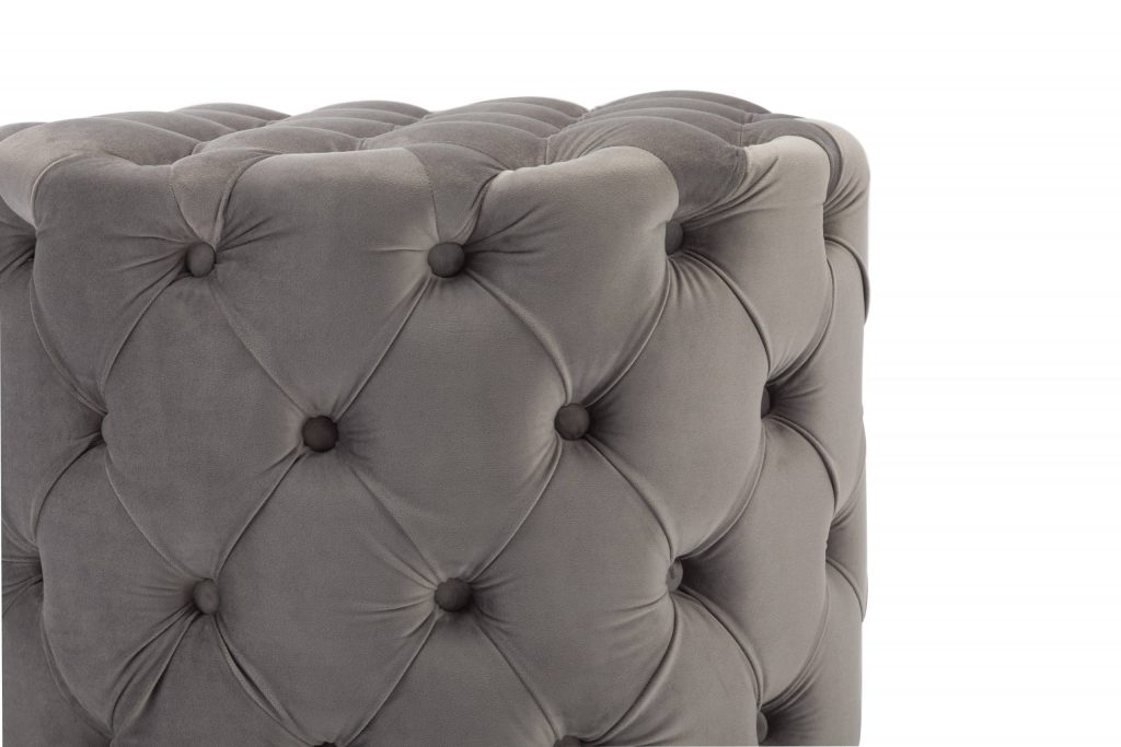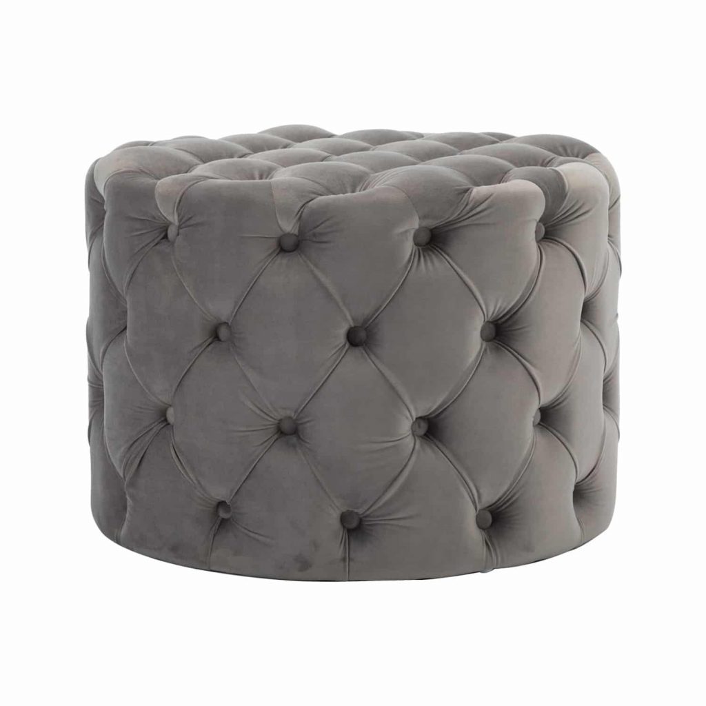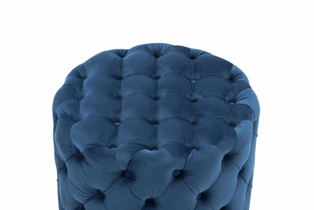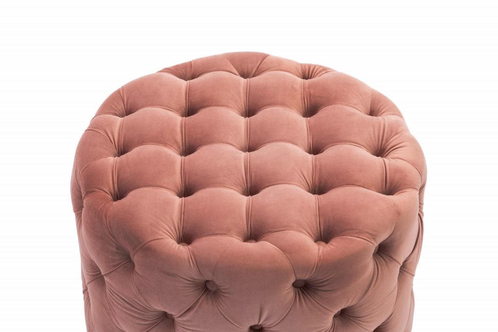 This Tufted Ottoman is available in four finishes; blue, gray, pink, and red. It is constructed with flannel and sponge. It is tufted all around the ottoman, and has perfect padding to sit on or rest your feet up on after a long day. There is no assembly required.