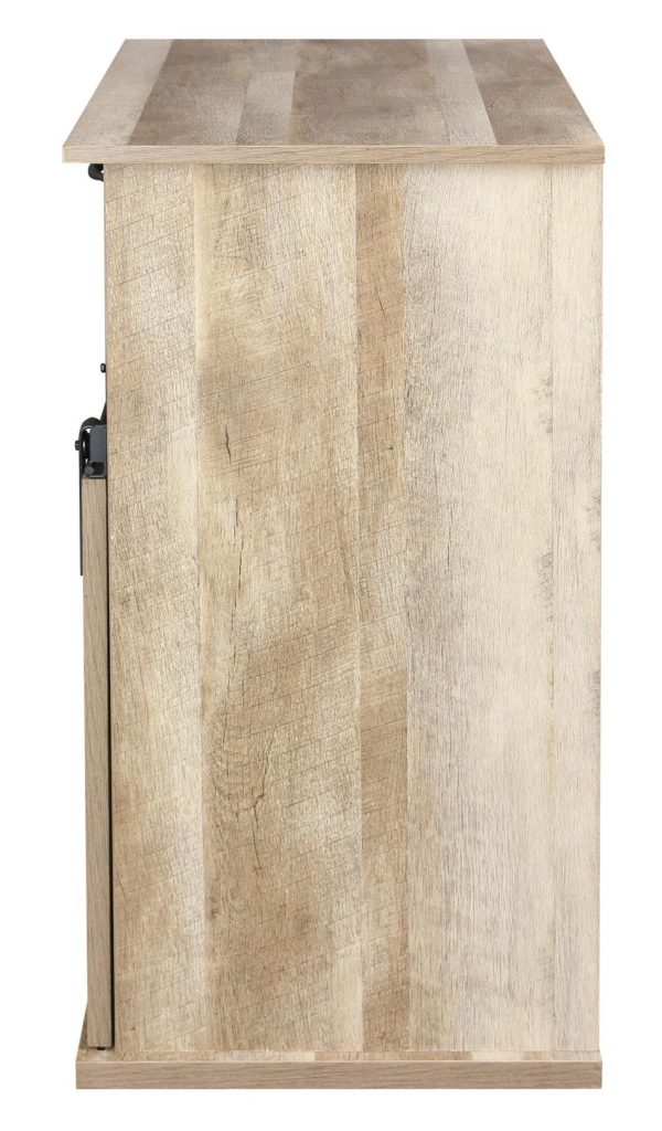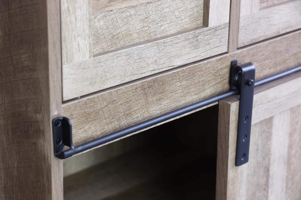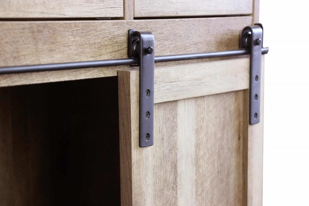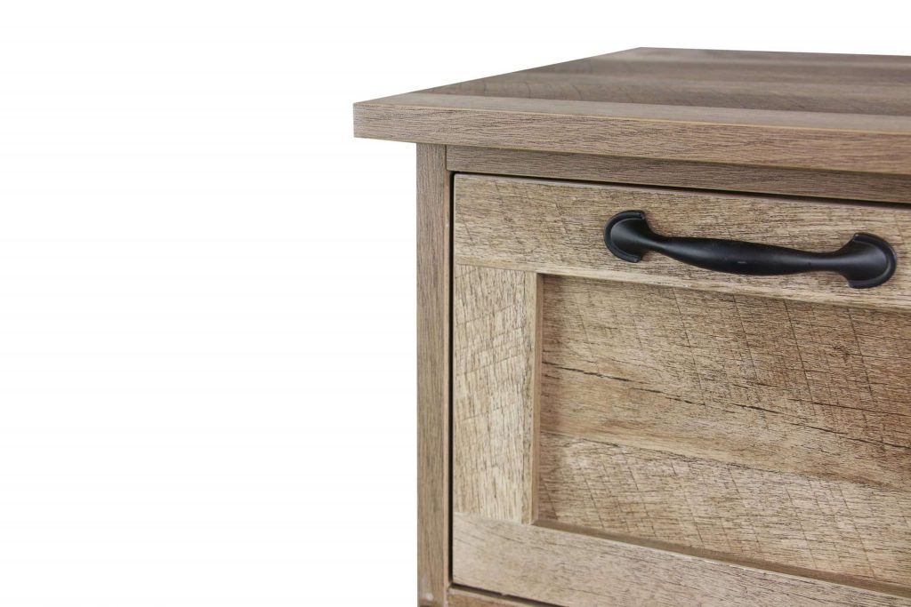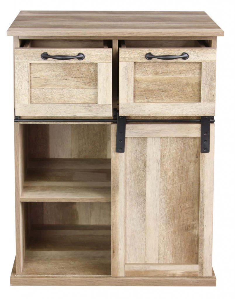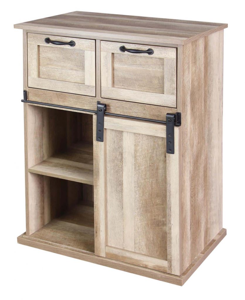 This cabinet is constructed with MDF, chipboard, and iron. It is available in a natural finish. There are two drawers at the top and a sliding door with a shelf inside at the bottom. Ready to assemble upon delivery. Comes out of China.