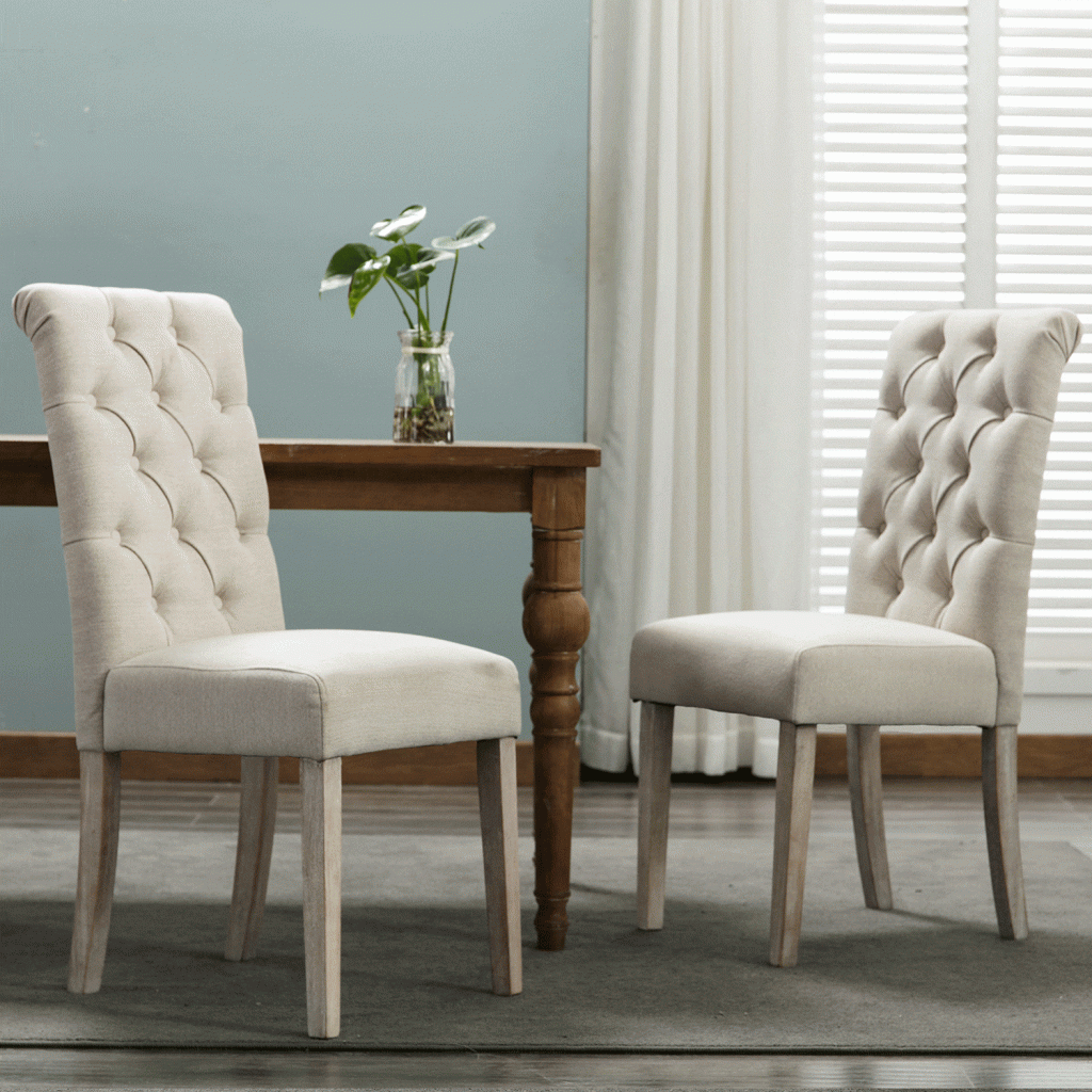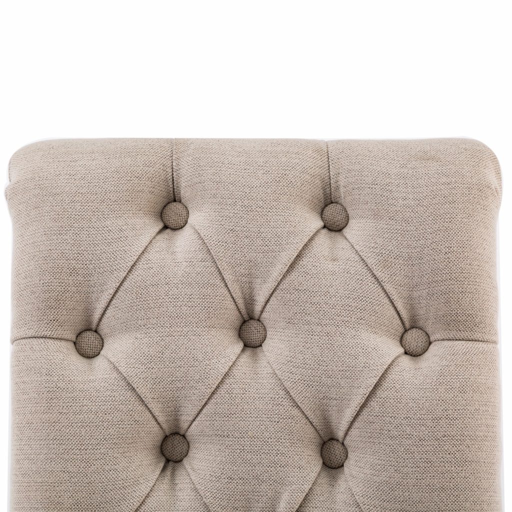Available in two finishes; beige and gray. Comes as a set of 2. Upholstered and tufted backrest. Made with rubberwood and polyester.