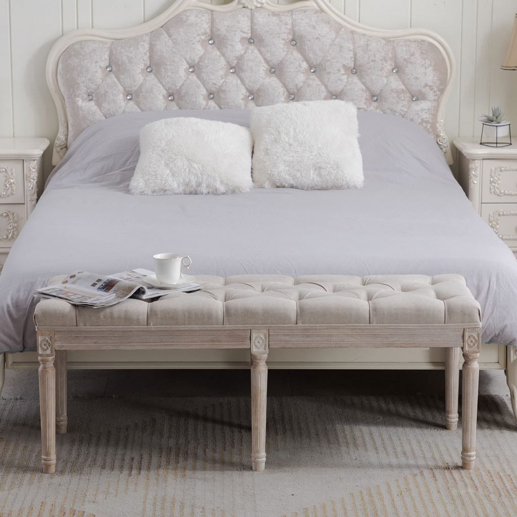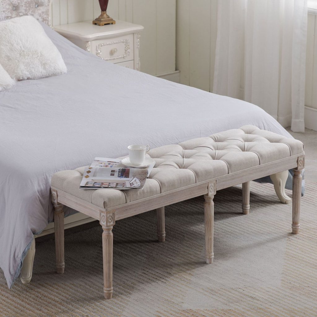Comes in two finished; gray and beige. Made with Rubber Wood, Polyurethane sponge and Polyester. Dining height bench.