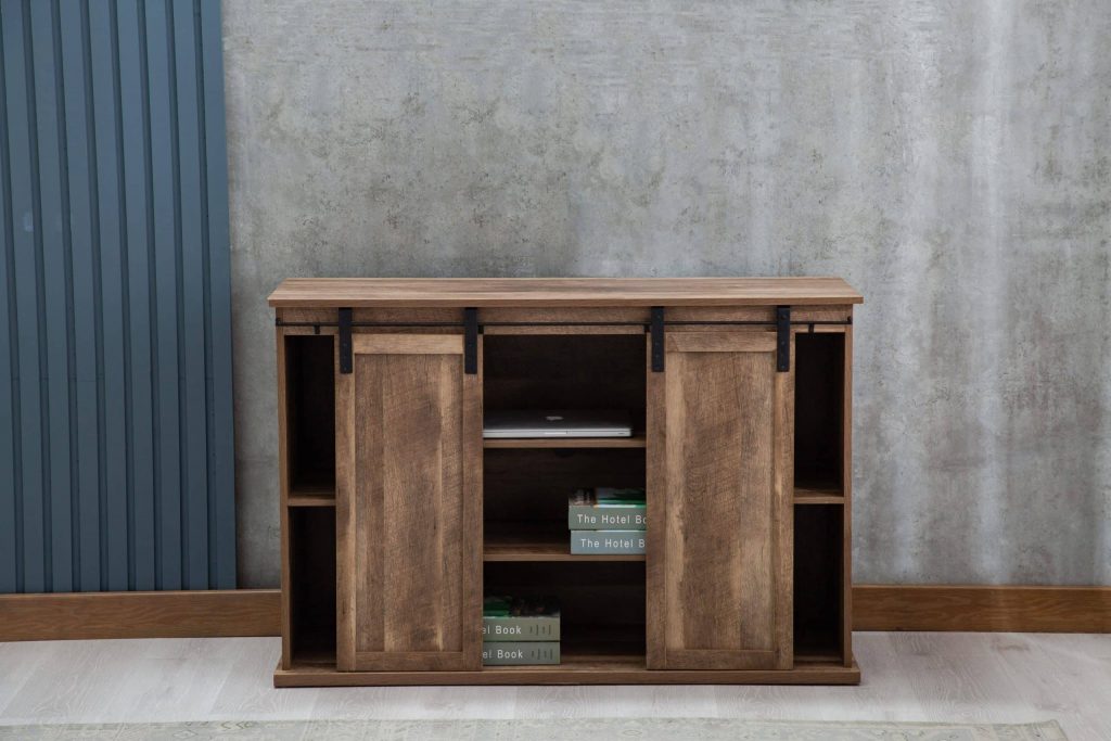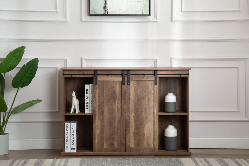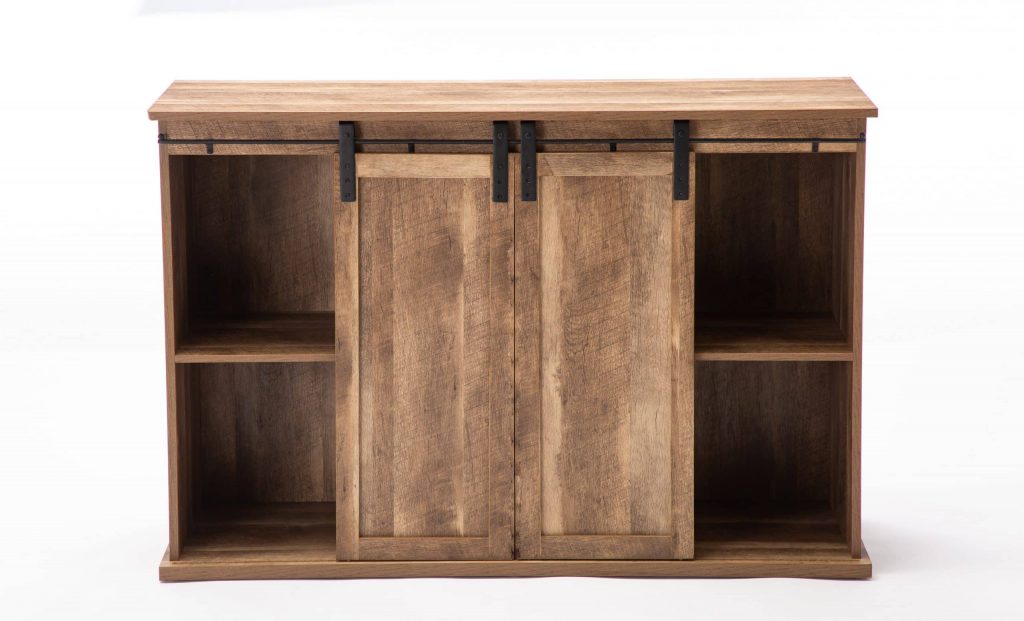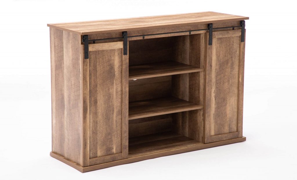 Bring farmhouse-inspired charm to your living room or family room with the Weston Sliding Barn Door Media Cabinet. Use it to organize all your media essentials in one place. The quaint sliding doors cover several shelves, plus there are multiple open shelves, so you won’t run out of storage space. The Weston comes with a built-in wire management cutout, so you can feeds cords from your television, game console, or other electronics through it. This media cabinet is made from a combination of chipboard, medium density fiberboard, and iron. It arrives ready to assemble.