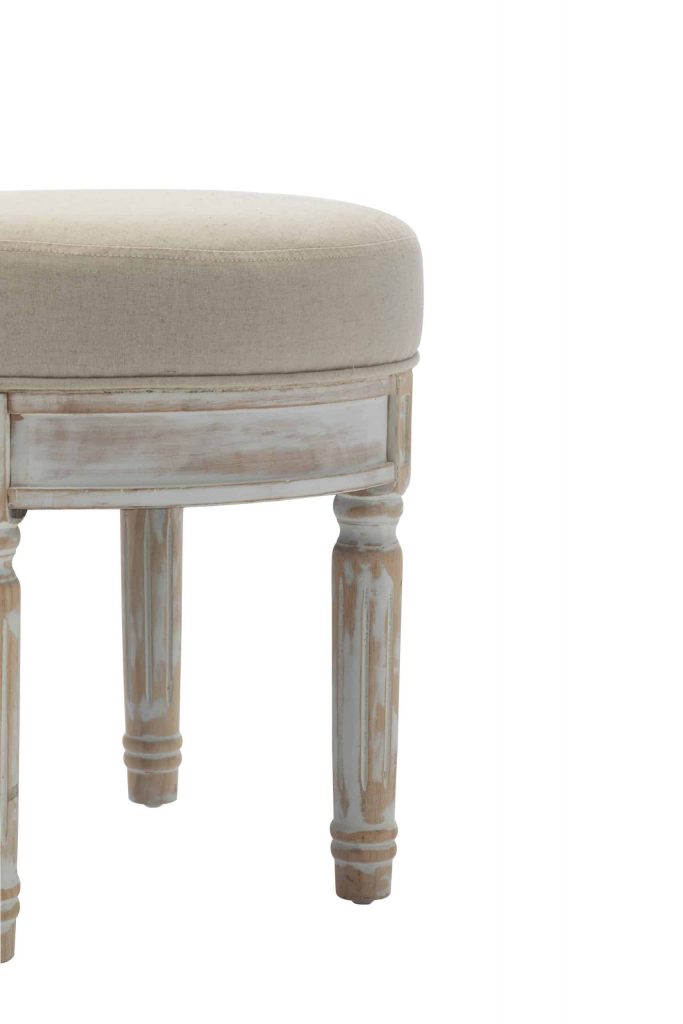 Dynamic footrest that can be used in different areas around the house. The base is a white wash finish with a taupe padded seat. Constructed with rubber wood, PU sponge, and polyester.