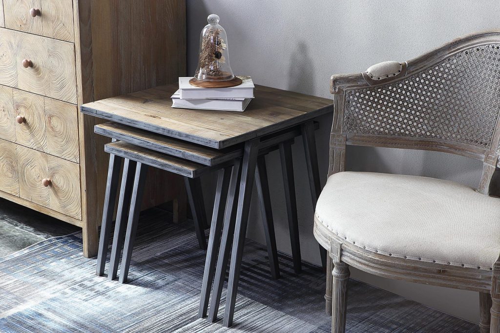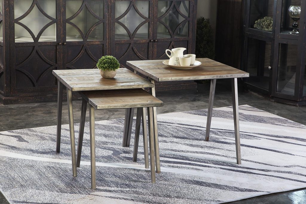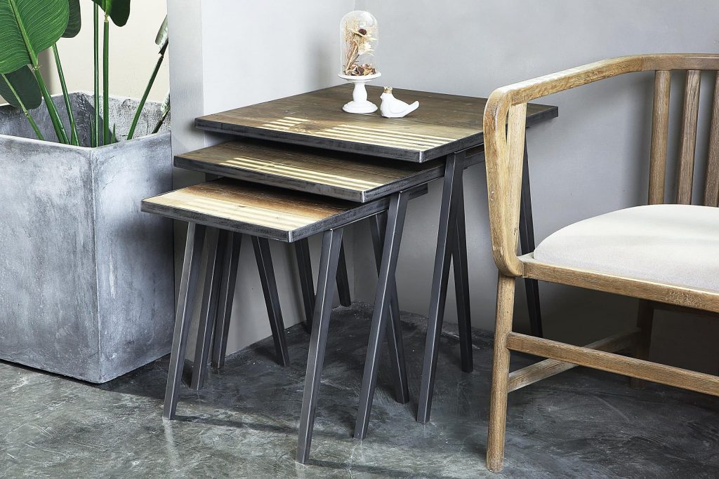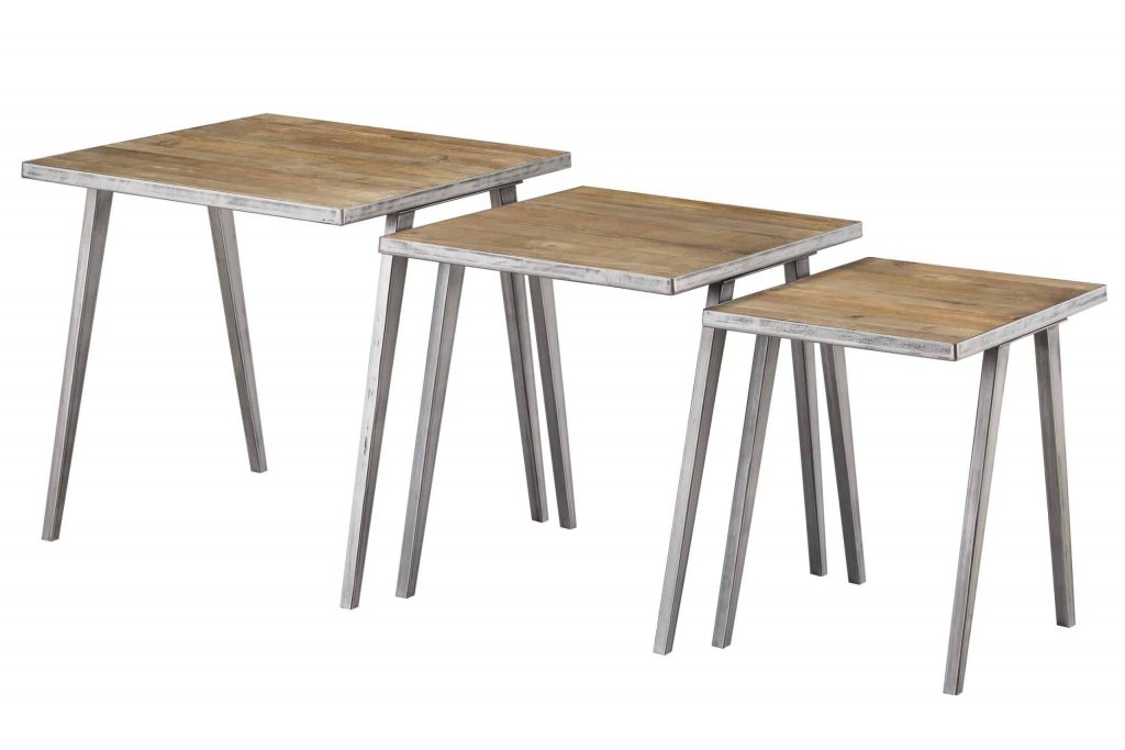 3 Piece Nesting Table set is constructed mixed woods and metal. The woods used are fir, elm, and pine wood. The wood is used as the table top for each, and the metal used is the legs. Indoor use only. Ready for assembly upon delivery. Comes out of Ningbo, China.