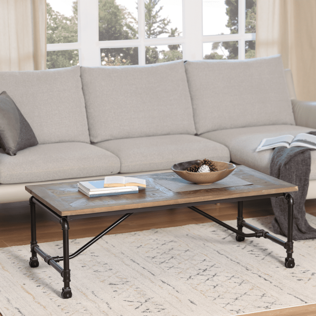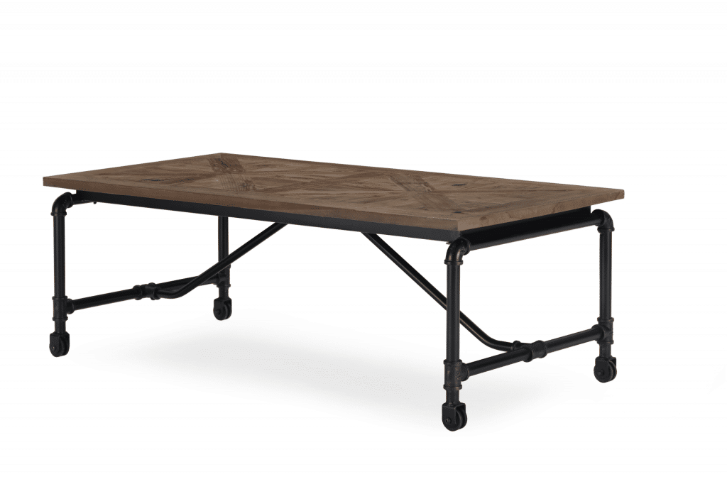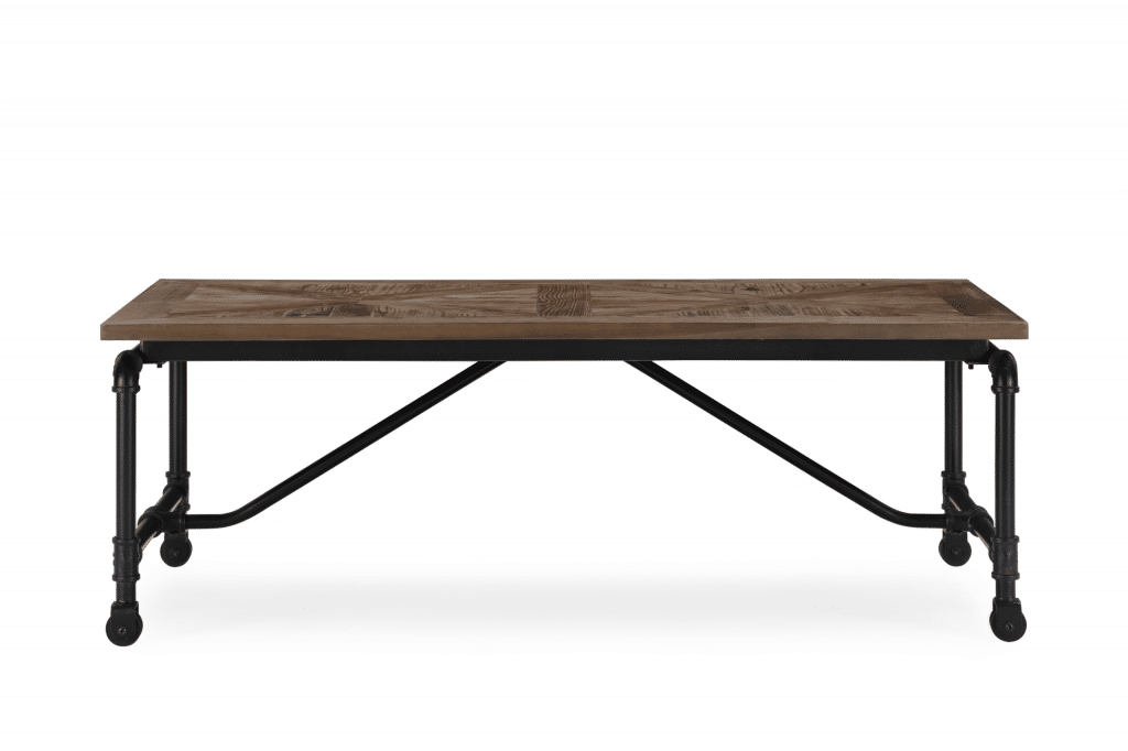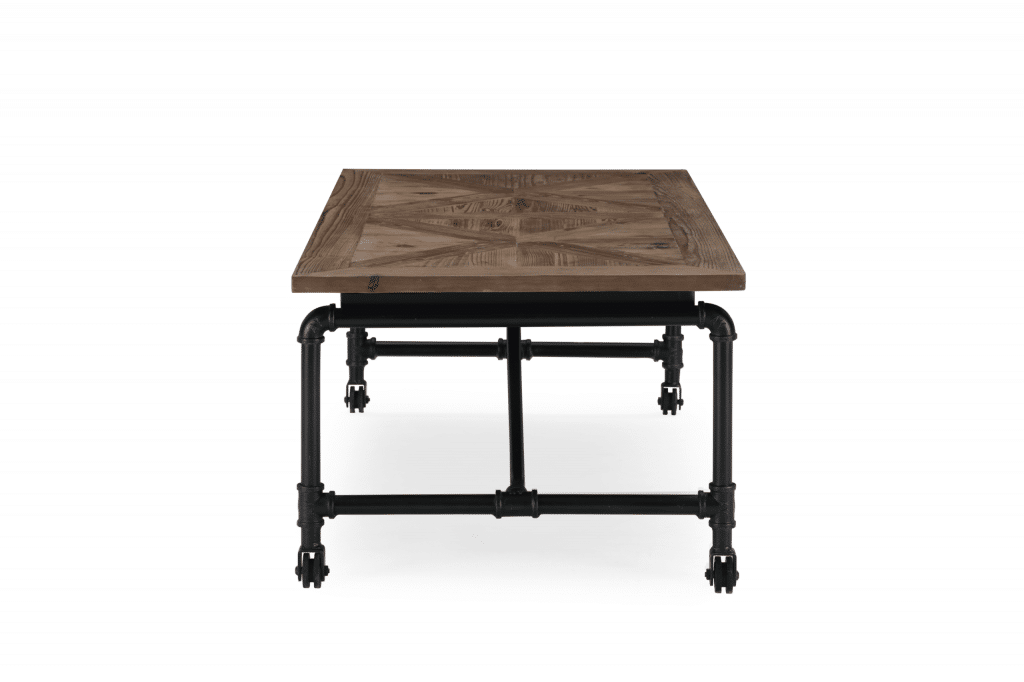 The Barrow Coffee Table manages to take everything you love about industrial style and package it together in one inviting design. Seamlessly combining mixed materials? Check. Reclaimed wood with beautiful inlaid design? Check. Metal accents? Check. This coffee table takes elements like stainless steel industrial pipes and manages to make them look inviting – without erasing any of the subtle edge of the design. Caster wheels on the base complete the table, so you can easily move it around your living room as needed.