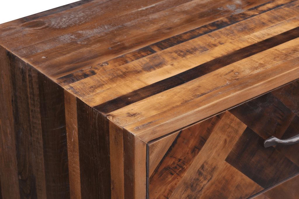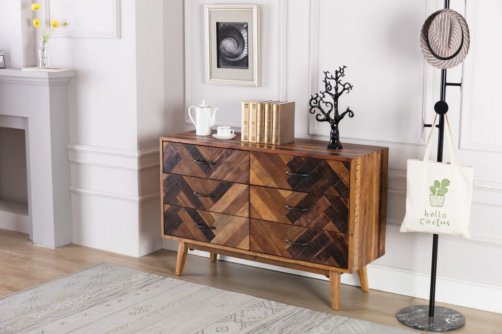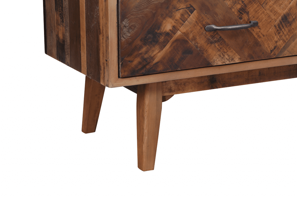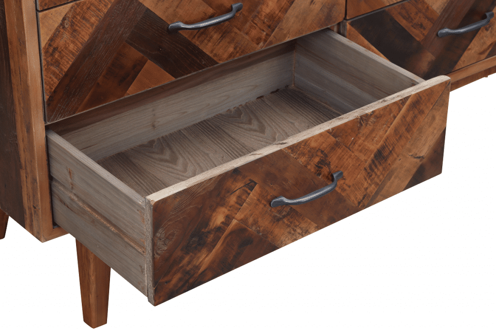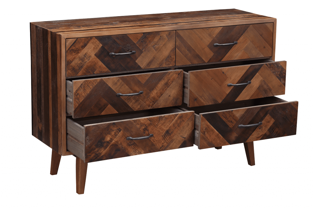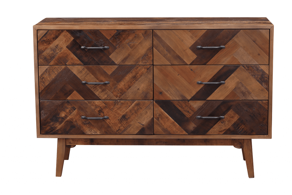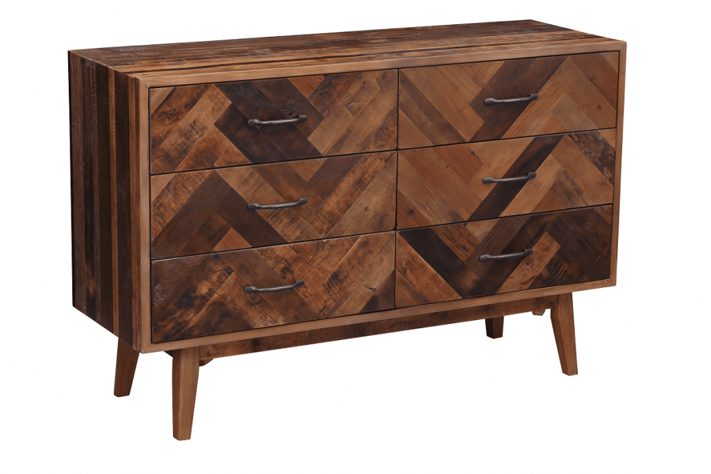 The Benton Dresser from Burnham Home brings your bedroom mid-century design reimagined for the modern age. Its oak wood body uses a mix of dark and natural stains, creating a rich array of tones. The inlaid chevron pattern on the front is eye-catching. Four angled legs flare outward for an additional mid-mod touch. Six drawers provide plenty of room for storing all your sweaters, trousers, t-shirts, and other clothing. Or get creative and use this piece as a credenza in a dining room instead. However you use it, be sure to pair it with the matching Benton Nightstand!