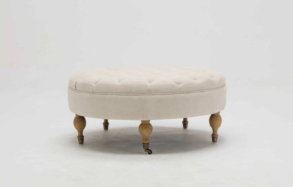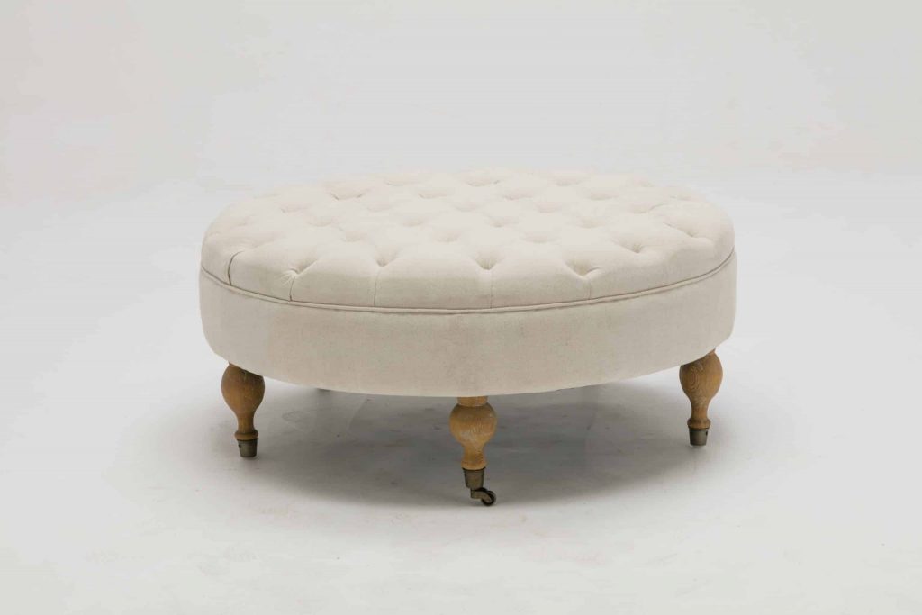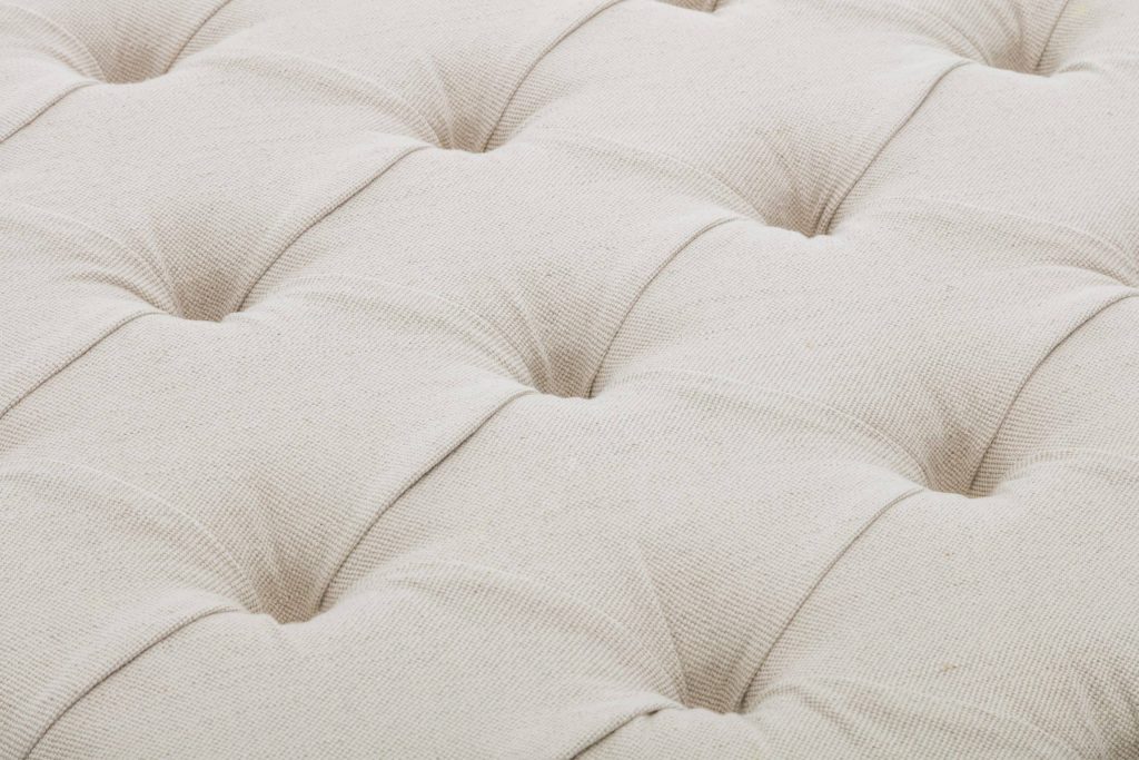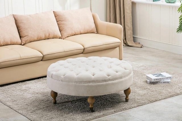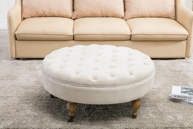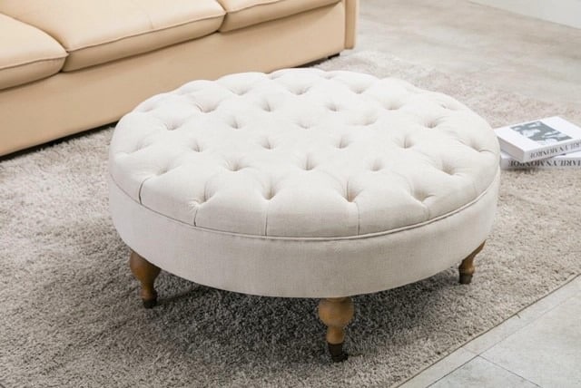 The Brenda Coffee Table is an elegant, traditional addition to any living room. Its solid wood frame and five wooden legs provide support and durability. Neutral ivory fabric and oak-finished legs ensure styling ease and versatility in any space. The tufted linen top is lightly padded, so you can use this coffee table as a makeshift ottoman if you wish.