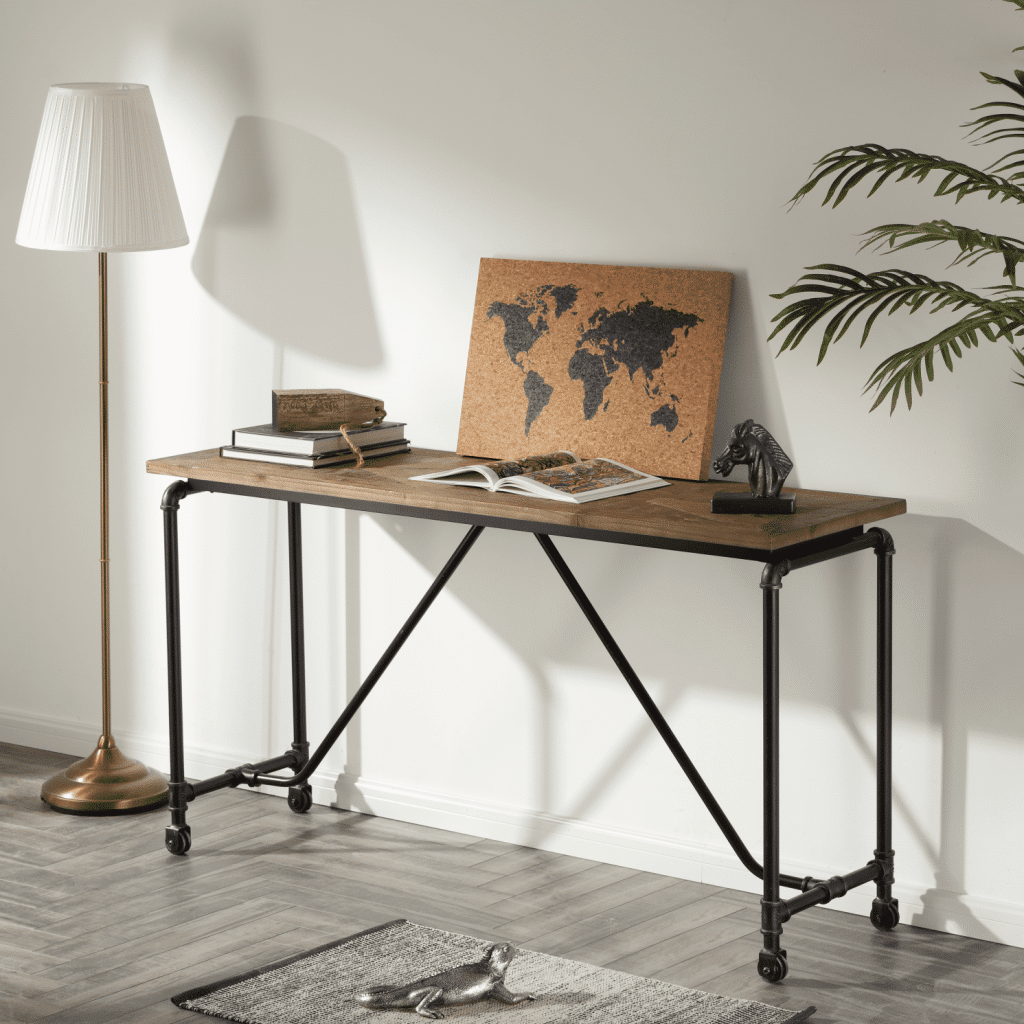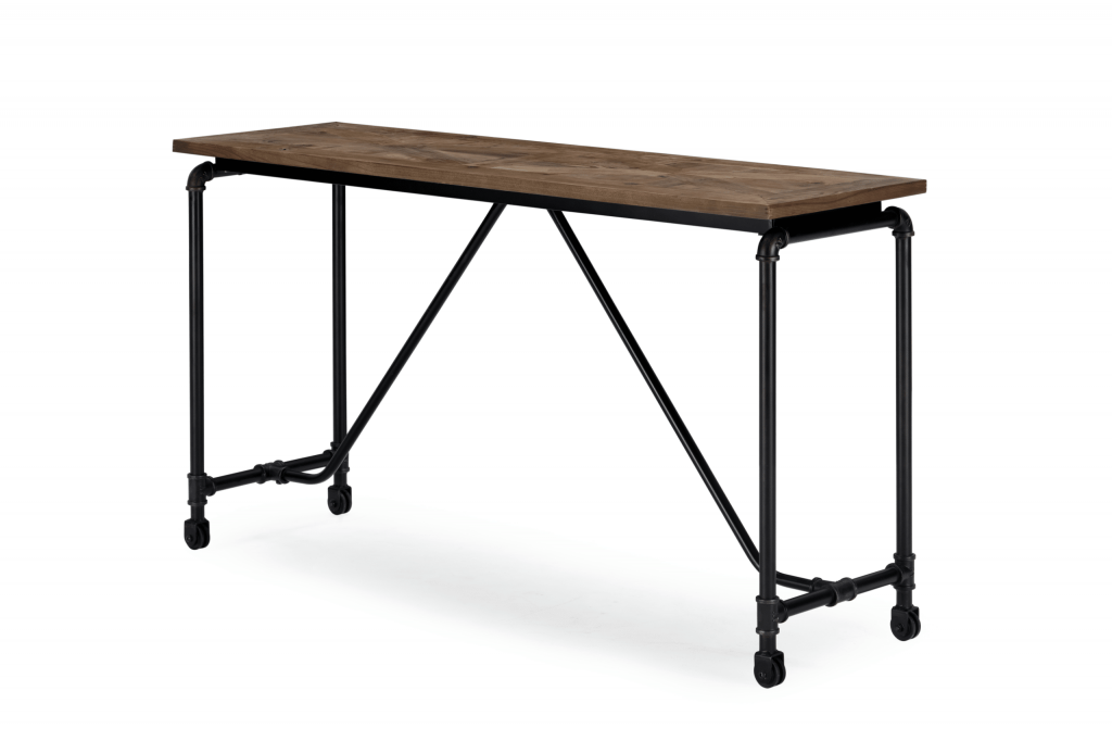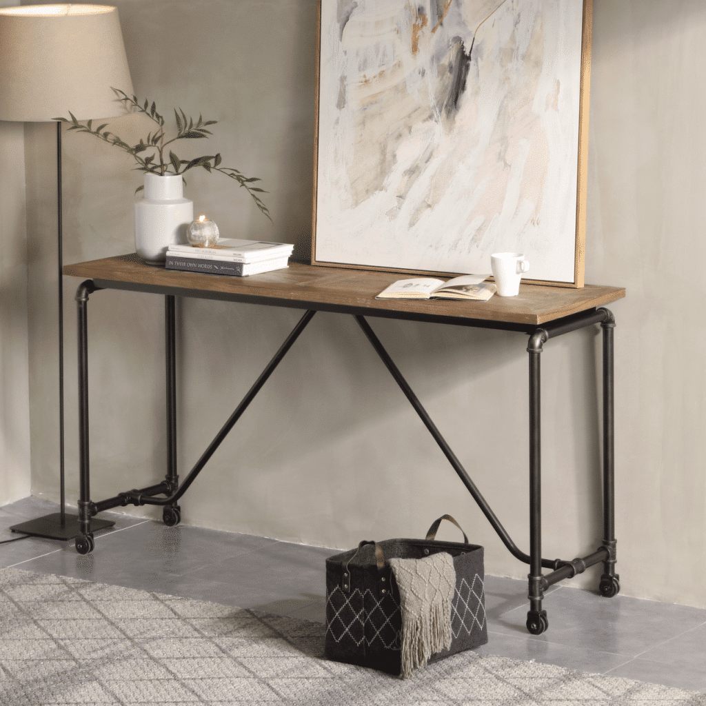 Give your entryway or living room a bold design accent with the Cordelia Console Table. This occasional table blends industrial factory elements with rustic touches. The natural finish of the reclaimed wood top is the perfect complement to the stainless steel industrial pipes on the base of the frame. Four rolling caster wheels guarantee mobility, so you can easily wheel this table from the hallway to the living room if you want to switch up the look of your home in a snap.