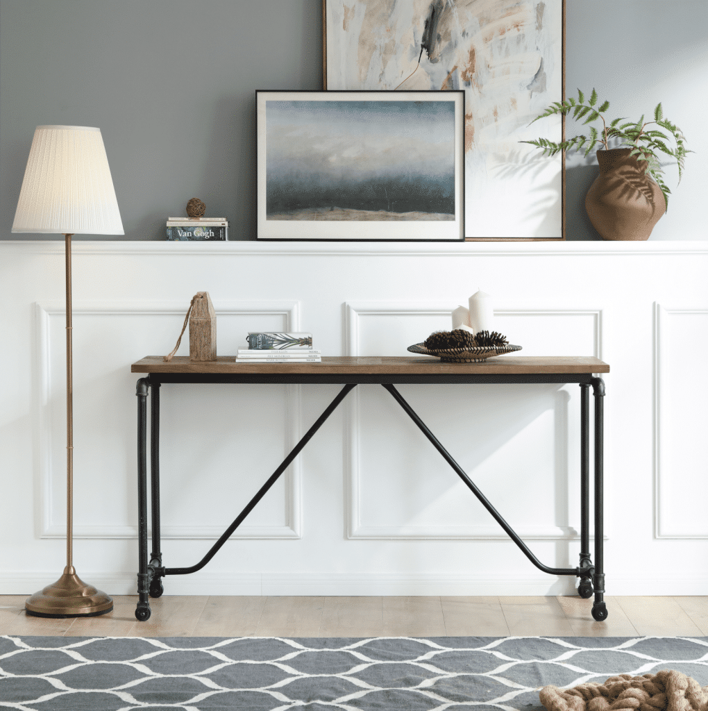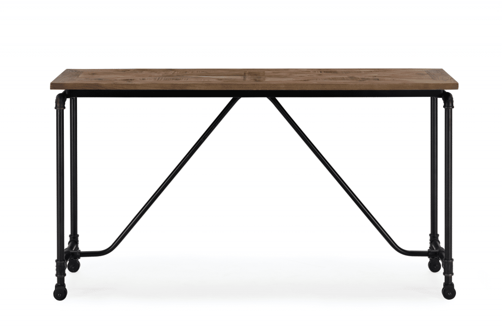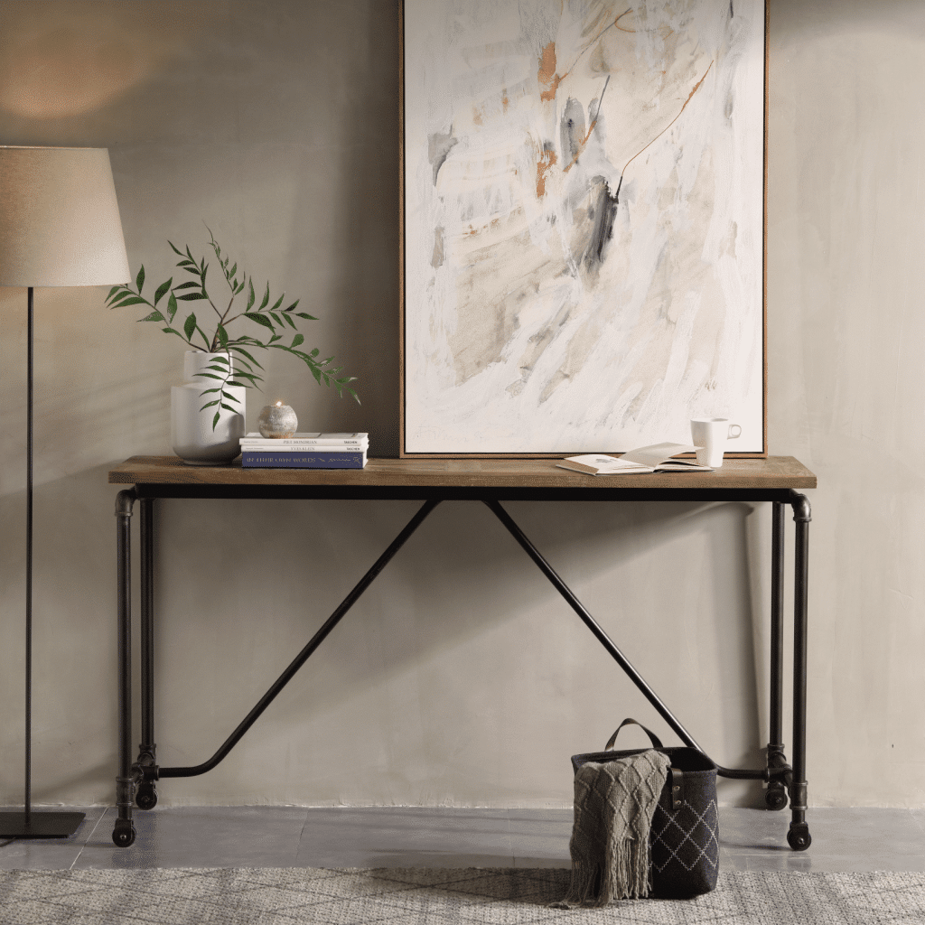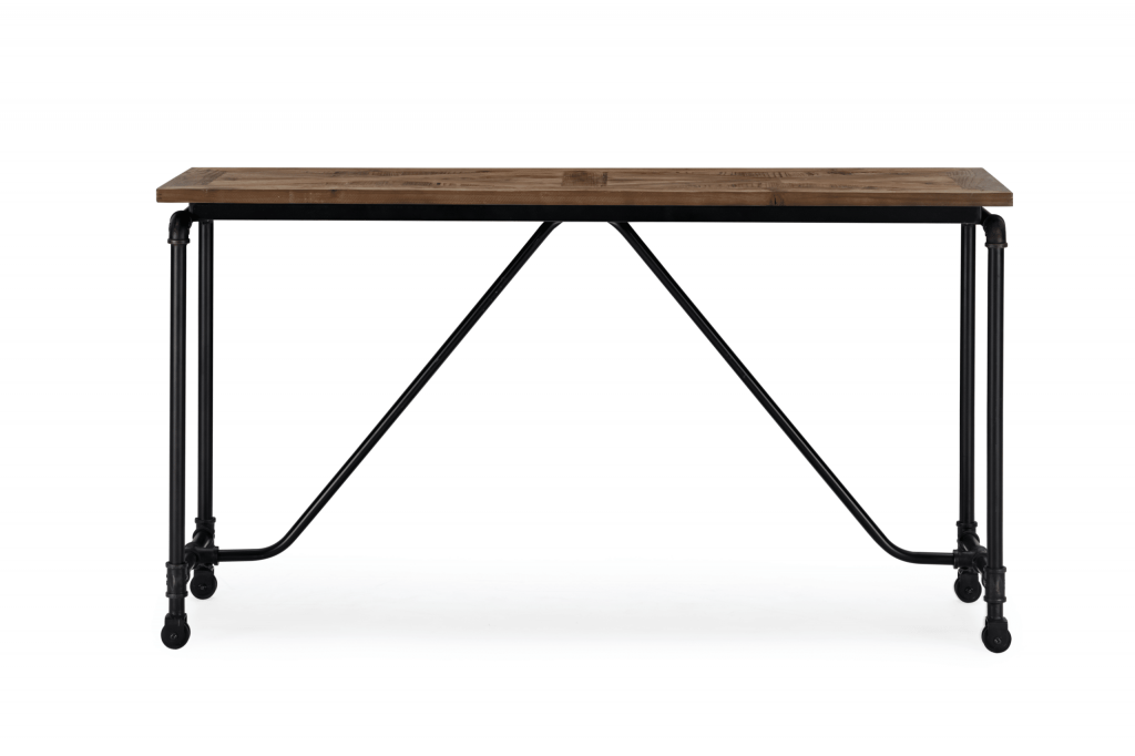 Give your entryway or living room a bold design accent with the Cordelia Console Table. This occasional table blends industrial factory elements with rustic touches. The natural finish of the reclaimed wood top is the perfect complement to the stainless steel industrial pipes on the base of the frame. Four rolling caster wheels guarantee mobility, so you can easily wheel this table from the hallway to the living room if you want to switch up the look of your home in a snap.