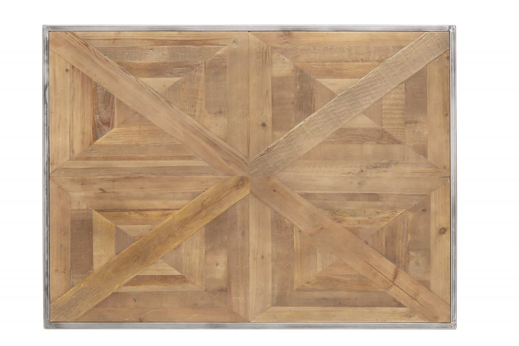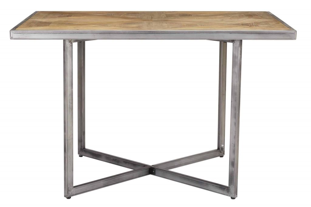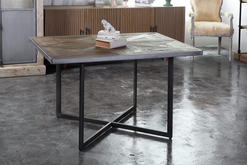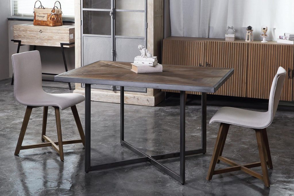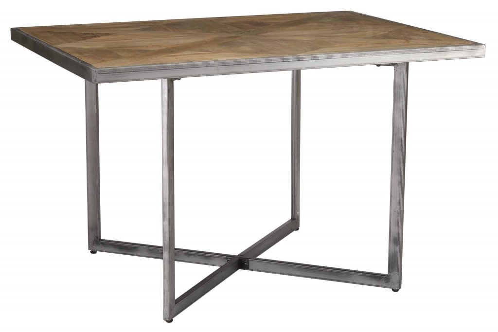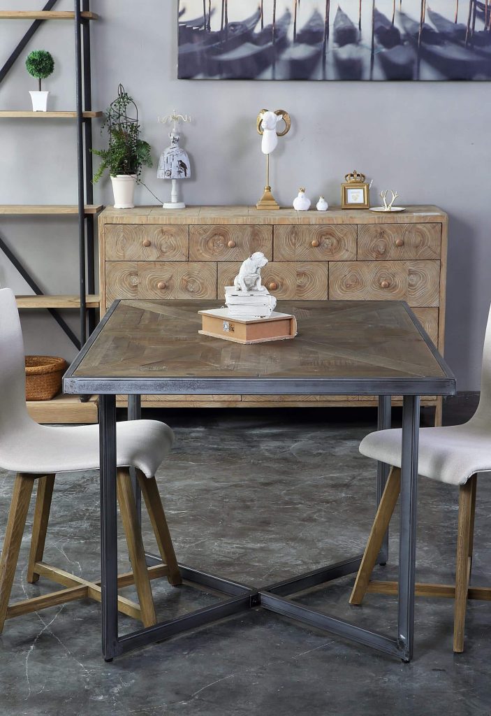 Dining table that is constructed with mixed woods and metal. The woods used are fir, pine, and elm wood. The base is constructed with metal. It is in the shape of a rectangle and is used for indoor use only. Comes out of Ningbo, China.