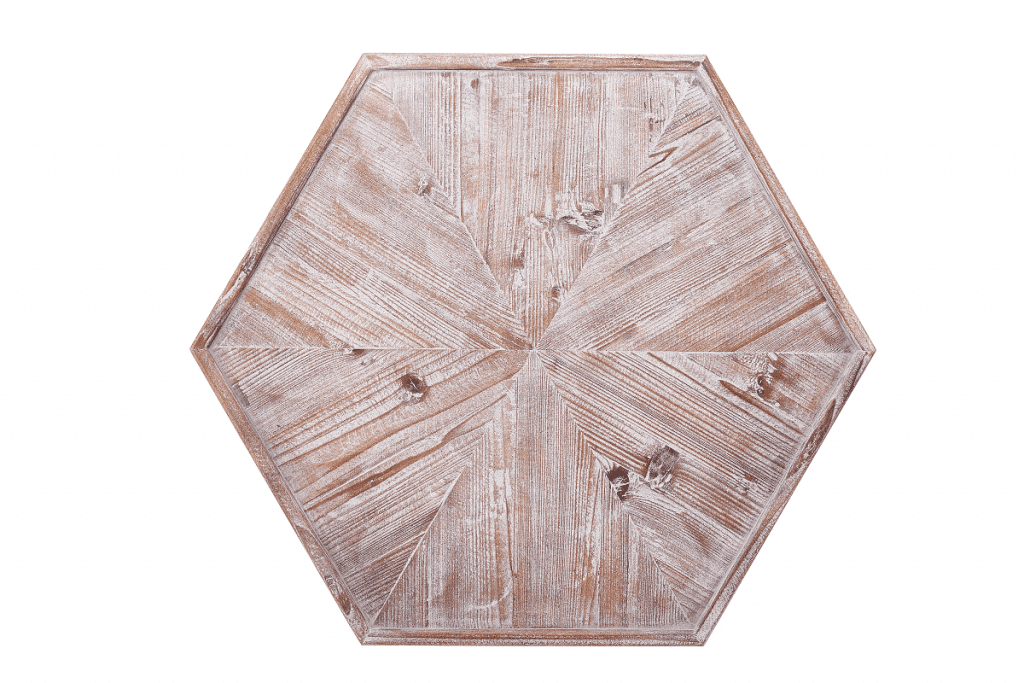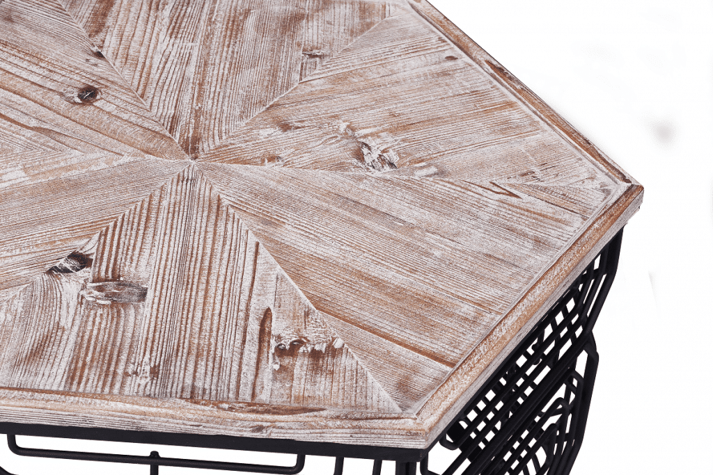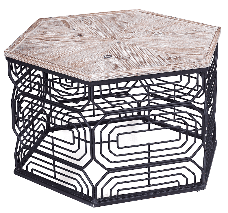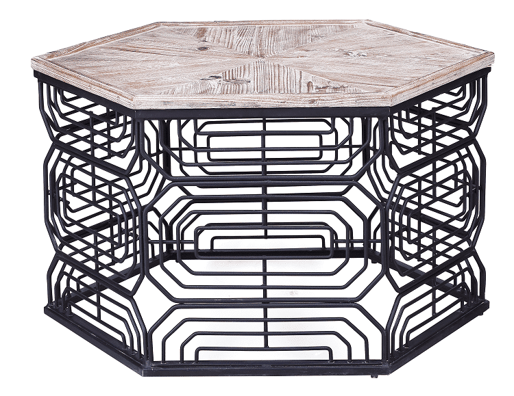 Burnham Home Designs presents the Emma Coffee Table. It is constructed with a metal base and a reclaimed pine wood top. The reclaimed pine is a beautiful natural gray color. The Emma Coffee Table is in a hexagonal shape. The unique designs on the base is what makes it stand out from other tables. It comes fully assembled upon delivery.